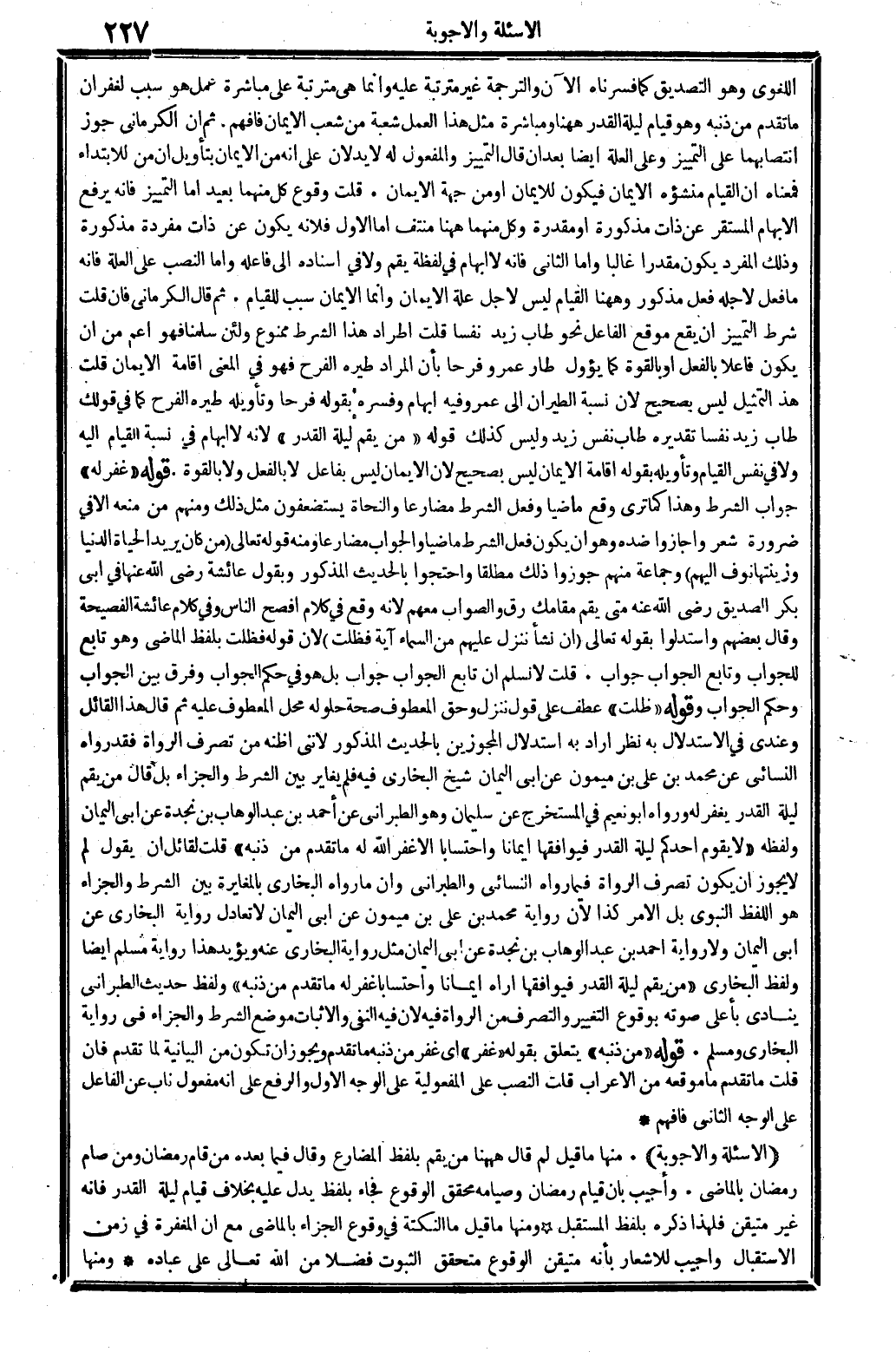 الأسئلة والأجوبة: مِنْهَا مَا قيل: لِمَ قَالَ هَهُنَا: من يقم، بِلَفْظ الْمُضَارع، وَقَالَ فِيمَا بعده: من قَامَ رَمَضَان وَمن صَامَ رَمَضَان، بالماضي؟ وَأجِيب: بِأَن قيام رَمَضَان وصيامه مُحَقّق الْوُقُوع، فجَاء بِلَفْظ يدل عَلَيْهِ بِخِلَاف قيام لَيْلَة الْقدر، فَإِنَّهُ غير مُتَيَقن، فَلهَذَا ذكره بِلَفْظ الْمُسْتَقْبل. وَمِنْهَا مَا قيل: مَا النُّكْتَة فِي وُقُوع الْجَزَاء بالماضي مَعَ أَن الْمَغْفِرَة فِي زمن الِاسْتِقْبَال؟ وَأجِيب: للإشعار بِأَنَّهُ مُتَيَقن الْوُقُوع مُتَحَقق الثُّبُوت، فضلا من الله تَعَالَى على عباده. وَمِنْهَا