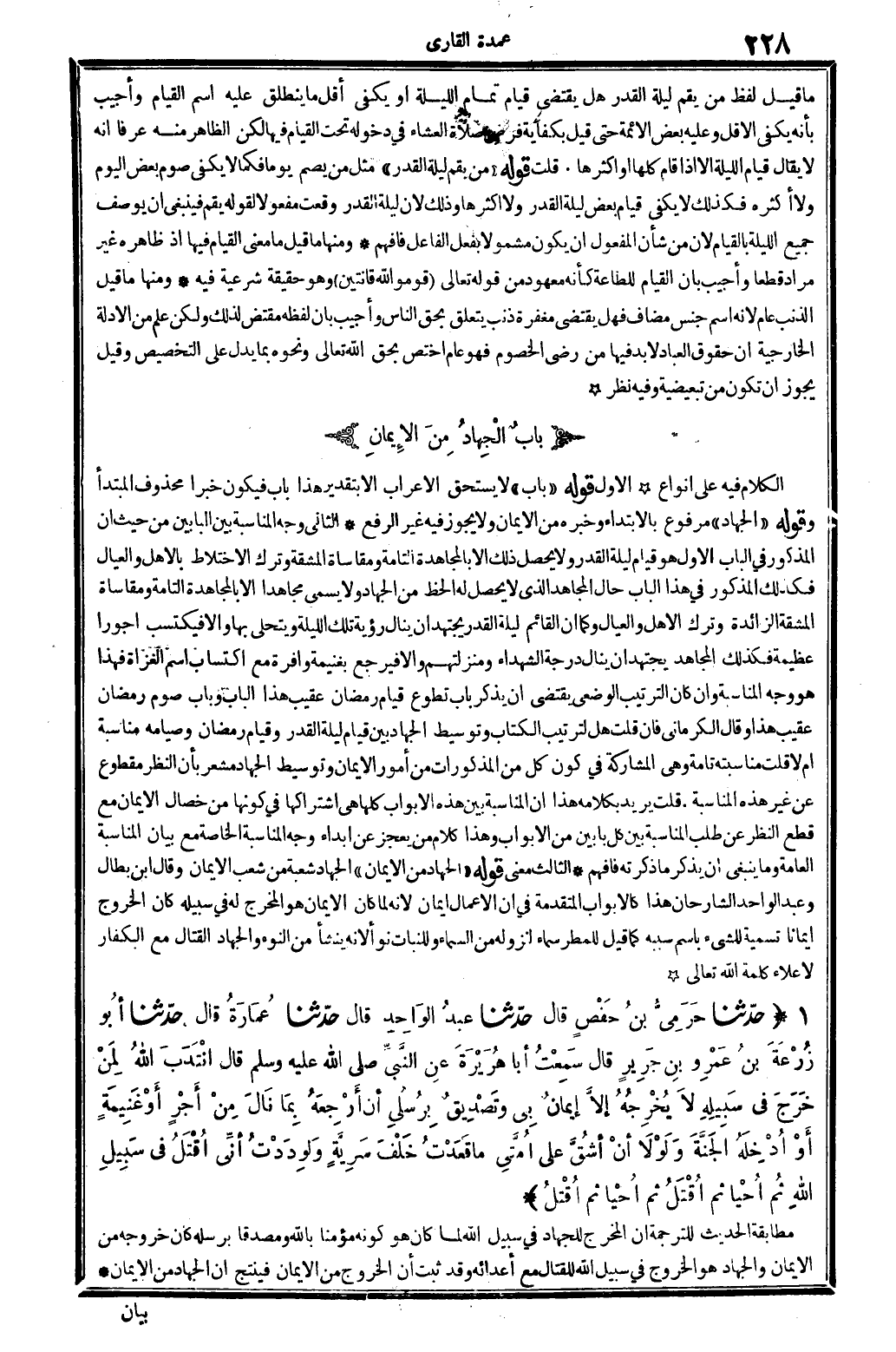 الْكَلَام فِيهِ على أَنْوَاع الأول: قَوْله: (بَاب) لَا يسْتَحق الْإِعْرَاب إِلَّا بِتَقْدِير: هَذَا بَاب، فَيكون خَبرا مَحْذُوف الْمُبْتَدَأ. وَقَوله: (الْجِهَاد) مَرْفُوع بِالِابْتِدَاءِ وَخَبره: (من الْإِيمَان) وَلَا يجوز فِيهِ غير الرّفْع. الثَّانِي: وَجه الْمُنَاسبَة بَين الْبَابَيْنِ من حَيْثُ إِن الْمَذْكُور فِي الْبَاب الأول هُوَ قيام لَيْلَة الْقدر، وَلَا يحصل ذَلِك، إِلَّا بالمجاهدة التَّامَّة ومقاساة الْمَشَقَّة وَترك الِاخْتِلَاط بالأهل والعيال، فَكَذَلِك الْمَذْكُور فِي هَذَا الْبَاب حَال الْمُجَاهِد الَّذِي لَا يحصل لَهُ الْحَظ من الْجِهَاد، وَلَا يُسمى مُجَاهدًا إلاَّ بالمجاهدة التَّامَّة ومقاساة الْمَشَقَّة الزَّائِدَة وَترك الْأَهْل والعيال، وكما أَن الْقَائِم لَيْلَة الْقدر يجْتَهد أَن ينَال رُؤْيَة تِلْكَ اللَّيْلَة ويتحلى بهَا، وإلاَّ فيكتسب أجورا عَظِيمَة، فَكَذَلِك الْمُجَاهِد يجْتَهد أَن ينَال دَرَجَة الشُّهَدَاء ومنزلتهم وإلاَّ فَيرجع بغنيمة وافرة مَعَ اكْتِسَاب اسْم الْغُزَاة، فَهَذَا هُوَ وَجه الْمُنَاسبَة وَإِن كَانَ التَّرْتِيب الوضعي يَقْتَضِي أَن يذكر بَاب تطوع قيام رَمَضَان عقيب هَذَا الْبَاب، وَبَاب صَوْم رَمَضَان عقيب هَذَا. وَقَالَ الْكرْمَانِي: فَإِن قلت: هَل لترتيب الْكتاب وتوسيط الْجِهَاد بَين قيام لَيْلَة الْقدر وَقيام رَمَضَان وصيامه مُنَاسبَة أم لَا؟ قلت: مناسبته تَامَّة وَهِي الْمُشَاركَة فِي كَون كل من الْمَذْكُورَات من أُمُور الْإِيمَان. وتوسيط الْجِهَاد مشْعر بِأَن النّظر مَقْطُوع عَن غير هَذِه الْمُنَاسبَة. قلت: يُرِيد بِكَلَامِهِ هَذَا أَن الْمُنَاسبَة بَين هَذِه الْأَبْوَاب كلهَا هِيَ اشتراكها فِي كَونهَا من خِصَال الْإِيمَان، مَعَ قطع النّظر عَن طلب الْمُنَاسبَة بَين كل بَابَيْنِ من الْأَبْوَاب، وَهَذَا كَلَام من يعجز عَن إبداء وَجه الْمُنَاسبَة الْخَاصَّة مَعَ الْمُنَاسبَة الْعَامَّة، وَمَا يَنْبَغِي أَن يذكر مَا ذكرته، فَافْهَم. الثَّالِث: معنى قَوْله: (الْجِهَاد من الْإِيمَان) الْجِهَاد شُعْبَة من شعب الْإِيمَان. وَقَالَ ابْن بطال وَعبد الْوَاحِد، الشارحان: هَذَا كالأبواب الْمُتَقَدّمَة فِي أَن الْأَعْمَال إِيمَان، لِأَنَّهُ لما كَانَ الْإِيمَان هُوَ الْمخْرج لَهُ فِي سَبيله، كَانَ الْخُرُوج إِيمَانًا تَسْمِيَة للشَّيْء باسم سَببه، كَمَا قيل للمطر سَمَاء لنزوله من السَّمَاء، وللنبات. توأ لِأَنَّهُ ينشأ من النوء، وَالْجهَاد الْقِتَال مَعَ الْكفَّار لإعلاء كلمة الله تَعَالَى.