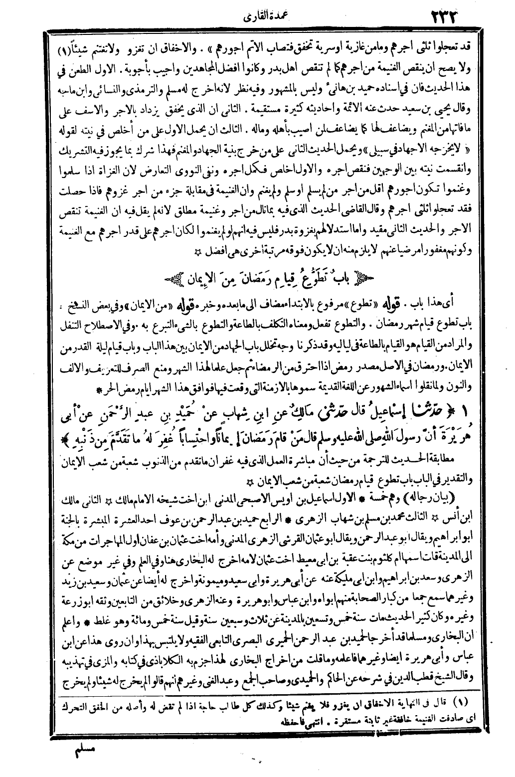 بَيَان رِجَاله: وهم خَمْسَة: الأول: إِسْمَاعِيل بن أويس الأصبحي الْمدنِي، ابْن أُخْت شَيْخه الإِمَام مَالك. الثَّانِي: مَالك بن أنس. الثَّالِث: مُحَمَّد بن مُسلم بن شهَاب الزُّهْرِيّ. الرَّابِع: حميد بن عبد الرَّحْمَن بن عَوْف، أحد الْعشْرَة المبشرة بِالْجنَّةِ، أَبُو إِبْرَاهِيم، وَيُقَال: أَبُو عبد الرَّحْمَن، وَيُقَال: أَبُو عُثْمَان الْقرشِي الزُّهْرِيّ الْمدنِي، وَأمه أُخْت عُثْمَان بن عَفَّان، أول الْمُهَاجِرَات من مَكَّة إِلَى الْمَدِينَة، قلت: اسْمهَا أم كُلْثُوم بنت عقبَة بن أبي معيط، أُخْت عُثْمَان لأمه، أخرج لَهُ البُخَارِيّ هُنَا، وَفِي الْعلم، وَفِي غير مَوضِع عَن الزُّهْرِيّ وَسعد بن إِبْرَاهِيم وَابْن أبي مليكَة عَنهُ، عَن أبي هُرَيْرَة وَأبي سعيد ومَيْمُونَة، وَأخرج لَهُ أَيْضا عَن عُثْمَان وَسَعِيد بن زيد وَغَيرهمَا، سمع جمعا من كبار الصَّحَابَة مِنْهُم أَبَوَاهُ وَابْن عَبَّاس وَأَبُو هُرَيْرَة، وَعنهُ الزُّهْرِيّ وخلائق من التَّابِعين وَثَّقَهُ أَبُو زرْعَة وَغَيره، وَكَانَ كثير الحَدِيث، مَاتَ سنة خمس وَتِسْعين بِالْمَدِينَةِ عَن ثَلَاث وَسبعين سنة، وَقيل: سنة خمس وَمِائَة وَهُوَ غلط. وَاعْلَم أَن البُخَارِيّ وَمُسلمًا قد أخرجَا لحميد بن عبد الرَّحْمَن الْحِمْيَرِي الْبَصْرِيّ التَّابِعِيّ الْفَقِيه، وَلَا يلتبس بِهَذَا، وَإِن رُوِيَ هَذَا عَن ابْن عَبَّاس وَأبي هُرَيْرَة أَيْضا وَغَيرهمَا فاعلمه. وَمَا قلت من إِخْرَاج البُخَارِيّ لهَذَا جزم بِهِ الكلاباذي فِي كِتَابه، والمزي فِي (تهذيبه) ، وَقَالَ الشَّيْخ قطب الدّين فِي شَرحه عَن الْحَاكِم، والْحميدِي، وَصَاحب الْجمع وَعبد الْغَنِيّ وَغَيرهم أَنهم قَالُوا: لم يخرج لَهُ شَيْئا، وَلم يخرج
