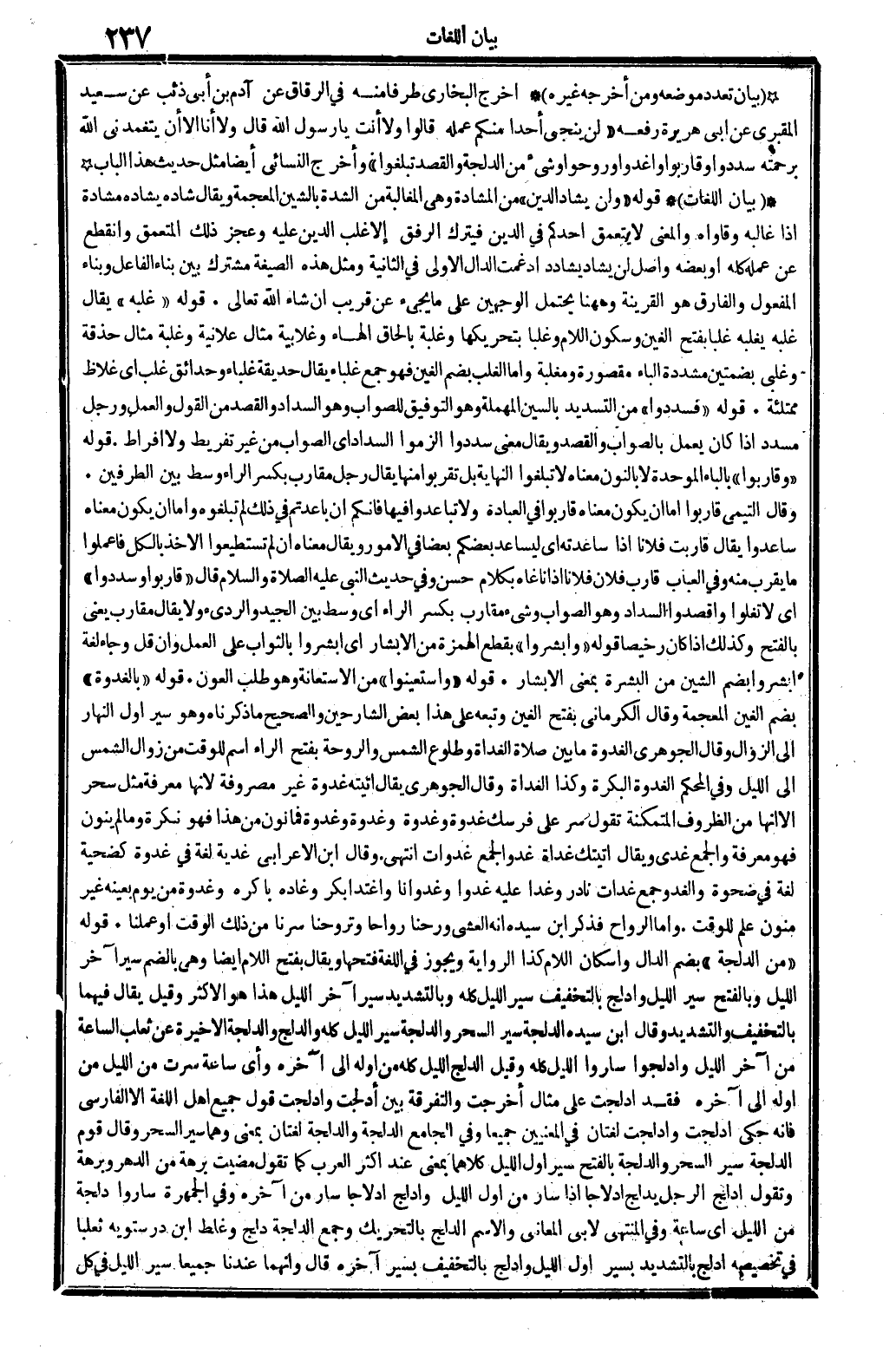 بَيَان اللُّغَات: قَوْله: (وَلنْ يشاد الدّين) من المشادة وَهِي: المغالبة من الشدَّة بالشين الْمُعْجَمَة، وَيُقَال: شاده يشاده مشادة: إِذا غالبه وقاواه، وَالْمعْنَى: لَا يتعمق أحدكُم فِي الدّين فَيتْرك الرِّفْق إلاَّ غلب الدّين عَلَيْهِ، وَعجز ذَلِك المتعمق وَانْقطع عَن عمله كُله أَو بعضه، وأصل لن يشاد: ويشادد، أدغمت الدَّال الأولى فِي الثَّانِيَة، وَمثل هَذِه الصِّيغَة مُشْتَرك بَين بِنَاء الْفَاعِل وَبِنَاء الْمَفْعُول، والفارق هُوَ الْقَرِينَة، وَهَهُنَا يحْتَمل الْوَجْهَيْنِ على مَا يَجِيء عَن قريب، إِن شَاءَ الله تَعَالَى. قَوْله: (غَلبه) يُقَال: غَلبه يغلبه غلبا بِفَتْح الْغَيْن وَسُكُون اللَّام، وغلبا بتحريكها، وَغَلَبَة بإلحاق الْهَاء وغلابية مِثَال عَلَانيَة، وَغَلَبَة مِثَال حذقة، وغلبي بِضَمَّتَيْنِ، مُشَدّدَة الْبَاء مَقْصُورَة، ومغلبة؛ وَأما الغلب، بِضَم الْغَيْن فَهُوَ جمع غلباء، يُقَال: حديقة غلباء، وَحَدَائِق غلب، أَي: غِلَاظ ممتلئة. قَوْله: (فسددوا) من التسديد، بِالسِّين الْمُهْملَة، وَهُوَ: التَّوْفِيق للصَّوَاب وَهُوَ السداد وَالْقَصْد من القَوْل وَالْعَمَل، وَرجل مُسَدّد إِذا كَانَ يعْمل بِالصَّوَابِ وَالْقَصْد، وَيُقَال: معنى سددوا الزموا السداد، أَي: الصَّوَاب من غير تَفْرِيط وَلَا إفراط. قَوْله: (وقاربوا) بِالْبَاء الْمُوَحدَة لَا بالنُّون، مَعْنَاهُ: لَا تبلغوا النِّهَايَة بل تقربُوا مِنْهَا، يُقَال: رجل مقارب بِكَسْر الرَّاء: وسط بَين الطَّرفَيْنِ. وَقَالَ التَّيْمِيّ: قاربوا إِمَّا أَن يكون مَعْنَاهُ: قاربوا فِي الْعِبَادَة وَلَا تباعدوا فِيهَا، فَإِنَّكُم إِن باعدتم فِي ذَلِك لم تبلغوه، وَإِمَّا أَن يكون مَعْنَاهُ ساعدوا. يُقَال: قاربت فلَانا إِذا ساعدته أَي: ليساعد بَعْضكُم بَعْضًا فِي الْأُمُور، وَيُقَال: مَعْنَاهُ إِن لم تستطيعوا الْأَخْذ بِالْكُلِّ فاعملوا مَا يقرب مِنْهُ. وَفِي (الْعباب) : قَارب فلَان فلَانا إِذا ناغاه بِكَلَام حسن، وَفِي حَدِيث النَّبِي، عَلَيْهِ الصَّلَاة وَالسَّلَام، قَالَ: (قاربوا وسددوا) أَي: لَا تغلوا واقصدوا السداد وَهُوَ الصَّوَاب، وَشَيْء مقارب، بِكَسْر الرَّاء، أَي: وسط بَين الْجيد والرديء، وَلَا يُقَال: مقارب يَعْنِي بِالْفَتْح، وَكَذَلِكَ إِذا كَانَ رخيصا. قَوْله: (وابشروا) بِقطع الْهمزَة من الإبشار أَي: أَبْشِرُوا بالثواب على الْعَمَل وَإِن قل، وَجَاء لُغَة: ابشروا، بِضَم الشين من الْبشرَة بِمَعْنى الإبشار. قَوْله: (وَاسْتَعِينُوا) . من الِاسْتِعَانَة، وَهُوَ طلب العون. قَوْله: (بالغدوة) بِضَم الْغَيْن الْمُعْجَمَة. وَقَالَ الْكرْمَانِي، بِفَتْح الْغَيْن، وَتَبعهُ على هَذَا بعض الشَّارِحين، وَالصَّحِيح مَا ذَكرْنَاهُ: وَهُوَ سير أول النَّهَار إِلَى الزَّوَال. وَقَالَ الْجَوْهَرِي: الغدوة مَا بَين صَلَاة الْغَدَاة وطلوع الشَّمْس، والروحة، بِفَتْح الرَّاء، اسْم للْوَقْت من زَوَال الشَّمْس إِلَى اللَّيْل، وَفِي (الْمُحكم) : الغدوة البكرة، وَكَذَا الْغَدَاة، وَقَالَ الْجَوْهَرِي: يُقَال: أَتَيْته غدْوَة غير مصروفة لِأَنَّهَا معرفَة مثل: سحر، إلاَّ أَنَّهَا من الظروف المتمكنة. تَقول: سر على فرسك غدْوَة وغدوة وغدوة وغدوة، فَمَا نوّن من هَذَا فَهُوَ نكرَة، وَمَا لم ينون فَهُوَ معرفَة، وَالْجمع: غُدى، وَيُقَال: أَتَيْتُك غَدَاة غَد، وَالْجمع: غدوات انْتهى. وَقَالَ ابْن الْأَعرَابِي: غدية لُغَة فِي غدْوَة، كضحية لُغَة فِي ضحوة، والغدو جمع غدات نَادِر، وَغدا عَلَيْهِ غدوا وغدوانا، واغتد أبكر، وغاده باكره، وغدوة من يَوْم بِعَيْنِه غير منون: علم للْوَقْت. وَأما الرواح فَذكر ابْن سَيّده أَنه الْعشي، ورحنا رواحا وتروحنا: سرنا من ذَلِك الْوَقْت أَو عَملنَا. قَوْله: (من الدلجة) ، بِضَم الدَّال، وَإِسْكَان اللَّام، كَذَا الرِّوَايَة، وَيجوز فِي اللُّغَة فتحهَا، وَ