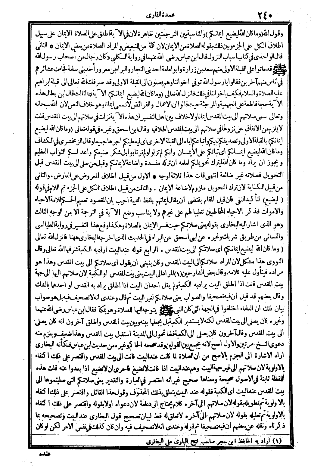 بَيَان ذَلِك أَن الْعلمَاء اخْتلفُوا فِي الْجِهَة الَّتِي كَانَ النَّبِي صلى الله عَلَيْهِ وَسلم يتَوَجَّه إِلَيْهَا للصَّلَاة وَهُوَ بِمَكَّة، فَقَالَ ابْن عَبَّاس، رَضِي الله عَنْهُمَا، وَغَيره: كَانَ يُصَلِّي إِلَى بَيت الْمُقَدّس، لكنه لَا يستدبر الْكَعْبَة، بل يَجْعَلهَا بَينه وَبَين بَيت الْمُقَدّس، وَأطلق آخَرُونَ أَنه كَانَ يُصَلِّي إِلَى بَيت الْمُقَدّس، وَقَالَ آخَرُونَ كَانَ يُصَلِّي إِلَى الْكَعْبَة فَلَمَّا تحول إِلَى الْمَدِينَة اسْتقْبل بَيت الْمُقَدّس وَهَذَا ضَعِيف، وَيلْزم مِنْهُ دَعْوَى النّسخ مرَّتَيْنِ، وَالْأول أصح لِأَنَّهُ يجمع بَين الْقَوْلَيْنِ، وَقد صَححهُ الْحَاكِم وَغَيره من حَدِيث ابْن عَبَّاس، فَكَأَنَّهُ، البُخَارِيّ، أَرَادَ الْإِشَارَة إِلَى الْجَزْم بالأصح من أَن الصَّلَاة لما كَانَت عِنْد الْبَيْت كَانَت إِلَى بَيت الْمُقَدّس، وَاقْتصر على ذَلِك اكْتِفَاء بالاولوية، لِأَن صلَاتهم إِلَى غير جِهَة الْبَين وهم عِنْد الْبَيْت إِذا كَانَت لَا تضيع فأحرى أَلا تضيع إِذا بعدوا عَنهُ قلت هَذِه اللَّفْظَة ثَابِتَة فِي الْأُصُول صَحِيحَة وَمَعْنَاهَا صَحِيح غير أَنه اختصر فِي الْعبارَة وَالتَّقْدِير يَعْنِي صَلَاتكُمْ الَّتِي صليتموها إِلَى بَيت الْمُقَدّس عِنْد الْبَيْت أَي الْكَعْبَة فَقَوله عِنْد الْبَيْت يتَعَلَّق بذلك الْمَحْذُوف وَقَول هَذَا الْقَائِل وَاقْتصر على ذَلِك اكْتِفَاء بالأولوية ثمَّ تطويله بقوله: لِأَن صلَاتهم إِلَى آخِره ... كَلَام يحْتَاج إِلَى دعامة، لِأَن دَعْوَاهُ أَولا بقوله: وَاقْتصر على ذَلِك اكْتِفَاء بالاولوية. ثمَّ تَعْلِيله بقوله: لِأَن صلَاتهم ... الى آخِره، لَا تعلق لَهُ قطّ، لبَيَان تَصْحِيح قَول البُخَارِيّ: عِنْد الْبَيْت، وتصحيحه بِمَا ذَكرْنَاهُ، وَنَقله عَن بَعضهم أَن فِيهِ تصحيفاً، ثمَّ قَوْله: وَعِنْدِي أَنه لَا تَصْحِيف فِيهِ، وَإِن كَانَ كَذَلِك فِي نفس الْأَمر، لَكِن لَو كَانَ