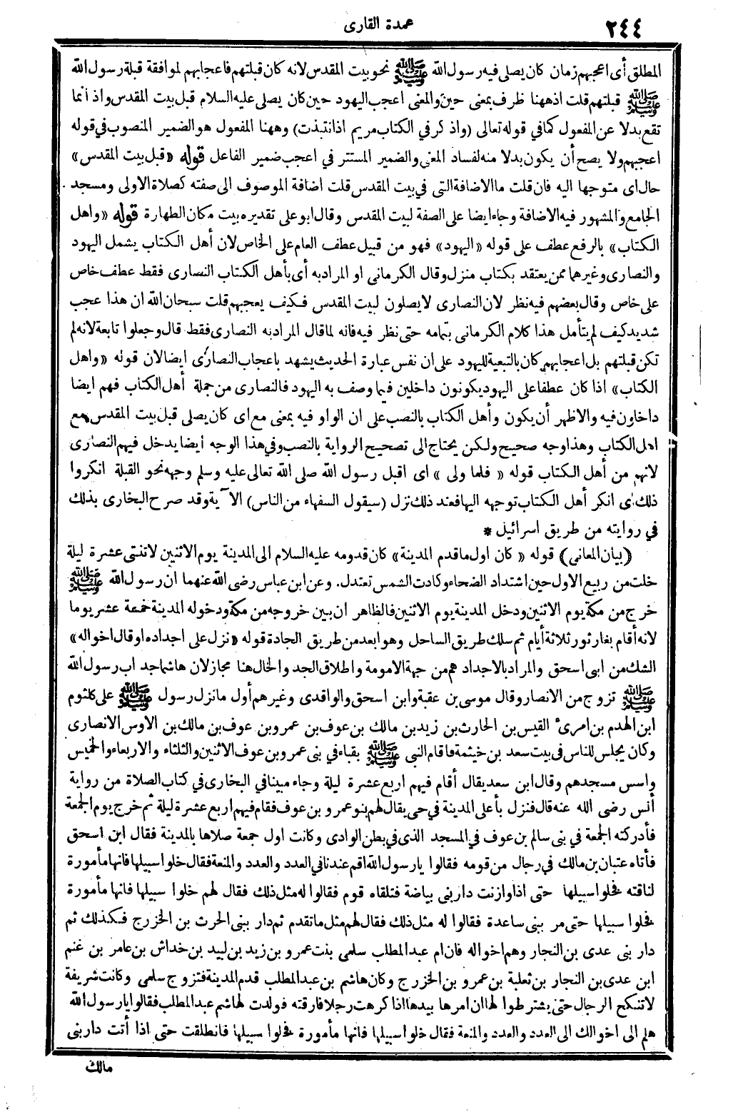 الْمُطلق، أَي: اعجبهم زمَان كَانَ يُصَلِّي فِيهِ رَسُول الله صلى الله عَلَيْهِ وَسلم نَحْو بَيت الْمُقَدّس، لِأَنَّهُ كَانَ قبلتهم، فإعجابهم لموافقة قبْلَة رَسُول الله صلى الله عَلَيْهِ وَسلم قبلتهم: قلت: إِذْ، هَهُنَا ظرف بِمَعْنى حِين، وَالْمعْنَى: اعْجَبْ الْيَهُود حِين كَانَ يُصَلِّي، عَلَيْهِ السَّلَام، قبل بَيت الْمُقَدّس، و: إِذْ، إِنَّمَا تقع بَدَلا عَن الْمَفْعُول، كَمَا فِي قَوْله تَعَالَى: {وَاذْكُر فِي الْكتاب مَرْيَم إِذْ انتبذت} (مَرْيَم: 16) وَهَهُنَا الْمَفْعُول هُوَ الضَّمِير الْمَنْصُوب فِي قَوْله: اعجبهم، وَلَا يَصح أَن يكون بَدَلا مِنْهُ، لفساد الْمَعْنى، وَالضَّمِير الْمُسْتَتر فِي: اعْجَبْ، ضمير الْفَاعِل. قَوْله: (قبل بَيت الْمُقَدّس) حَال اي: مُتَوَجها إِلَيْهِ. فان قلت: مَا الْإِضَافَة الَّتِي فِي بَيت الْمُقَدّس؟ قلت: إِضَافَة الْمَوْصُوف إِلَى صفته: كَصَلَاة الاولى، وَمَسْجِد الْجَامِع، وَالْمَشْهُور فِيهِ الْإِضَافَة، وَجَاء أَيْضا على الصّفة لبيت الْمُقَدّس، وَقَالَ ابو عَليّ: تَقْدِيره: بَيت مَكَان الطَّهَارَة. قَوْله: (واهل الْكتاب) بِالرَّفْع عطف على قَوْله: (الْيَهُود) ، فَهُوَ من قبيل عطف الْعَام على الْخَاص لِأَن أهل الْكتاب يَشْمَل الْيَهُود وَالنَّصَارَى وَغَيرهمَا مِمَّن يعْتَقد بِكِتَاب منزل. وَقَالَ الْكرْمَانِي: اَوْ المُرَاد بِهِ، أَي: بِأَهْل الْكتاب النَّصَارَى فَقَط، عطف خَاص على خَاص؛ وَقَالَ بَعضهم: فِيهِ نظر، لِأَن النَّصَارَى لَا يصلونَ لبيت الْمُقَدّس، فَكيف يعجبهم؟ قلت: سُبْحَانَ الله، إِن هَذَا عجب شَدِيد كَيفَ لم يتَأَمَّل هَذَا كَلَام الْكرْمَانِي بِتَمَامِهِ حَتَّى نظر فِيهِ، فَإِنَّهُ لما قَالَ: المُرَاد بِهِ النَّصَارَى فَقَط، قَالَ: وَجعلُوا تَابِعَة لِأَنَّهُ لم تكن قبلتهم، بل إعجابهم كَانَ بالتبعية للْيَهُود، على نفس عبارَة الحَدِيث يشْهد بإعجاب النَّصَارَى أَيْضا، لَان قَوْله: (واهل الْكتاب) إِذا كَانَ عطفا على الْيَهُود يكونُونَ داخلين فِيمَا وصف بِهِ الْيَهُود، فالنصارى من جملَة أهل الْكتاب، فهم أَيْضا داخلون فِيهِ، وَالْأَظْهَر أَن يكون: وَأهل الْكتاب، بِالنّصب على أَن الْوَاو فِيهِ بِمَعْنى: مَعَ، أَي: كَانَ يُصَلِّي قبل بَيت الْمُقَدّس مَعَ اهل الْكتاب، وَهَذَا وَجه صَحِيح، وَلَكِن يحْتَاج إِلَى تَصْحِيح الرِّوَايَة بِالنّصب، وَفِي هَذَا الْوَجْه أَيْضا يدْخل فيهم النَّصَارَى لأَنهم من أهل الْكتاب. قَوْله: (فَلَمَّا ولى) أَي: اقبل رَسُول الله، صلى الله تَعَالَى عَلَيْهِ وَسلم، وَجهه نَحْو الْقبْلَة أَنْكَرُوا ذَلِك، اي: انكر أهل الْكتاب توجهه إِلَيْهَا فَعِنْدَ ذَلِك نزل: {سَيَقُولُ السُّفَهَاء من النَّاس} (الْبَقَرَة: 142)