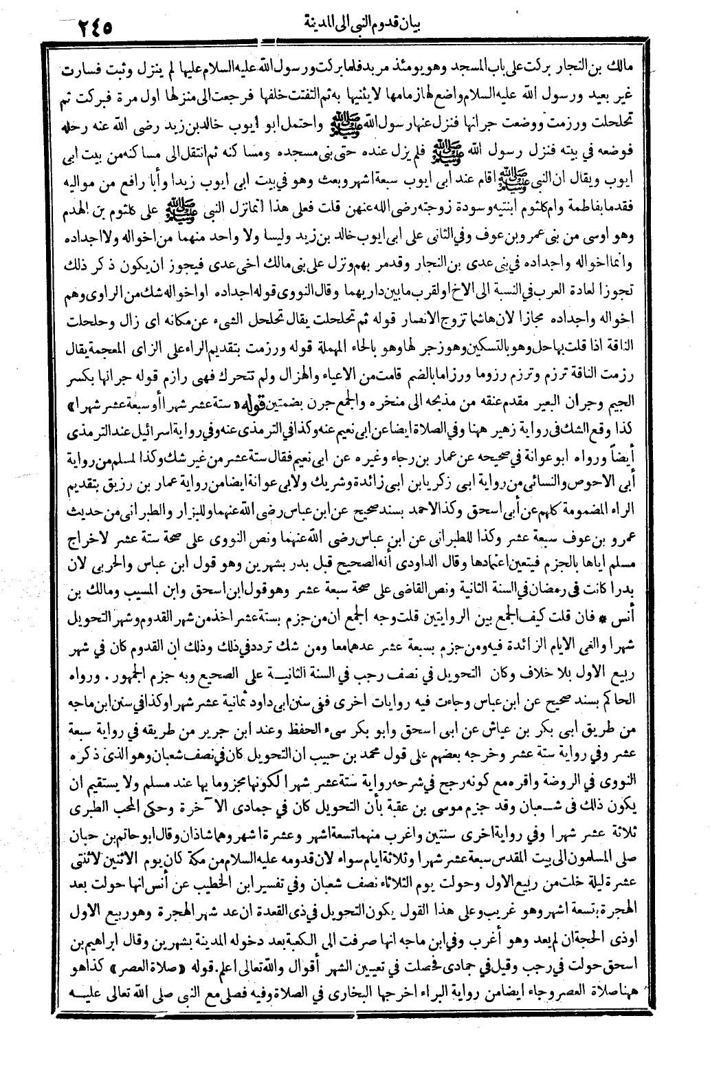 مَالك بن النجار بَركت على بَاب الْمَسْجِد، وَهُوَ يومئذٍ مربد، فَلَمَّا بَركت وَرَسُول الله عَلَيْهِ السَّلَام، عَلَيْهَا لم ينزل، وَثَبت فسارت غير بعيد، وَرَسُول الله، عَلَيْهِ السَّلَام، وَاضع لَهَا زمامها لَا يثنيها بِهِ، ثمَّ التفتت خلفهَا فَرَجَعت إِلَى منزلهَا أول مرّة، فبركت ثمَّ تحلحلت ورزمت وَوضعت جِرَانهَا، فَنزل عَنْهَا رَسُول الله صلى الله عَلَيْهِ وَسلم، وَاحْتمل أَبُو أَيُّوب خَالِد بن زيد، رَضِي الله عَنهُ، رَحْله فَوَضعه فِي بَيته، فَنزل رَسُول الله صلى الله عَلَيْهِ وَسلم فَلم يزل عِنْده حَتَّى بنى مَسْجده ومساكنه، ثمَّ انْتقل إِلَى مساكنه من بَيت أبي ايوب، وَيُقَال: إِن النَّبِي صلى الله عَلَيْهِ وَسلم أَقَامَ عِنْد أبي أَيُّوب سَبْعَة أشهر، وَبعث وَهُوَ فِي بَيت أبي أَيُّوب زيدا وَأَبا رَافع، من موَالِيه، فَقدما بفاطمة وَأم كُلْثُوم ابْنَتَيْهِ، وَسَوْدَة زَوجته، رَضِي الله عَنْهُن، قلت: فعلى هَذَا إِنَّمَا نزل النَّبِي صلى الله عَلَيْهِ وَسلم على كُلْثُوم بن الْهدم وَهُوَ أوسي من بني عَمْرو بن عَوْف، وَفِي الثَّانِي: على أبي أَيُّوب خَالِد بن زيد، وليسا، وَلَا وَاحِد مِنْهُمَا، من أَخْوَاله وَلَا أجداده، وَإِنَّمَا أَخْوَاله وأجداده فِي بني عدي بن النجار، وَقد مر بهم، وَنزل على بني مَالك أخي عدي، فَيجوز أَن يكون ذكر ذَلِك تجوازاً لعادة الْعَرَب فِي النِّسْبَة إِلَى الْأَخ، أَو لقرب مَا بَين داريهما. وَقَالَ النَّوَوِيّ: (أجداده أَو أَخْوَاله) شكّ من الرَّاوِي، وهم أَخْوَاله وأجداده مجَازًا، لِأَن هاشماً تزوج فِي الْأَنْصَار. قَوْله: ثمَّ تحلحلت يُقَال: تحلحل الشَّيْء عَن مَكَانَهُ أَي: زَالَ، وحلحلت النَّاقة، اذا قلت بهَا: حل، وَهُوَ بالتسكين، وَهُوَ زجر لَهَا، وَهُوَ بِالْحَاء الْمُهْملَة. قَوْله: ورزمت، بِتَقْدِيم الرَّاء على الزَّاي الْمُعْجَمَة، يُقَال: رزمت النَّاقة ترزم وترزم رزوما ورزاما بِالضَّمِّ، قَامَت من الإعياء والهزل، وَلم تتحرك، فَهِيَ رازم. قَوْله: جِرَانهَا، بِكَسْر الْجِيم، وجران الْبَعِير: مقدم عُنُقه من مذبحه إِلَى منخره، وَالْجمع: جُرُن، بِضَمَّتَيْنِ.