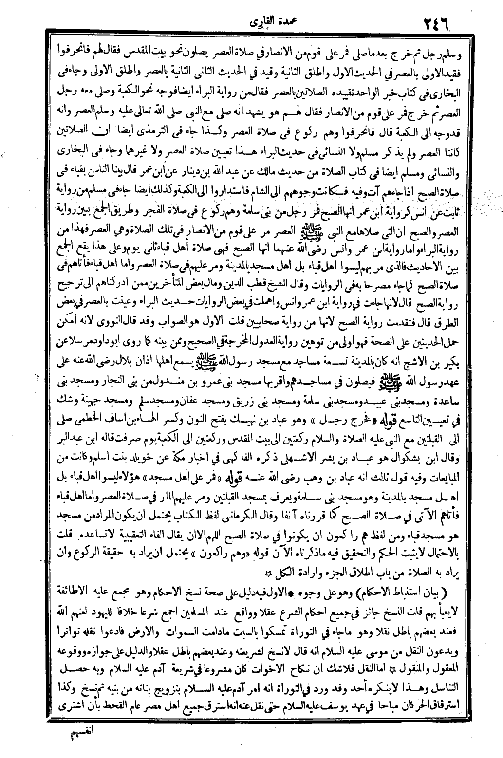 وَسلم، رجل، ثمَّ خرج بعد مَا صلى، فَمر على قوم من الْأَنْصَار فِي صَلَاة الْعَصْر يصلونَ نَحْو بَيت الْمُقَدّس، فَقَالَ لَهُم فانحرفوا، فقيد الأولى بالعصر فِي الحَدِيث الأول، واطلق الثَّانِيَة. وَقيد فِي الحَدِيث الثَّانِي الثَّانِيَة بالعصر، وَأطلق الاولى. وَجَاء فِي البُخَارِيّ فِي كتاب خبر الْوَاحِد تَقْيِيده الصَّلَاتَيْنِ بالعصر، فَقَالَ من رِوَايَة الْبَراء أَيْضا: فَوجه نَحْو الْكَعْبَة، وَصلى مَعَه رجل الْعَصْر، ثمَّ خرج فَمر على قوم من الْأَنْصَار فَقَالَ لَهُم: هُوَ يشْهد أَنه صلى مَعَ النَّبِي، صلى الله تَعَالَى عَلَيْهِ وَسلم، الْعَصْر، وَأَنه قد وَجه إِلَى الْكَعْبَة. قَالَ: فانحرفوا وهم رُكُوع فِي صَلَاة الْعَصْر، وَكَذَا جَاءَ فِي الترمذى أَيْضا: إِن الصَّلَاتَيْنِ كَانَتَا الْعَصْر، وَلم يذكر مُسلم وَلَا النَّسَائِيّ فِي حَدِيث الْبَراء هَذَا تعْيين صَلَاة الْعَصْر وَلَا غَيرهمَا، وَجَاء فِي البُخَارِيّ وَالنَّسَائِيّ وَمُسلم أَيْضا، فِي كتاب الصَّلَاة، من حَدِيث مَالك عَن عبد الله بن دِينَار، عَن ابْن عمر قَالَ: بَينا النَّاس بقباء فِي صَلَاة الصُّبْح، إِذا جَاءَهُم آتٍ ... وَفِيه: فَكَانَت وُجُوههم إِلَى الشَّام، فاستداروا إِلَى الْكَعْبَة. وَكَذَلِكَ أَيْضا جَاءَ فِي مُسلم من رِوَايَة ثَابت عَن انس كَرِوَايَة ابْن عمر أَنَّهَا الصُّبْح، فَمر رجل من بني سَلمَة وهم رُكُوع فِي صَلَاة الْفجْر: وَطَرِيق الْجمع بَين رِوَايَة الْعَصْر وَالصُّبْح أَن الَّتِي صلاهَا مَعَ النَّبِي صلى الله عَلَيْهِ وَسلم الْعَصْر، مر على قوم من الْأَنْصَار فِي تِلْكَ الصَّلَاة وَهِي الْعَصْر، فَهَذَا من رِوَايَة الْبَراء، وَأما رِوَايَة ابْن عمر وَأنس رَضِي الله عَنْهُمَا، أَنَّهَا الصُّبْح فَهِيَ صَلَاة أهل قبَاء ثَانِي يَوْم، وعَلى هَذَا يَقع الْجمع بَين الْأَحَادِيث، فَالَّذِي مر بهم لَيْسُوا أهل قبَاء، بل أهل مَسْجِد بِالْمَدِينَةِ، وَمر عَلَيْهِم فِي صَلَاة الْعَصْر، وَأما أهل قبَاء فَأَتَاهُم فِي صَلَاة الصُّبْح، كَمَا جَاءَ مُصَرحًا بِهِ فِي الرِّوَايَات. وَقَالَ الشَّيْخ قطب الدّين: وَمَال بعض الْمُتَأَخِّرين مِمَّن أدركناهم إِلَى تَرْجِيح رِوَايَة الصُّبْح. قَالَ: لِأَنَّهَا جَاءَت فِي رِوَايَة ابْن عمر وَأنس، وأهملت فِي بعض الرِّوَايَات حَدِيث الْبَراء، وعينت بالعصر فِي بعض الطّرق. قَالَ: فتقدمت رِوَايَة الصُّبْح لِأَنَّهَا من رِوَايَة صحابيين. قلت: الأول هُوَ الصَّوَاب، وَقد قَالَ النَّوَوِيّ: لِأَنَّهُ أمكن حمل الْحَدِيثين على الصِّحَّة فَهُوَ أولى من توهين رِوَايَة الْعُدُول المخرجة فِي الصَّحِيح، وَمِمَّنْ بَينه كَمَا روى أَبُو دَاوُد مُرْسلا عَن بكير بن الْأَشَج أَنه كَانَ بِالْمَدِينَةِ تِسْعَة مَسَاجِد مَعَ مَسْجِد رَسُول الله صلى الله عَلَيْهِ وَسلم يسمع أَهلهَا آذان بِلَال، رَضِي الله عَنهُ، على عهد رَسُول الله صلى الله عَلَيْهِ وَسلم، فيصلون فِي مَسَاجِدهمْ، وأقربها مَسْجِد بني عَمْرو بن مندول من بني النجار، وَمَسْجِد بني سَاعِدَة، وَمَسْجِد بني عبيد، وَمَسْجِد بني سَلمَة، وَمَسْجِد بني زُرَيْق، وَمَسْجِد عَفَّان، وَمَسْجِد سلم، وَمَسْجِد جُهَيْنَة. وَشك فِي تعْيين التَّاسِع.