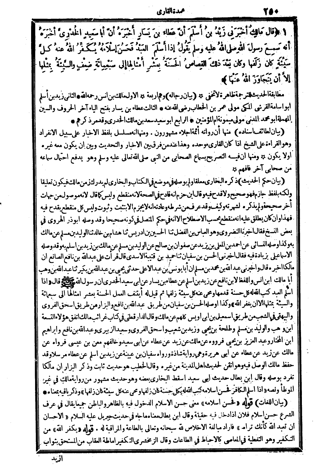 بَيَان حكم الحَدِيث: ذكره البُخَارِيّ مُعَلّقا، وَلم يوصله فِي مَوضِع فِي الْكتاب، وَالْبُخَارِيّ لم يدْرك زمن مَالك، فَيكون تَعْلِيقا وَلكنه بِلَفْظ جازم، فَهُوَ صَحِيح وَلَا قدح فِيهِ، وَقَالَ ابْن حزم: إِنَّه قَادِح فِي الصِّحَّة لِأَنَّهُ مُنْقَطع، وَلَيْسَ كَمَا قَالَ، لِأَنَّهُ مَوْصُول من جِهَات أخر صَحِيحَة، وَلم يذكرهُ لشهرته، وَكَيف وَقد عرف من شَرطه وعادته أَنه لَا يجْزم إلاَّ بتثبت وَثُبُوت؟ وَلَيْسَ كل مُنْقَطع يقْدَح فِيهِ، فَهَذَا، وَإِن كَانَ يُطلق عَلَيْهِ أَنه مُنْقَطع بِحَسب الِاصْطِلَاح، إلاَّ أَنه فِي حكم الْمُتَّصِل فِي كَونه صَحِيحا، وَقد وَصله أَبُو ذَر الْهَرَوِيّ فِي بعض النّسخ فَقَالَ: أخبرنَا النضروي، وَهُوَ الْعَبَّاس بن الْفضل، ثَنَا الْحُسَيْن بن إِدْرِيس، ثَنَا هِشَام بن خَالِد، ثَنَا الْوَلِيد بن مُسلم، عَن مَالك بِهِ. وَكَذَا وَصله النَّسَائِيّ عَن أَحْمد بن الْمُعَلَّى بن يزِيد، عَن صَفْوَان بن صَالح، عَن الْوَلِيد بن مُسلم، عَن مَالك بن زيد بن أسلم بِهِ. وَقد وَصله الْإِسْمَاعِيلِيّ بِزِيَادَة فِيهِ، فَقَالَ: أَخْبرنِي الْحسن بن سُفْيَان، ثَنَا حميد بن قُتَيْبَة الْأَسدي، قَالَ: قَرَأت على عبد الله بن نَافِع الصَّانِع أَن مَالِكًا اخبره قَالَ: واخبرني عبد الله بن مُحَمَّد بن مُسلم أَن أَبَا يُونُس بن عبد الْأَعْلَى حَدثنِي يحيى بن عبد الله بن بكير، ثَنَا عبد الله بن وهب أَبَا مَالك ابْن انس، وَاللَّفْظ لِابْنِ نَافِع، عَن زيد بن أسلم، عَن عَطاء بن يسَار، عَن أبي سعيد الْخُدْرِيّ، ان رَسُول الله صلى الله عَلَيْهِ وَسلم قَالَ: (أذا اسْلَمْ العَبْد كتب الله لَهُ كل حَسَنَة قدمهَا، ومحى عَنهُ كل سَيِّئَة زلفها، ثمَّ قيل لَهُ: أيتنف الْعَمَل الْحَسَنَة بِعشر أَمْثَالهَا إِلَى سَبْعمِائة، والسيئة بِمِثْلِهَا، إلاَّ أَن يغْفر الله) . وَكَذَا أوصله الْحسن بن سُفْيَان من طَرِيق عبد الله بن نَافِع، وَالْبَزَّار من طَرِيق إِسْحَاق الْفَروِي، وَالْبَيْهَقِيّ فِي (الشّعب) من طَرِيق اسماعيل بن أبي أويس، كلهم عَن مَالك. وَقَالَ الدَّارَقُطْنِيّ فِي كتاب (غرائب مَالك) : اتّفق هَؤُلَاءِ التِّسْعَة: ابْن وهب، والوليد بن مُسلم، وَطَلْحَة بن يحيى، وَزيد بن شُعَيْب، واسحاق الْفَروِي، وَسَعِيد الزبيرِي، وَعبد الله بن نَافِع، وابراهيم بن الْمُخْتَار، وَعبد الْعَزِيز بن يحيى فَرَوَوْه عَن مَالك عَن زيد عَن عَطاء عَن أبي سعيد، وَخَالفهُم معن بن عِيسَى فَرَوَاهُ عَن مَالك عَن زيد عَن عَطاء عَن أبي هُرَيْرَة، وَهِي رِوَايَة شَاذَّة وَرَوَاهُ سُفْيَان بن عُيَيْنَة عَن زيد بن اسْلَمْ عَن عَطاء مُرْسلا، وَقد حفظ مَالك الْوَصْل فِيهِ، وَهُوَ اتقن لحَدِيث أهل الْمَدِينَة من غَيره، وَقَالَ الْخَطِيب: هُوَ حَدِيث ثَابت، وَذكر الْبَزَّار أَن مَالِكًا تفرد بوصله، وَقَالَ ابْن بطال: حَدِيث أبي سعيد أسقط البُخَارِيّ بعضه، وَهُوَ حَدِيث مَشْهُور من رِوَايَة مَالك فِي غير الْمُوَطَّأ، وَنَصه: (إِذا أسلم الْكَافِر فَحسن إِسْلَامه كتب الله لَهُ لكل حَسَنَة كَانَ زلفها، ومحى عَنهُ كل سَيِّئَة كَانَ زلفها) . وَذكر بَاقِيه بِمَعْنَاهُ.