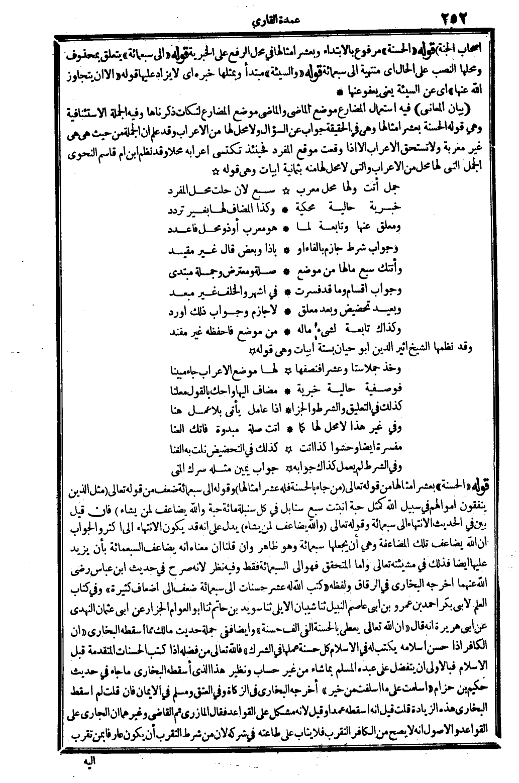 اصحاب الْجنَّة} (الْأَعْرَاف: 44) قَوْله الْحَسَنَة مَرْفُوع بِالِابْتِدَاءِ (وبعشر أَمْثَالهَا) فِي مَحل الرّفْع على الخبرية. قَوْله (إِلَى سَبْعمِائة) يتَعَلَّق بِمَحْذُوف ومحلها النصب على الْحَال، أَي: منتهية إِلَى سَبْعمِائة. قَوْله: (والسيئة) مُبْتَدأ، (وبمثلها) خَبره، أَي: لَا يُزَاد عَلَيْهَا. قَوْله (إِلَّا أَن يتَجَاوَز الله عَنْهَا) أَي: عَن السَّيئَة، يعْنى: يعْفُو عَنْهَا.