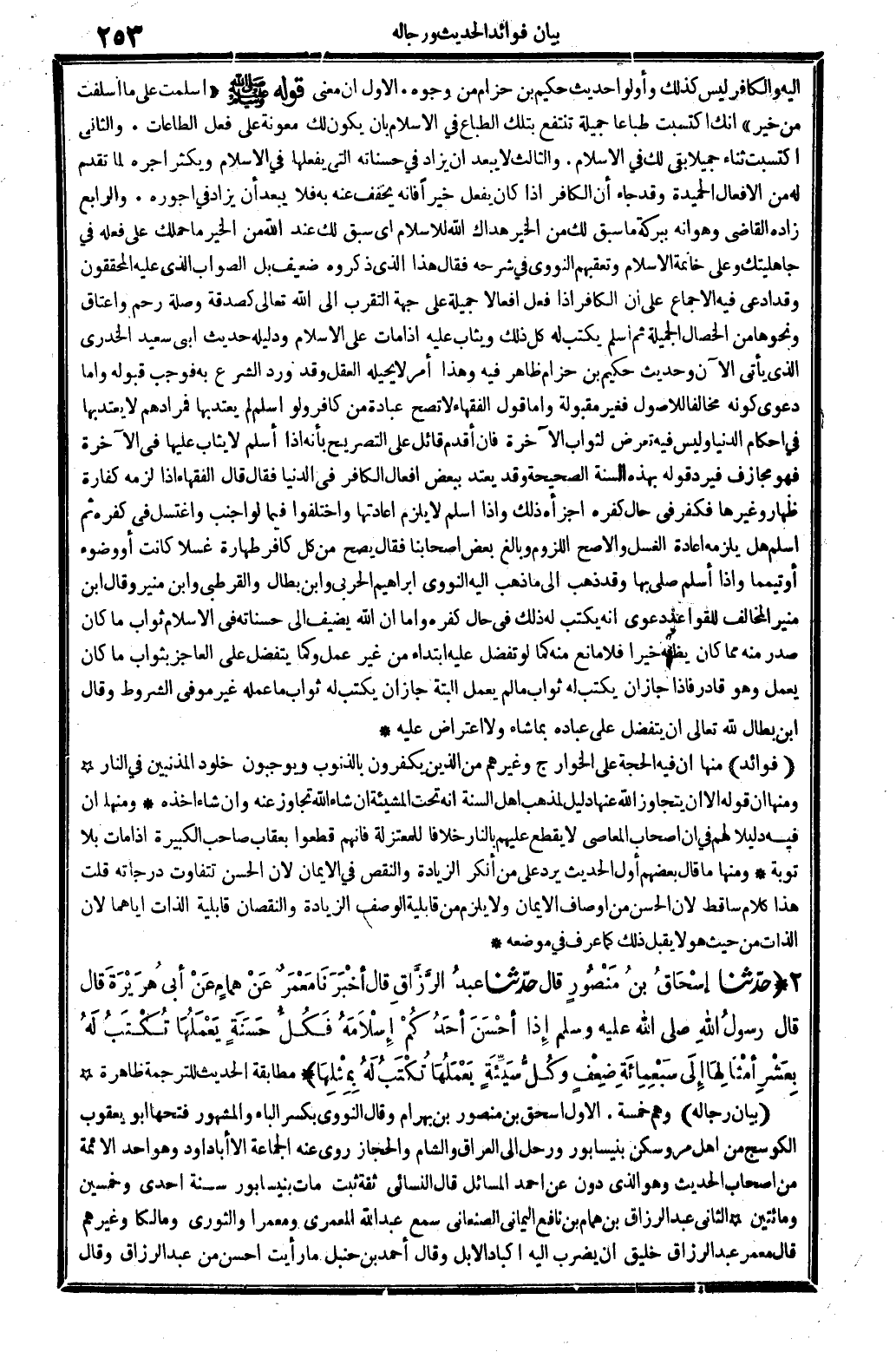 بَيَان رِجَاله: وهم خَمْسَة: الأول: اسحق بن مَنْصُور بن بهْرَام، وَقَالَ النَّوَوِيّ، بِكَسْر الْبَاء، وَالْمَشْهُور فتحهَا، أَبُو يَعْقُوب الكوسج من أهل مرو سكن بنيسابور ورحل إِلَى الْعرَاق وَالشَّام والحجاز، روى عَنهُ الْجَمَاعَة إلاَّ أَبَا دَاوُد، وَهُوَ أحد الْأَئِمَّة من أَصْحَاب الحَدِيث، وَهُوَ الَّذِي دوَّن عَن أَحْمد الْمسَائِل. قَالَ النَّسَائِيّ: ثِقَة ثَبت، مَاتَ بنيسابور سنة إِحْدَى وَخمسين وَمِائَتَيْنِ. الثَّانِي: عبد الرَّزَّاق بن همام بن نَافِع الْيَمَانِيّ الصَّنْعَانِيّ، سمع عبد الله المعمرى ومعمراً وَالثَّوْري ومالكاً وَغَيرهم، قَالَ معمر: عبد الرَّزَّاق خليق أَن يضْرب إِلَيْهِ أكباد الْإِبِل. وَقَالَ أَحْمد بن حَنْبَل: مَا رَأَيْت أحسن من عبد الرَّزَّاق. وَقَالَ