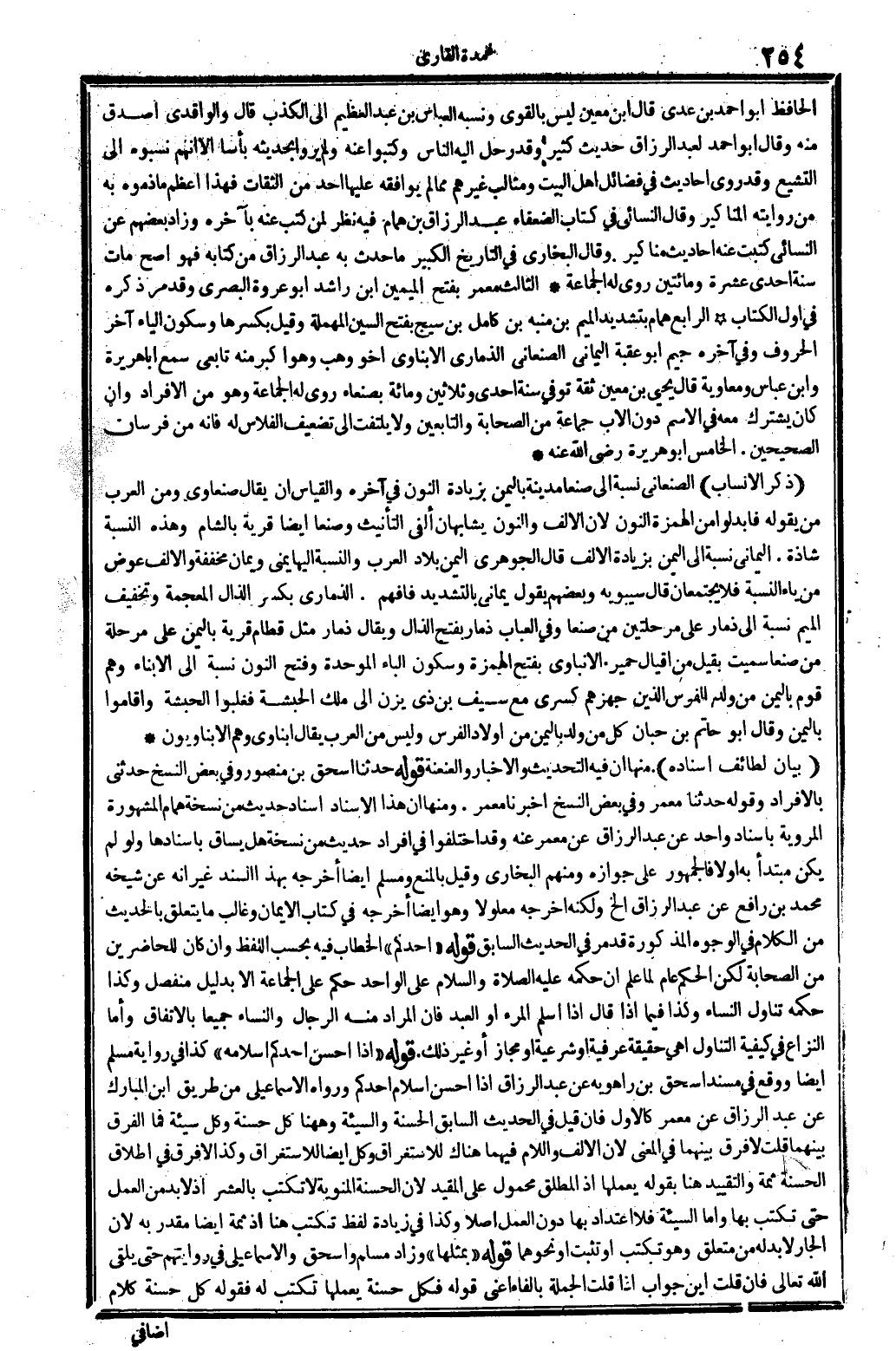 الْحَافِظ أَبُو احْمَد بن عدي، قَالَ ابْن معِين: لَيْسَ بِالْقَوِيّ، وَنسبه الْعَبَّاس بن عبد الْعَظِيم إِلَى الْكَذِب. قَالَ: والواقدي أصدق مِنْهُ. وَقَالَ أَبُو أَحْمد: لعبد الرَّزَّاق حَدِيث كثير، وَقد رَحل إِلَيْهِ النَّاس وَكَتَبُوا عَنهُ، وَلم يرَوا بحَديثه بَأْسا، إلاَّ أَنهم نسبوه إِلَى التَّشَيُّع، وَقد روى أَحَادِيث فِي فَضَائِل أهل الْبَيْت ومثالب غَيرهم مِمَّا لم يُوَافقهُ عَلَيْهَا أحد من الثِّقَات، فَهَذَا أعظم مَا ذموه بِهِ من رِوَايَته الْمَنَاكِير، وَقَالَ النَّسَائِيّ فِي كتاب (الضُّعَفَاء) : عبد الرَّزَّاق بن همام فِيهِ نظر لمن كتب عَنهُ بِآخِرهِ، وَزَاد بَعضهم عَن النَّسَائِيّ: كتبت عَنهُ أَحَادِيث مَنَاكِير. وَقَالَ البُخَارِيّ فِي (التَّارِيخ الْكَبِير) : مَا حدث بِهِ عبد الرَّزَّاق من كِتَابه فَهُوَ أصح، مَاتَ سنة إِحْدَى عشرَة وَمِائَتَيْنِ، روى لَهُ الْجَمَاعَة. الثَّالِث: معمر، بِفَتْح الميمين، ابْن رَاشد، أَبُو عُرْوَة الْبَصْرِيّ، وَقد مر ذكره، فِي أول الْكتاب. الرَّابِع: همام، بتَشْديد الْمِيم، بن مُنَبّه بن كَامِل بن سيج، بِفَتْح السِّين الْمُهْملَة وَقيل بِكَسْرِهَا وَسُكُون الْيَاء آخر الْحُرُوف وَفِي آخِره جِيم، أَبُو عقبَة الْيَمَانِيّ الصَّنْعَانِيّ الذمارِي الأبناوي، أَخُو وهب، وَهُوَ أكبر مِنْهُ، تَابِعِيّ، سمع أَبَا هُرَيْرَة وَابْن عَبَّاس وَمُعَاوِيَة، قَالَ يحيى بن معِين: ثِقَة، توفّي سنة إِحْدَى وَثَلَاثِينَ وَمِائَة بِصَنْعَاء، روى لَهُ الْجَمَاعَة، وَهُوَ من الْأَفْرَاد وَإِن كَانَ يشْتَرك مَعَه فِي الِاسْم دون الْأَب جمَاعَة من الصَّحَابَة وَالتَّابِعِينَ، وَلَا يلْتَفت إِلَى تَضْعِيف الفلاس لَهُ، فَإِنَّهُ من فرسَان الصَّحِيحَيْنِ. الْخَامِس: ابو هُرَيْرَة، رَضِي الله عَنهُ.