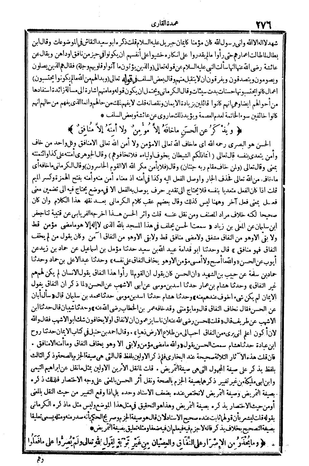 شهد لَا إِلَه الا الله وَإِنِّي رَسُول الله كَانَ مُؤمنا كَإِيمَانِ جِبْرِيل عَلَيْهِ السَّلَام، قلت: ذكره ابو سعيد النقاش فِي (الموضوعات) . وَقَالَ، ابْن بطال: لما طَالَتْ أعمارهم حَتَّى رَأَوْا مَا لم يقدروا على إِنْكَاره خشيوا على أنفسهم أَن يَكُونُوا فِي حيّز من نَافق أَو داهن، وَيُقَال عَن عَائِشَة، رَضِي الله عَنْهَا: إِنَّهَا سَأَلت النَّبِي، عَلَيْهِ السَّلَام، عَن قَوْله تَعَالَى: {وَالَّذين يُؤْتونَ مَا آتوا وَقُلُوبهمْ وَجلة} (الْمُؤْمِنُونَ: 60) فَقَالَ: هم الَّذين يصلونَ وَيَصُومُونَ وَيَتَصَدَّقُونَ ويفرقون ان لَا يتَقَبَّل مِنْهُم، وَقَالَ بعض السّلف فِي قَوْله تَعَالَى: {وبدا لَهُم من الله مَا لم يَكُونُوا يحتسبون} (الزمر: 47) أَعمال كَانُوا يحتسبونها حَسَنَات بَدَت سيئات، وَقَالَ الْكرْمَانِي: وَيحْتَمل أَن يكون قَوْله: وَمَا مِنْهُم إِشَارَة إِلَى مَسْأَلَة زَائِدَة استفادها من أَحْوَالهم أَيْضا، وَهِي: أَنهم كَانُوا قائلين بِزِيَادَة الْإِيمَان ونقصانه. قلت: لَا يفهم ذَلِك من حَالهم، وَإِنَّمَا الَّذِي يفهم من حَالهم أَنهم كَانُوا خَائِفين سوء الخاتمة لعدم الْعِصْمَة، وَيُؤَيّد ذَلِك مَا رُوِيَ عَن عَائِشَة، وَبَعض السّلف.