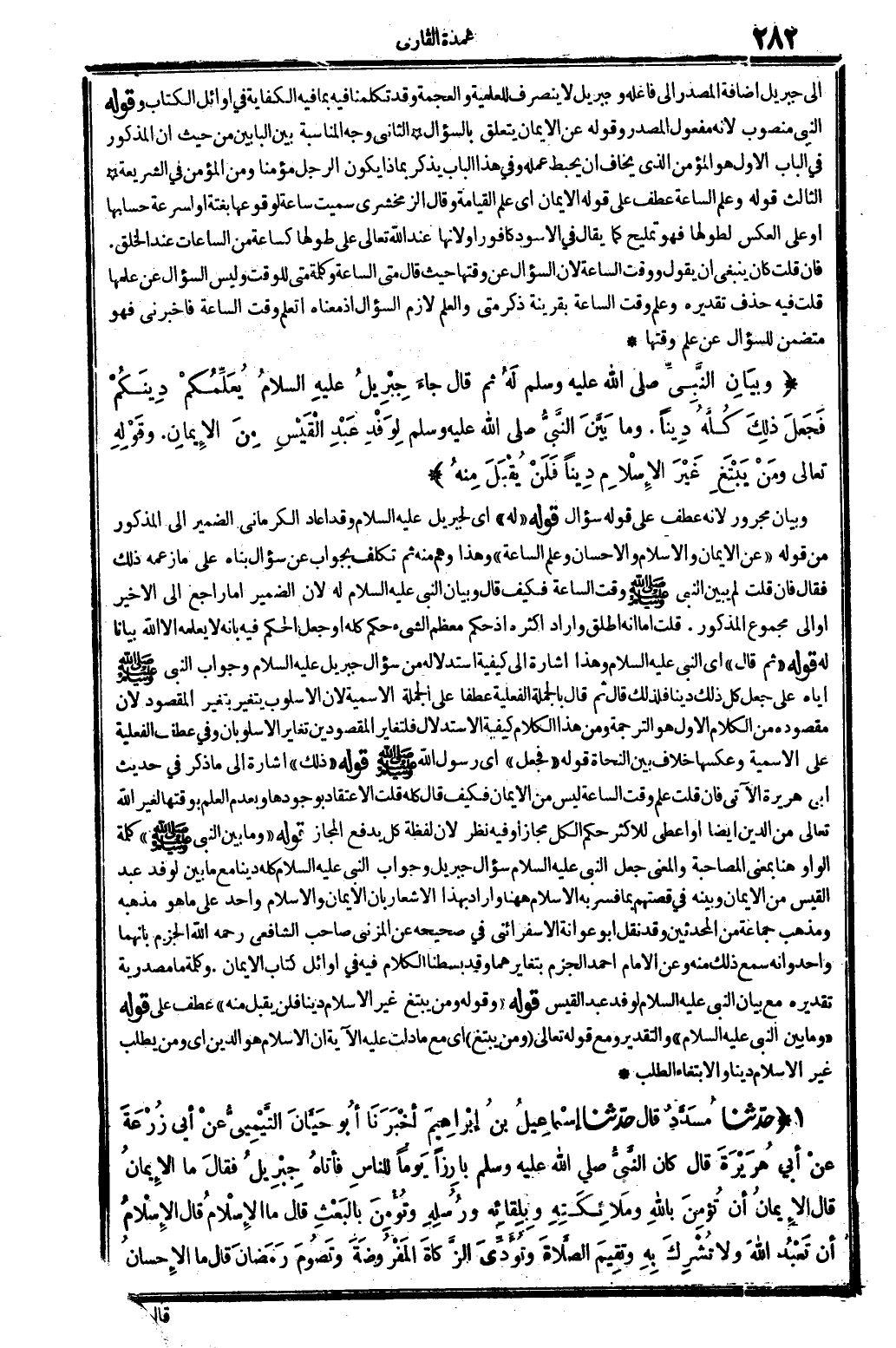 وبيَانِ النَّبِيِّ صلى الله عَلَيْهِ وَسلم لَهُ ثمَّ قَالَ جاءَ جِبْرِيلُ عليهِ السلامُ يُعَلِّمُكمْ دِينَكُمْ فَجَعلَ ذلِكَ كُلَّهُ دِينا. وَمَا بَيَّنَ النَّبيُّ صلى الله عَلَيْهِ وَسلم لِوَفْدِ عَبْدِ الْقَيْسِ مِنَ الإيمانِ. وقَوْلِهِ تَعَالَى {ومَنْ يَبْتَغِ غَيْرَ الإسْلامِ دِينا فَلَنْ يُقْبَلَ مِنهُ} (آل عمرَان: 85) .