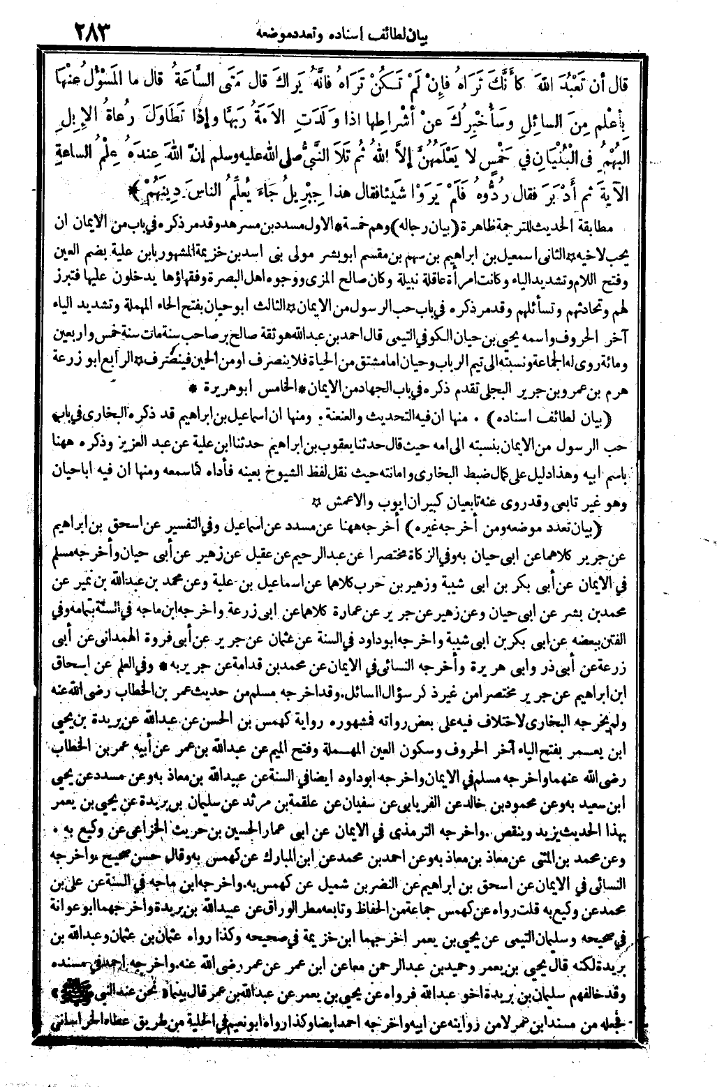 قَالَ أَن تعبد الله كَأَنَّك ترَاهُ فَإِن لم تكن ترَاهُ فَإِنَّهُ يراك قَالَ مَتى السَّاعَة قَالَ مَا المسؤل عَنْهَا بِأَعْلَم من السَّائِل وسأخبرك عَن أشراطها إِذا ولدت الْأمة رَبهَا وَإِذا تطاول رُعَاة الْإِبِل البهم فِي الْبُنيان فِي خمس لَا يعلمهُنَّ إِلَّا الله ثمَّ تَلا النَّبِي صلى الله عَلَيْهِ وَسلم إِن الله عِنْده علم السَّاعَة الْآيَة ثمَّ أدبر فَقَالَ ردُّوهُ فَلم يرَوا شَيْئا فَقَالَ هَذَا جِبْرِيل جَاءَ يعلم النَّاس دينهم) مُطَابقَة الحَدِيث للتَّرْجَمَة ظَاهِرَة (بَيَان رِجَاله) وهم خَمْسَة الأول مُسَدّد بن مسرهد وَقد مر ذكر فِي بَاب من الْإِيمَان أَن يحب لِأَخِيهِ الثَّانِي اسمعيل بن إِبْرَاهِيم بن سهم بن مقسم أَبُو بشر مولى بني اسد بن خُزَيْمَة الْمَشْهُور بِابْن عَلَيْهِ بِضَم الْعين وَفتح اللَّام وَتَشْديد الْيَاء وَكَانَت امْرَأَة عَاقِلَة نبيلة وَكَانَ صَالح الْمزي ووجوه أهل الْبَصْرَة وفقهاؤها يدْخلُونَ عَلَيْهَا فَتبرز لَهُم وتحادثهم وتسأئلهم وَقد مر ذكره فِي بَاب حب الرَّسُول من الْإِيمَان الثَّالِث أَبُو حبَان بِفَتْح الْحَاء الْمُهْملَة وَتَشْديد الْيَاء آخر الْحُرُوف واسْمه يحيى بن حَيَّان الْكُوفِي فِي التَّيْمِيّ قَالَ أَحْمد بن عبد الله هُوَ ثِقَة صَالح بر صَاحب سنة مَاتَ سنة خمس وَأَرْبَعين وَمِائَة روى لَهُ الْجَمَاعَة ونسبته إِلَى تيم الربَاب وحيان أما مُشْتَقّ من الْحَيَاة فَلَا ينْصَرف أَو من الْحِين فَيَنْصَرِف الرَّابِع أَبُو زرْعَة هرم بن عَمْرو بن جرير البجلى تقدم ذكره فِي بَاب الْجِهَاد من الْإِيمَان الْخَامِس أَبُو هُرَيْرَة (بَيَان لطائف اسناده) . مِنْهَا أَن التحديث والعنعة. وَمِنْهَا أَن إِسْمَاعِيل بن إِبْرَاهِيم قد ذكره البُخَارِيّ فِي بَاب حب الرَّسُول من الْإِيمَان بنسبته إِلَى أمه حَيْثُ قَالَ حَدثنَا يَعْقُوب بن إِبْرَاهِيم حَدثنَا ابْن علية عَن عبد الْعَزِيز وَذكره هَهُنَا باسم أَبِيه وَهَذَا دَلِيل على كال ضبط البُخَارِيّ وأمانته حَيْثُ نقل لفظ الشُّيُوخ بِعَيْنِه فأداه كَمَا سَمعه وَمِنْهَا أَن فِيهِ أَبَا حَيَّان وَهُوَ غير تَابِعِيّ وَقد روى عَنهُ تابعيان كَبِير أَن أَيُّوب وَالْأَعْمَش (بَيَان تعدد مَوْضِعه وَمن أخرجه غَيره) أخرجه هَهُنَا عَن مُسَدّد عَن إِسْمَاعِيل وَفِي التَّفْسِير عَن إِسْحَاق بن إِبْرَاهِيم عَن جرير كِلَاهُمَا عَن ابي حَيَّان وَفِي الزَّكَاة مُخْتَصرا عَن عبد الرَّحِيم عَن عقيل عَن زُهَيْر عَن أبي حَيَّان أخرجه مُسلم فِي الْإِيمَان عَن أبي بكر بن أبي شيبَة وَزُهَيْر بن حَرْب كِلَاهُمَا عَن إِسْمَاعِيل بن علية وَعَن مُحَمَّد بن عبد الله بن نمير عَن مُحَمَّد بن بشر عَن ابي حَيَّان وَعَن زُهَيْر عَن جرير عَن عمَارَة كِلَاهُمَا عَن أبي زرْعَة وَأخرجه ابْن مَاجَه فِي السّنة بِتَمَامِهِ وَفِي الْفِتَن بِبَعْضِه عَن أبي بكر بن أبي شيبَة وَأخرجه أَبُو دَاوُد فِي السّنة عَن عُثْمَان عَن جرير عَن أبي فَرْوَة الهمذاني عَن أبي زرْعَة عَن أبي ذَر وَأبي هُرَيْرَة وَأخرجه النَّسَائِيّ فِي الْإِيمَان عَن مُحَمَّد بن قدامَة عَن جريرية وَفِي الْعلم عَن إِسْحَاق ابْن إِبْرَاهِيم عَن جرير مُخْتَصرا من غير ذكر سُؤال السَّائِل وَقد أخرجه مُسلم من حَدِيث عمر بن الْخطاب رَضِي الله عَنهُ وَلم يُخرجهُ البُخَارِيّ لاخْتِلَاف فِيهِ على بعض رُوَاته فمشهوره رِوَايَة كهمس بن الْحسن عَن عبد الله عَن بُرَيْدَة يحيى ابْن يعمر بِفَتْح الْيَاء آخر الْحُرُوف وَسُكُون الْعين الْمُهْملَة وَفتح الْمِيم عَن عبد الله بن عمر عَن أَبِيه عمر بن الْخطاب رَضِي الله عَنْهُمَا وَأخرجه مُسلم فِي الْإِيمَان وَأخرجه أَبُو دَاوُد أَيْضا فِي السّنة عَن عبيد الله بن معَاذ بِهِ وَعَن مُسَدّد عَن يحيى ابْن سعيد بِهِ وَعَن مَحْمُود بن خَالِد عَن الْفرْيَابِيّ عَن سُفْيَان عَن عَلْ