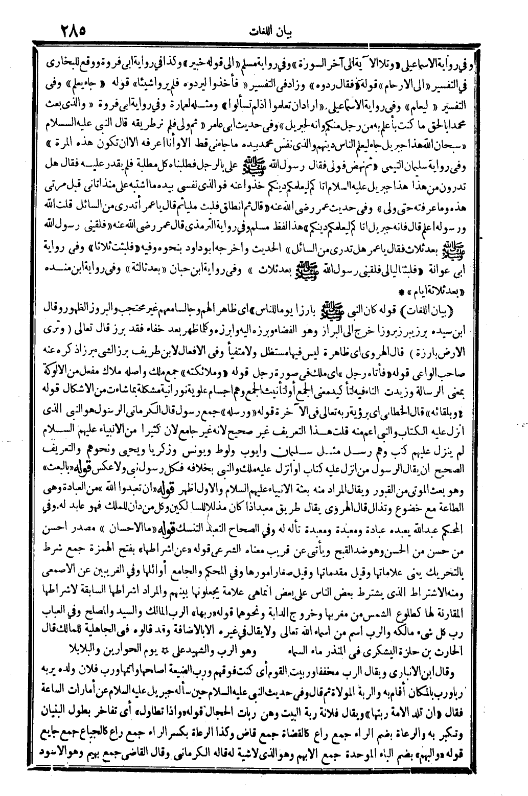 وَفِي رِوَايَة الْإِسْمَاعِيلِيّ " وتلا الْآيَة إِلَى آخر السُّورَة " وَفِي رِوَايَة مُسلم " إِلَى قَوْله خَبِير " وَكَذَا فِي رِوَايَة أبي فَرْوَة وَوَقع البُخَارِيّ فِي التَّفْسِير " إِلَى الارحام " قَوْله " فَقَالَ ردُّوهُ " وَزَاد فِي التَّفْسِير " فَأخذُوا ليردوه فَلم يرَوا شَيْئا " قَوْله " جَاءَ يعلم " وَفِي التَّفْسِير " ليعلم " وَفِي رِوَايَة الْإِسْمَاعِيلِيّ " أَرَادَ أَن تعلمُوا إِذْ لم تسألوا " وَمثله لعمارة وَفِي رِوَايَة أبي فَرْوَة " وَالَّذِي بعث مُحَمَّد بِالْحَقِّ مَا كنت بِأَعْلَم بِهِ من رجل مِنْكُم وَإنَّهُ لجبريل " وَفِي حَدِيث أبي عَامر " ثمَّ ولي فَلم نر طَريقَة قَالَ النَّبِي عَلَيْهِ السَّلَام " سُبْحَانَ الله هَذَا جِبْرِيل جَاءَ ليعلم النَّاس دينهم وَالَّذِي نفس مُحَمَّد بِيَدِهِ مَا جَاءَ فِي قطّ إِلَّا وَأَنا أعرفهُ إِلَّا أَن تكون هَذِه الْمرة " وَفِي رِوَايَة سُلَيْمَان التَّيْمِيّ " ثمَّ نَهَضَ فولى فَقَالَ رَسُول الله صلى الله عَلَيْهِ وَسلم على بِالرجلِ فطلبناه كل مطلبة فَلم يقدر عَلَيْهِ فَقَالَ هَل تَدْرُونَ من هَذَا هَذَا جِبْرِيل عَلَيْهِ السَّلَام أَتَاكُم ليعلمكم دينكُمْ خُذُوا عَنهُ فوالذي نَفسِي بِيَدِهِ مَا اشْتبهَ على مُنْذُ اتاني قبل مرتى هَذِه وَمَا عَرفته حَتَّى ولى " وَفِي حَدِيث عمر رَضِي الله عَنهُ " قَالَ ثمَّ انْطلق فَلبث مَلِيًّا ثمَّ قَالَ يَا عمر أَتَدْرُونَ من السَّائِل قلت الله وَرَسُوله اعْلَم قَالَ فَإِنَّهُ جِبْرِيل أَتَاكُم ليعلمكم دينكُمْ " هَذَا لفظ مُسلم وَفِي رِوَايَة التِّرْمِذِيّ قَالَ عمر رَضِي الله عَنهُ " فلقيني رَسُول الله صلى الله عَلَيْهِ وَسلم بعد ثَلَاث فَقَالَ يَا عمر هَل تَدْرِي من السَّائِل " الحَدِيث وَأخرجه أَبُو دَاوُد بِنَحْوِهِ وَفِيه " فَلبث ثَلَاثًا " وَفِي رِوَايَة أبي عوَانَة " فلبثا ليَالِي فلقيني رَسُول الله صلى الله عَلَيْهِ وَسلم بعد ثَلَاث " وَفِي رِوَايَة ابْن حبَان " بعد ثَالِثَة " وَفِي رِوَايَة ابْن مندة " بعد ثَلَاثَة أَيَّام " (بَيَان اللُّغَات) قَوْله كَانَ النَّبِي صلى الله عَلَيْهِ وَسلم بارزا يَوْمًا للنَّاس " أَي ظَاهر الْهم وجالسا مَعَهم غير محتجب والبروز الظُّهُور وَقَالَ ابْن سَيّده برزيبر زبروزا خرج إِلَى الْبَزَّار وَهُوَ الفضاء وبرزه إِلَيْهِ وابرزه وَكلما ظهر بعد خَفَاء فقد برز قَالَ تَعَالَى (وَترى الأَرْض بارزة) قَالَ الْهَرَوِيّ أَي ظَاهره لَيْسَ فِيهَا مستظل وَلَا متفيأ وَفِي الافعال لِابْنِ ظريف برز الشَّيْء برزا ذكره عَنهُ صَاحب الواعي قَوْله " فَأَتَاهُ رجل " أَي ملك فِي صُورَة رجل قَوْله " وَمَلَائِكَته " جمع ملك واصلة ملاك مفعل من الالوكة بِمَعْنى الرسَالَة وزيدت لاتاءفية لتأكيد معنى الْجمع أَو التَّأْنِيث الْجمع وهم اجسام علوِيَّة نورنية مشكلة بِمَا شَاءَت من الاشكال قَوْله " وبلقائه " قَالَ الْخطابِيّ ي بِرُؤْيَة ربه تَعَالَى فِي الْآخِرَة قَوْله " وَرُسُله " جمع رَسُول قَالَ الْكرْمَانِي الرَّسُول هُوَ النَّبِي الَّذِي انْزِلْ عَلَيْهِ الْكتاب وَالنَّبِيّ اعم مِنْهُ قلت هَذَا التَّعْرِيف غير صَحِيح لِأَنَّهُ غير جَامع لِأَن كثير من الانبياء عَلَيْهِم السَّلَام لم ينزل عَلَيْهِم كتب وهم ورسل مثل سُلَيْمَان وَأَيوب وَلُوط وَيُونُس وزَكَرِيا ويحي وَنَحْوهم والتعريف الصَّحِيح أَن يُقَال الرَّسُول من انْزِلْ عَلَيْهِ كتاب أَو أنزل عَلَيْهِ ملك وَالنَّبِيّ بِخِلَافِهِ فَكل رَسُول نَبِي وَلَا عكس قَوْله " بِالْبَعْثِ " وَهُوَ بعث الْمَوْتَى من الْقُبُور وَيُقَال المُرَاد مِنْهُ بعثة الْأَنْبِيَاء عَلَيْهِم السَّلَام وَالْأول اظهر قَوْله " أَن تعبدوا الله " من الْعِبَادَة وَهِي الطَّاعَة مَعَ خضوع وتذلل قَالَ الْهَرَوِيّ يُقَال طَرِيق معبد إِذا كَانَ مذللا للسالكين وكل من دَان للْملك فَهُوَ عَابِد لَهُ. وَفِي ا