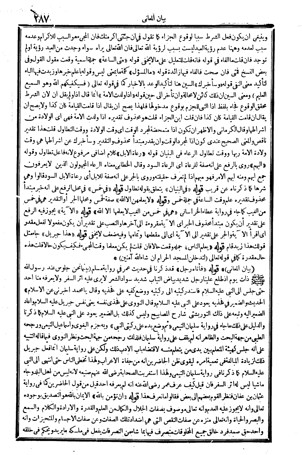 وَيَنْبَغِي أَن يكون فعل الشَّرْط سَببا لوُقُوع الْجَزَاء كَمَا تَقول فِي إِن جئتني أكرمتك فَإِن الْمَجِيء هُوَ السَّبَب للاكرام وَعَدَمه سَبَب لعدمه وَهَهُنَا عدم رُؤْيَة العَبْد لَيست بِسَبَب لرؤية الله تَعَالَى يرَاهُ سَوَاء وجدت من العَبْد رُؤْيَة أولم تُوجد فَإِن قلت مَا الْفَاء فِي قَوْله فَإِن قلت للتَّعْلِيل على مَا لَا يخفى قَوْله " مَتى السَّاعَة " جملَة اسمية وَقعت مقول القَوْل وَفِي بعض النّسخ فَمَتَى فَإِن صحت فالفاء فِيهَا زَائِدَة قَوْله " ماالمسؤل " كلمة مَا بِمَعْنى لَيْسَ وَقَوله باعلم خَبَرهَا وزيدت فِيهَا الْبَاء لتأكيد معنى النَّفْي قَوْله " وسأخبرك " السِّين هُنَا لتأكيد الْوَعْد بالإخبار كَمَا فِي قَوْله تَعَالَى {فَسَيَكْفِيكَهُم الله وَهُوَ السَّمِيع الْعَلِيم} وَمعنى السِّين إِن ذَلِك كَائِن لَا محَالة وَإِن تَأَخّر إِلَى حِين قَوْله " إِذا ولدت الْأمة " إِنَّمَا قَالَ إِذا وَلم يقل أَن لَان الشَّرْط مُحَقّق الْوُقُوع فجَاء بِلَفْظ إِذا الَّتِي للجزم بِوُقُوع مدخولها فَلهَذَا يَصح أَن يُقَال إِذا قَامَت الْقِيَامَة كَانَ كَذَا وَلَا يَصح أَن يُقَال إِن قَامَت الْقِيَامَة كَانَ كَذَا فَإِن قلت أَيْن الْجَزَاء قلت هُوَ مَحْذُوف تَقْدِيره إِذا ولدت الْأمة فَهِيَ أَي الْولادَة من أشراطها وَقَالَ الْكرْمَانِي وَإِذا ظهر أَن تكون إِذا متمحضة لمُجَرّد الْوَقْت ي وَقت الْولادَة وَوقت التطاول قلت هَذَا تَقْدِير نَاقص وَالْمعْنَى الصَّحِيح عِنْدِي كَون إِذا لمُجَرّد الْوَقْت أَي وَقت الْولادَة وَوقت التطاول قلت هَذَا تَقْدِير نَاقص وَالْمعْنَى الصَّحِيح عِنْدِي كَون إِذا لمُجَرّد الْوَقْت وَأَن يقدر مُبْتَدأ مَحْذُوف وَالتَّقْدِير وسأخبرك عَن اشراطها هِيَ وَقت ولادَة الْأمة رَبهَا وَوقت تطاول الرعاء فِي الْبُنيان قَوْله " رُعَاة الْإِبِل " كَلَام اضافي مَرْفُوع لِأَنَّهُ فَاعل تطاول وَقَوله " البهم " روى بِالرَّفْع على أَنه صفة للرعاة أى الرُّعَاة السود وَقَالَ الْخطابِيّ مَعْنَاهُ الرُّعَاة المجهولون الَّذين لَا يعْرفُونَ جمع ابهم وَمِنْه ابهم الْأَمر فَهُوَ مُبْهَم إِذا لم تعرف حَقِيقَته وروى بِالْجَرِّ على أَنه صفة لِلْإِبِلِ أى رُعَاة الْإِبِل السود قَالُوا وَهِي شَرها كَمَا ذَكرْنَاهُ عَن قريب قَوْله " فِي الْبُنيان " يتَعَلَّق بقوله تطاول قَوْله " فِي خمس " فِي مَحل الرّفْع على أَنه خبر مُبْتَدأ مَحْذُوف تَقْدِيره علم وَقت السَّاعَة فِي جملَة خمس وَقَوله " لَا يعلمهُنَّ إِلَّا الله " صفة لخمس ومحلها الْجَرّ أَو التَّقْدِير هِيَ فِي خمس من الْغَيْب كَمَا جَاءَ فِي رِوَايَة عَطاء الْخُرَاسَانِي " هِيَ فِي خمس من الْغَيْب لَا يعلمهَا إِلَّا الله " قَوْله " الْآيَة " يجوز فِيهِ الرّفْع على تَقْدِير أَن يكون مُبْتَدأ مَحْذُوف الْخَبَر أَي الْآيَة مقروء إِلَى آخرهَا وَالنّصب على تَقْدِير أَن يكون مَفْعُولا لفعل مُقَدّر أَي اقْرَأ الْآيَة ة والجر على تَقْدِير إِلَى الْآيَة أَي إِلَى مقطعها وتمامها وَفِيه ضعف لَا يخفي قَوْله " هَذَا جِبْرِيل " جَاءَ مثل قَوْلك هَذَا وَيَد قَامَ قَوْله " يعلم النَّاس " جملَة وَقعت حَالا فَإِن قلت لم يكن معلما وَقت المجىء فَكيف يكون حَالا قلت هَذِه حَال مقرة كَمَا فِي قَوْله تَعَالَى {لتدخلن الْمَسْجِد الْحَرَام إِن شَاءَ الله آمِنين} (بَيَان الْمعَانِي) قَوْله " فَأَتَاهُ رجل " قد ذكرنَا فِي حَدِيث عمر فِي رِوَايَة مُسلم (بَيْنَمَا نَحن جُلُوس عِنْد رَسُول الله صلى الله عَلَيْهِ وَسلم ذَات يَوْم غذ طلع علينا رجل شَدِيد بَيَاض الثِّيَاب شَدِيد سَواد الشّعْر لَا يرى عَلَيْهِ أثر السّفر وَلَا يعرفهُ منا أحد حَتَّى جلس إِلَى النَّبِي عَلَيْهِ السَّلَام فاسند رُكْبَتَيْهِ إِلَى رُكْبَتَيْهِ وَوضع كفيه على فَخذيهِ وَقَالَ يَا مُحَمَّد أَخْبرنِي عَن الْإِسْلَام " الحَدِيث وَا