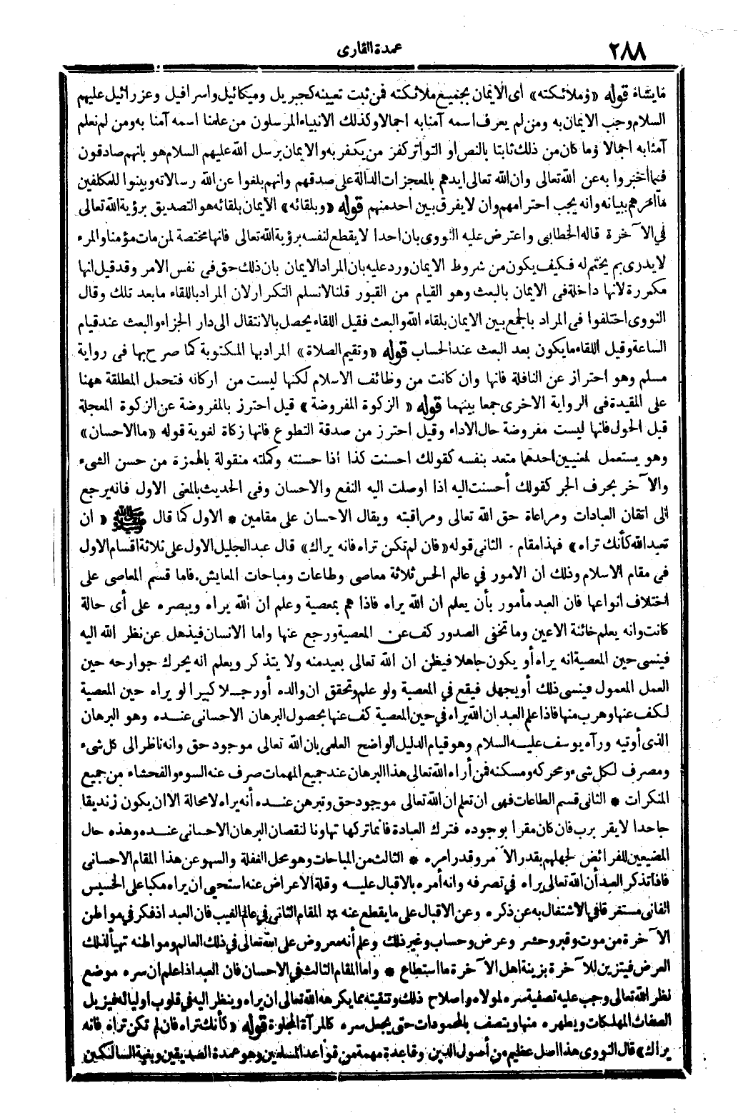 مَا يَشَاء قَوْله " وَمَلَائِكَته " أَي الْإِيمَان بِجَمِيعِ مَلَائكَته فَمن ثَبت تَعْيِينه كجبريل وَمِيكَائِيل وإسرافيل وعزرائيل عَلَيْهِم السَّلَام وَجب الْإِيمَان بِهِ وَمن لم يعرف اسْمه آمنا بِهِ اجمالا وَكَذَلِكَ الانبياء المُرْسَلُونَ من علمنَا آمنا بِهِ وَمن لم نعلم آمنا بِهِ اجمالا وَمَا كَانَ من ذَلِك ثَابتا بِالنَّصِّ أَو التَّوَاتُر كفر من يكفر بِهِ والايمان برسل الله عَلَيْهِم السَّلَام هُوَ بِأَنَّهُم صَادِقُونَ فِيمَا اخبروا بِهِ عَن الله تَعَالَى وَأَن الله تَعَالَى أَيّدهُم بالمعجزات الدَّالَّة على صدقهم وَأَنَّهُمْ بلغُوا عَن الله رسالاته وبينوا للمكلفين مَا آمُرهُم ببيانه وَأَنه يجب احترامهم وَإِن لَا يفرق بَين أحد مِنْهُم قَوْله " وبلقائه " الْأَيْمَان بلقائه هُوَ التَّصْدِيق بِرُؤْيَة الله تَعَالَى فِي الْآخِرَة قَالَه الْخطابِيّ وَاعْترض عَلَيْهِ النَّوَوِيّ بِأَن أحدا لَا يقطع لنَفسِهِ بِرُؤْيَة الله تَعَالَى فَأَنَّهَا مُخْتَصَّة لمن مَاتَ مُؤمنا والمرء لَا يدْرِي بِمَ يخْتم لَهُ فَكيف يكون من شُرُوط الْإِيمَان ورد عَلَيْهِ بَان المُرَاد الْإِيمَان بَان ذَلِك حق فِي نفس الْأَمر وَقد قيل أَنَّهَا مكررة لِأَنَّهَا دَاخِلَة فِي الْإِيمَان بِالْبَعْثِ وَهُوَ الْقيام من الْقُبُور قُلْنَا لَا نسلم التّكْرَار لِأَن المُرَاد باللقاء مَا بعد تِلْكَ وَقَالَ النَّوَوِيّ اخْتلفُوا فِي المُرَاد بِالْجمعِ بَين الْإِيمَان بلقاء الله والبعث فَقيل اللِّقَاء يحصل بالانتقال إِلَى دَار الْجَزَاء والبعث عِنْد قيام السَّاعَة وَقيل اللِّقَاء مَا يكون بعد الْبَعْث عِنْد الْحساب قَوْله " وتقيم الصَّلَاة " المُرَاد بهَا الْمَكْتُوبَة كَمَا صرح بهَا فِي رِوَايَة مُسلم وَهُوَ احْتِرَاز عَن النَّافِلَة فَإِنَّهَا وَأَن كَانَت من وظائف الْإِسْلَام لَكِنَّهَا لَيست من أَرْكَانه فَتحمل الْمُطلقَة هَهُنَا على الْمقيدَة فِي الرِّوَايَة الْأُخْرَى جمعا بَيْنَمَا قَوْله " الزكوة الْمَفْرُوضَة " قيل احْتَرز بالمفروضة عَن الزكوة المعجلة قبل الْحول فَإِنَّهَا لَيست مَفْرُوضَة حَال الإداء وَقيل احْتَرز من صَدَقَة التَّطَوُّع فَإِنَّهَا زَكَاة لغوية قَوْله " مَا الْإِحْسَان " وَهُوَ يسْتَعْمل لمعنيين احدهما مُتَعَدٍّ بِنَفسِهِ كَقَوْلِك احسنت كَذَا إِذا حسنته وكملته منقولة بِالْهَمْزَةِ من حسن الشَّيْء وَالْآخر بِحرف الْجَرّ كَقَوْلِك أَحْسَنت إِلَيْهِ إِذا أوصلت إِلَيْهِ النَّفْع وَالْإِحْسَان وَفِي الحَدِيث بِالْمَعْنَى الأول فَإِنَّهُ يرجع إِلَى اتقان الْعِبَادَات ومراعاة حق الله تَعَالَى ومراقبته وَيُقَال الْإِحْسَان على مقامين الأول كَمَا قَالَ صلى الله عَلَيْهِ وَسلم " إِن تعبد الله كَأَنَّك ترَاهُ " فَهَذَا مقَام. الثَّانِي قَوْله " فَإِن لم تكن ترَاهُ فَإِنَّهُ يراك " قَالَ عبد الْجَلِيل الأول على ثَلَاثَة أَقسَام الأول فِي مقَام الْإِسْلَام وَذَلِكَ أَن الْأُمُور فِي عَالم الْحسن ثَلَاثَة معاصي وطاعات ومباحات المعايش فَأَما قسم الْمعاصِي على اخْتِلَاف أَنْوَاعهَا فَإِن العَبْد مَأْمُور بِأَن يعلم أَن الله يرَاهُ فَإِذا هم بِمَعْصِيَة وَعلم أَن الله يرَاهُ ويبصره على أَي حَالَة كَانَت وَأَنه يعلم خائنه الْأَعْين وَمَا تخفى الصُّدُور كف عَن الْمعْصِيَة وَرجع عَنْهَا وَأما الأنسان فيذهل عَن نظر الله إِلَيْهِ فينسى حِين الْمعْصِيَة أَنه يرَاهُ أَو يكون جَاهِلا فيظن أَن الله تَعَالَى بعيد مِنْهُ وَلَا يتَذَكَّر وَيعلم أَنه يُحَرك جوارحه حِين الْعَمَل الْمَعْمُول فينسى ذَلِك أَو يجهل فَيَقَع فيا لمعصية وَلَو علم وَتحقّق أَن وَالِده أَو رجلا كَبِيرا لَو يرَاهُ حِين الْمعْصِيَة لكف عَنْهَا وهرب مِنْهَا فَإِذا علم العَبْد أَن الله يرَاهُ فِي حِين الْمعْصِيَة كف عَنْهَا بِحُصُول الْبُرْهَان الإحساني عِ