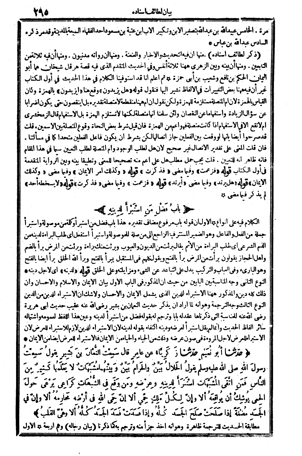 الْكَلَام فِيهِ على أَنْوَاع. الأول: أَن قَوْله: بَاب، مَرْفُوع مُضَاف تَقْدِيره: هَذَا بَاب فضل من اسْتَبْرَأَ، وَكلمَة: من، مَوْصُولَة، و: اسْتَبْرَأَ، جملَة من الْفِعْل وَالْفَاعِل، وَهُوَ الضَّمِير الْمُسْتَتر فِيهِ الرَّاجِع إِلَى: من، صلَة للموصولة. و: اسْتَبْرَأَ، استفعل، أَي: طلب الْبَرَاءَة لدينِهِ من الذَّم الشَّرْعِيّ، أَي: طلب الْبَرَاءَة من الْإِثْم. يُقَال: بَرِئت من الدُّيُون والعيوب، وبرئت مِنْك بَرَاءَة، وبرئت من الْمَرَض بُرأ، بِالضَّمِّ، وَأهل الْحجاز يَقُولُونَ: برأت من الْمَرَض برأَ، بِالْفَتْح، وَيَقُول كلهم فِي الْمُسْتَقْبل: يبرأ بِالْفَتْح، وبرأ الله الْخلق برأَ أَيْضا، بِالْفَتْح، وَهُوَ البارىء. وَفِي (الْعباب) : والتركيب يدل على التباعد عَن الشَّيْء ومزايلته، وعَلى الْخلق. قَوْله: (لدينِهِ) أَي لأجل دينه. النَّوْع الثَّانِي: وَجه الْمُنَاسبَة بَين الْبَابَيْنِ من حَيْثُ إِن الْمَذْكُور فِي الْبَاب الأول بَيَان الْإِيمَان وَالْإِسْلَام وَالْإِحْسَان، وَإِن ذَلِك كُله دين، وَالْمَذْكُور هَهُنَا الِاسْتِبْرَاء للدّين الَّذِي يَشْمَل الْإِيمَان وَالْإِحْسَان، وَلَا شكّ أَن الِاسْتِبْرَاء للدّين من الدّين. النَّوْع الثَّالِث: وَجه التَّرْجَمَة وَهُوَ أَنه لما أَرَادَ أَن يذكر حَدِيث النُّعْمَان بن بشير، رَضِي الله عَنهُ، عقيب حَدِيث أبي هُرَيْرَة، رَضِي الله عَنهُ، للمناسبة الَّتِي ذَكرنَاهَا، عقد لَهُ بَابا. وَترْجم لَهُ بقوله: فضل من اسْتَبْرَأَ لدينِهِ، وَعين هَذَا اللَّفْظ لعمومه واشتماله سَائِر أَلْفَاظ الحَدِيث، وَإِنَّمَا لم يقل: اسْتَبْرَأَ لعرضه وَدينه، اكْتِفَاء بقوله: دينه، لِأَن الِاسْتِبْرَاء للدّين لَازم للاستبراء للعرض لِأَن الِاسْتِبْرَاء للعرض لأجل الْمُرُوءَة فِي صون عرضه، وَذَلِكَ من الْحيَاء، وَالْحيَاء من الْإِيمَان، فالاستبراء للعرض أَيْضا من الْإِيمَان.