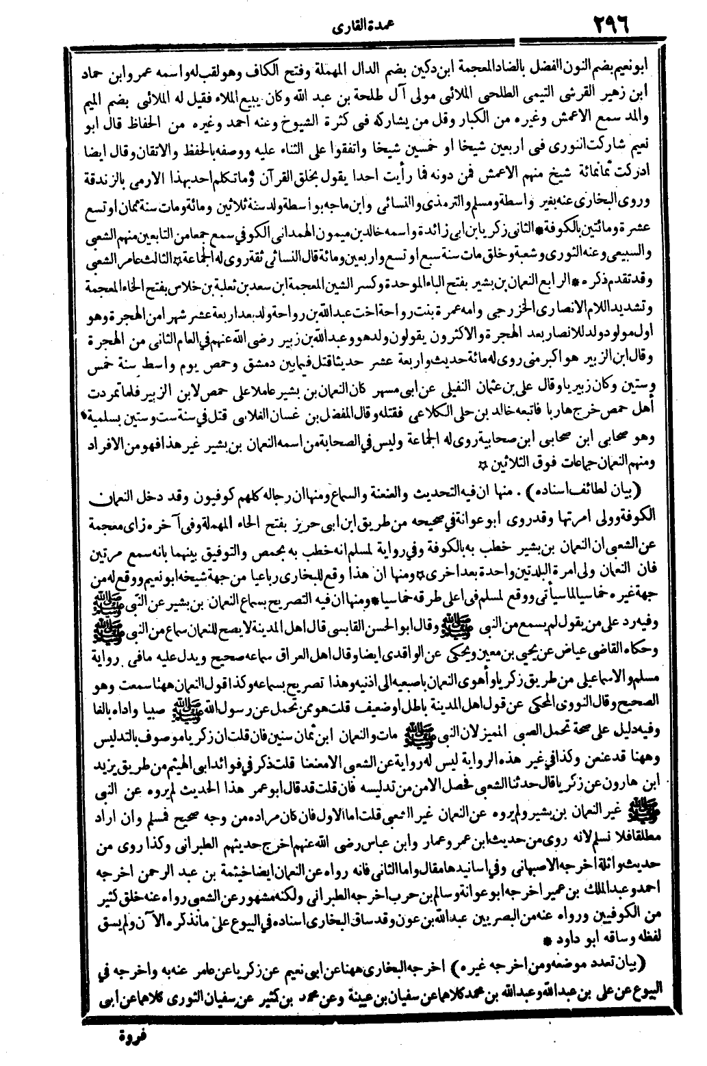 أَبُو نعيم، بِضَم النُّون، الْفضل، بالضاد الْمُعْجَمَة، ابْن دُكَيْن، بِضَم الدَّال الْمُهْملَة وَفتح الْكَاف، وَهُوَ لقب لَهُ، واسْمه عَمْرو ابْن حَمَّاد بن زُهَيْر الْقرشِي التَّيْمِيّ الطلحي الْملَائي، مولى آل طَلْحَة بن عبد الله، وَكَانَ يَبِيع الملاء فَقيل لَهُ: الْملَائي، بِضَم الْمِيم وَالْمدّ. سمع الْأَعْمَش وَغَيره من الْكِبَار، وَقل من يُشَارِكهُ فِي كَثْرَة الشُّيُوخ، وَعنهُ أَحْمد وَغَيره من الْحفاظ. قَالَ أَبُو نعيم: شاركت الثَّوْريّ فِي أَرْبَعِينَ شَيخا أَو خمسين شَيخا، وَاتَّفَقُوا على الثَّنَاء عَلَيْهِ، وَوَصفه بِالْحِفْظِ والاتقان. وَقَالَ أَيْضا: أدْركْت ثَمَانمِائَة شيخ، مِنْهُم الْأَعْمَش فَمن دونه، فَمَا رَأَيْت أحدا يَقُول بِخلق الْقُرْآن، وَمَا تكلم أحد بِهَذَا إلاَّ رُمِيَ بالزندقة. وروى البُخَارِيّ عَنهُ بِغَيْر وَاسِطَة، وَمُسلم وَالتِّرْمِذِيّ وَالنَّسَائِيّ وَابْن مَاجَه بِوَاسِطَة، ولد سنة ثَلَاثِينَ وَمِائَة، وَمَات سنة ثَمَان، أَو: تسع عشرَة وَمِائَتَيْنِ بِالْكُوفَةِ. الثَّانِي: زَكَرِيَّا بن أبي زَائِدَة، واسْمه: خَالِد بن مَيْمُون الْهَمدَانِي الْكُوفِي، سمع جمعا من التَّابِعين مِنْهُم الشّعبِيّ والسبيعي، وَعنهُ الثَّوْريّ وَشعْبَة وَخلق، وَمَات سنة سبع أَو تسع وَأَرْبَعين وَمِائَة. قَالَ النَّسَائِيّ: ثِقَة، روى لَهُ الْجَمَاعَة. الثَّالِث: عَامر الشّعبِيّ وَقد تقدم ذكره. الرَّابِع: النُّعْمَان بن بشير، بِفَتْح الْبَاء الْمُوَحدَة وَكسر الشين الْمُعْجَمَة، ابْن سعد بن ثَعْلَبَة بن خلاس، بِفَتْح الْخَاء الْمُعْجَمَة وَتَشْديد اللَّام، الْأنْصَارِيّ الخزرجي، وَأمه عمْرَة بنت رَوَاحَة أُخْت عبد الله بن رَوَاحَة، ولد بعد أَرْبَعَة عشر شهرا من الْهِجْرَة، وَهُوَ أول مَوْلُود ولد للْأَنْصَار بعد الْهِجْرَة وَالْأَكْثَرُونَ يَقُولُونَ: ولد هُوَ وَعبد الله بن الزبير، رَضِي الله عَنْهُم، فِي الْعَام الثَّانِي من الْهِجْرَة، وَقَالَ ابْن الزبير: هُوَ أكبر مني، رُوِيَ لَهُ مائَة حَدِيث وَأَرْبَعَة عشر حَدِيثا، قتل فِيمَا بَين دمشق وحمص يَوْم وَاسِط سنة خمس وَسِتِّينَ، وَكَانَ زبيريا، وَقَالَ عَليّ بن عُثْمَان النُّفَيْلِي، عَن أبي مسْهر: كَانَ النُّعْمَان بن بشير عَاملا على حمص لِابْنِ الزبير، لما تمردت أهل حمص خرج هَارِبا، فَاتبعهُ خَالِد بن حلى الكلَاعِي فَقتله، وَقَالَ الْمفضل بن غَسَّان الْغلابِي: قتل فِي سنة سِتّ وَسِتِّينَ بسلمية وَهُوَ صَحَابِيّ ابْن صَحَابِيّ ابْن صحابية، روى لَهُ الْجَمَاعَة، وَلَيْسَ فِي الصَّحَابَة من اسْمه النُّعْمَان بن بشير غير هَذَا، فَهُوَ من الْأَفْرَاد، وَمِنْهُم: النُّعْمَان، جماعات فَوق الثَّلَاثِينَ.