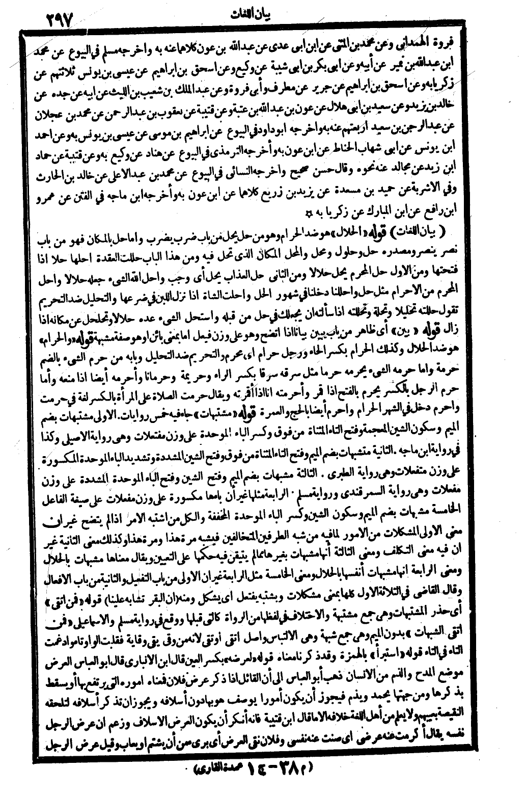 بَيَان اللُّغَات: قَوْله: (الْحَلَال) هُوَ ضد الْحَرَام وَهُوَ من: حل يحل من بَاب ضرب يضْرب، وَأما حلَّ بِالْمَكَانِ فَهُوَ من بَاب: نصر ينصر، ومصدره: حل وحلول وَمحل، وَالْمحل: الْمَكَان الَّذِي تحل فِيهِ، وَمن هَذَا الْبَاب: حللت الْعقْدَة أحلهَا حلا إِذا فتحتها، وَمن الأول: حل الْمحرم يحل حَلَالا، وَمن الثَّانِي: حل الْعَذَاب يحل، أَي: وَجب، وَأحل الله الشَّيْء: جعله حَلَالا وَأحل الْمحرم من الْإِحْرَام مثل: حل، وأحللنا، دَخَلنَا فِي شهور الْحل، وَأحلت الشَّاة: إِذا نزل اللَّبن فِي ضرْعهَا، والتحليل ضد التَّحْرِيم، تَقول: حللته تحليلاً وتحلة وتحللته إِذا سَأَلته أَن يجعلك فِي حل من قبله، واستحل الشَّيْء عده حَلَالا، وتحلحل عَن مَكَانَهُ إِذا زَالَ. قَوْله: (بَين) أَي ظَاهر، من بَاب: يبين بَيَانا إِذا اتَّضَح، وَهُوَ على وزن: فيعل، إِمَّا بِمَعْنى بَائِن، أَو هُوَ صفة مشبهة. قَوْله: (وَالْحرَام) ، هُوَ ضد الْحَلَال، وَكَذَلِكَ الْحَرَام، بِكَسْر الْحَاء، وَرجل حرَام: أَي محرم، وَالتَّحْرِيم ضد التَّحْلِيل، وبابه من حرم الشَّيْء، بِالضَّمِّ، حُرْمَة. وَأما حرمه الشَّيْء يحرمه حرما مثل: سَرقه سرقا، بِكَسْر الرَّاء، وحريمة وحرمانا، وأحرمه أَيْضا إِذا مَنعه، وَأما حرم الرجل، بِالْكَسْرِ، يحرم، بِالْفَتْح، إِذا قمر، وأحرمته أَنا إِذا أقمرته، وَيُقَال: حرمت الصَّلَاة على الْمَرْأَة بِالْكَسْرِ، لُغَة فِي حرمت، وَأحرم: دخل فِي الشَّهْر الْحَرَام، وَأحرم أَيْضا بِالْحَجِّ وَالْعمْرَة. قَوْله: (مُشْتَبهَات) جَاءَ فِيهِ خمس رِوَايَات. الأولى: متشبهات، بِضَم الْمِيم وَسُكُون الشين الْمُعْجَمَة وَفتح التَّاء الْمُثَنَّاة من فَوق وَكسر الْبَاء الْمُوَحدَة، على وزن: مفتعلات، وَهِي رِوَايَة الْأصيلِيّ، وَكَذَا فِي رِوَايَة ابْن مَاجَه. الثَّانِيَة: مُشْتَبهَات، بِضَم الْمِيم وَفتح التَّاء الْمُثَنَّاة من فَوق وَفتح الشين الْمُشَدّدَة وَتَشْديد الْبَاء الْمُوَحدَة الْمَكْسُورَة، على وزن: متفعلات، وَهِي رِوَايَة الطَّبَرِيّ. الثَّالِثَة: مشبهات، بِضَم الْمِيم وَفتح الشين وَفتح الْبَاء الْمُوَحدَة الْمُشَدّدَة، على وزن: مفعلات، وَهِي رِوَايَة السَّمرقَنْدِي وَرِوَايَة مُسلم. الرَّابِعَة: مثلهَا غير أَن باءها مَكْسُورَة، على وزن: مفعلات، على صِيغَة الْفَاعِل. الْخَامِسَة: مشبهات بِضَم الْمِيم وَسُكُون الشين وَكسر الْبَاء الْمُوَحدَة المخففة؛ وَالْكل من: اشْتبهَ الْأَمر: إِذا لم يَتَّضِح، غير أَن معنى الأولى المشكلات من الْأُمُور، لما فِيهِ من شبه الطَّرفَيْنِ المتخالفين، فَيُشبه مرّة هَذَا وَمرَّة هَذَا، وَكَذَلِكَ معنى الثَّانِيَة غير أَن فِيهِ معنى التَّكَلُّف، وَمعنى الثَّالِثَة أَنَّهَا مشبهات بغَيْرهَا مِمَّا لم يتَيَقَّن فِيهِ حكمهَا على التَّعْيِين، وَيُقَال: مَعْنَاهَا مشبهات بالحلال. وَمعنى الرَّابِعَة أَنَّهَا مشبهات أَنْفسهَا بالحلال وَمعنى الْخَامِسَة: مثل الرَّابِعَة، غير أَن الأولى من بَاب التفعيل، وَالثَّانيَِة من بَاب الْأَفْعَال. قَالَ القَاضِي: فِي الثَّلَاثَة الأول كلهَا بِمَعْنى: مشكلات، وَيشْتَبه يفتعل، أَي يشكل، وَمِنْه: {أَن الْبَقر تشابه علينا} (الْبَقَرَة: 70) قَوْله: (فَمن اتَّقى) أَي: حذر. (المشتبهات) وَهِي جمع: مشتبهة، وَالِاخْتِلَاف فِي لَفظهَا من الروَاة كَالَّتِي قبلهَا، وَوَقع فِي رِوَايَة مُسلم والإسماعيلي: (فَمن اتَّقى الشُّبُهَات) بِدُونِ الْمِيم، وَهِي جمع شُبْهَة، وَهِي الالتباس. وأصل: اتَّقى أوتقى، لِأَنَّهُ من وقى يقي وقاية، فقلبت الْوَاو تَاء، وأدغمت التَّاء فِي التَّاء. قَوْله: (اسْتَبْرَأَ) ، بِالْهَمْزَةِ، وَقد ذكرنَا مَعْنَاهُ. قَوْله: (لعرضه) ، بِكَسْر الْعين، قَالَ ابْن الْأَنْبَارِي: قَالَ أَبُو الْعَبَّاس: الْعرض مَوضِع الْمَدْح والذم من الْإِنْسَان، ذهب أَبُو الْعَبَّاس إِلَى أَ