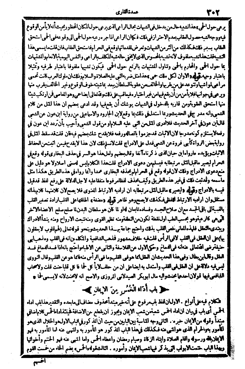 الْكَلَام فِيهِ على أَنْوَاع. الأول: أَن لفظ: بَاب، مَرْفُوع على أَنه خبر مُبْتَدأ مَحْذُوف، مُضَاف إِلَى مَا بعده، وَالتَّقْدِير: هَذَا بَاب أَدَاء الْخمس. أَي: بَاب فِي بَيَان أَن أَدَاء الْخمس شُعْبَة من شعب الْإِيمَان. وَيجوز أَن يقطع عَن الْإِضَافَة، فَحِينَئِذٍ: أَدَاء الْخمس، كَلَام إضافي مُبْتَدأ. وَقَوله: من الايمان، خَبره. الثَّانِي: وَجه الْمُنَاسبَة بَين الْبَابَيْنِ من حَيْثُ إِن الْمَذْكُور فِي الْبَاب الأول هُوَ الْحَلَال الَّذِي هُوَ الْمَأْمُور بِهِ، وَالْحرَام الَّذِي هُوَ الْمنْهِي عَنهُ، فَكَذَلِك فِي هَذَا الْبَاب، الْمَذْكُور هُوَ الْمَأْمُور بِهِ، والمنهي عَنهُ. أما الْمَأْمُور بِهِ فَهُوَ: الايمان بِاللَّه وَرَسُوله وإقام الصَّلَاة وإيتاء الزَّكَاة وَصِيَام رَمَضَان وَإِعْطَاء الْخمس، وَأما الْمنْهِي عَنهُ فَهُوَ: الحنتم وَأَخَوَاتهَا، وَبِهَذَا الْبَاب ختمت الْأَبْوَاب الَّتِي يذكر فِيهَا شعب الْإِيمَان وأموره. الثَّالِث: قَوْله: (الْخمس) ، بِضَم الْخَاء، من: خمست الْقَوْم