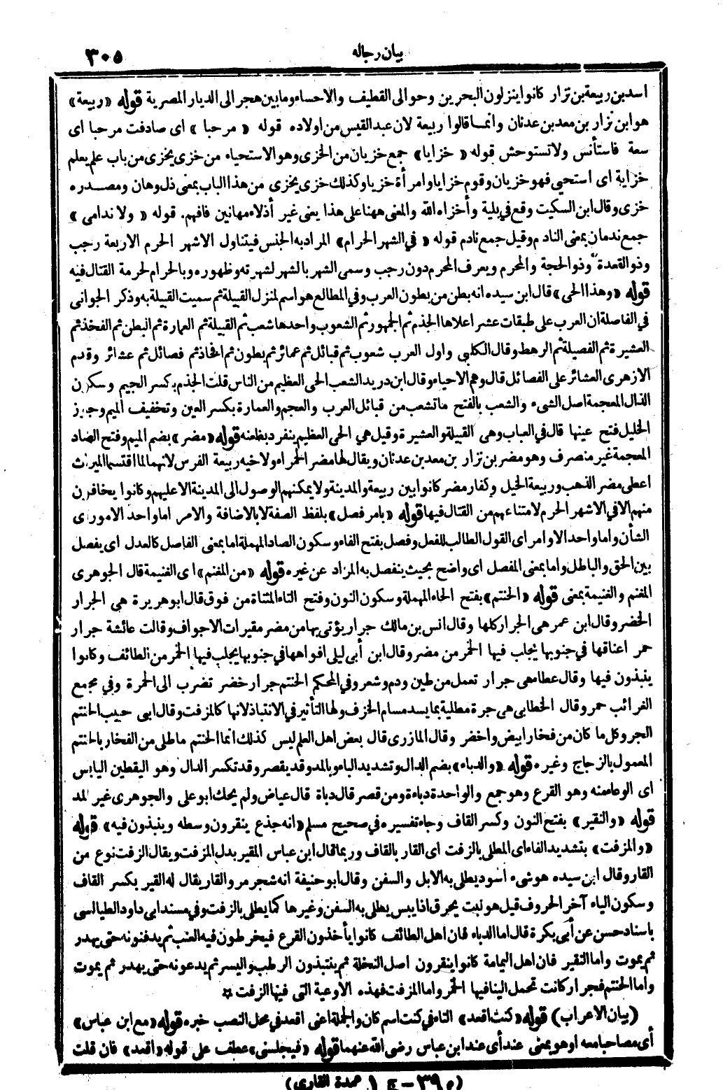 أَسد بن ربيعَة بن نزار كَانُوا ينزلون الْبَحْرين وحوالي القطيف والأحساء وَمَا بَين هجر إِلَى الديار المصرية قَوْله " ربيعَة " هُوَ ابْن نزار بن معد بن عدنان وَإِنَّمَا قَالُوا ربيعَة لِأَن عبد الْقَيْس من أَوْلَاده قَوْله " مرْحَبًا " أَي صادفت مرْحَبًا أَي سَعَة فاستأنس وَلَا تستوحش قَوْله " خزايا " جمع خزيان من الخزي وَهُوَ الاستحياء من خزى يخزي من بَاب علم يعلم خزاية أَي استحيى فَهُوَ خزيان وَقوم خزايا وَامْرَأَة خزيا وَكَذَلِكَ خزى يخزي من هَذَا الْبَاب بِمَعْنى ذل وَهَان ومصدره خزى وَقَالَ ابْن السّكيت وَقع فِي بلية وأخزاه الله وَالْمعْنَى هَهُنَا على هَذَا يَعْنِي غير أذلاء مهانين فَافْهَم. قَوْله " وَلَا ندامى " جمع ندمان بِمَعْنى النادم وَقيل جمع نادم قَوْله " فِي الشَّهْر الْحَرَام " المُرَاد بِهِ الْجِنْس فَيتَنَاوَل الْأَشْهر الْحرم الْأَرْبَعَة رَجَب وَذُو الْقعدَة وَذُو الْحجَّة وَالْمحرم وَيعرف الْمحرم دون رَجَب وسمى الشَّهْر بالشهر لشهرته وَطهُوره وبالحرم لحرمه الْقِتَال فِيهِ قَوْله " وَهَذَا الْحَيّ " قَالَ ابْن سَيّده أَنه بطن من بطُون الْعَرَب وَفِي الْمطَالع هُوَ اسْم لمنزلة الْقَبِيلَة ثمَّ سميت الْقَبِيلَة بِهِ وَذكر الجواني فِي الفاضلة أَن الْعَرَب على طَبَقَات عشر اعلاها الجذم ثمَّ الْجُمْهُور ثمَّ الشعوب وَاحِدهَا شعب ثمَّ الْقَبِيلَة ثمَّ الْعِمَارَة ثمَّ الْبَطن ثمَّ الْفَخْذ ثمَّ الْعَشِيرَة ثمَّ الفصيلة ثمَّ الرَّهْط وَقَالَ الْكَلْبِيّ وَأول الْعَرَب شعوب ثمَّ قبائل ثمَّ عمائر ثمَّ بطُون ثمَّ أفخاذ ثمَّ فصائل ثمَّ عشاءر وَقدم الْأَزْهَرِي العشائر على الْفَضَائِل قَالَ وهم الْأَحْيَاء وَقَالَ ابْن دُرَيْد الشّعب الْحَيّ الْعَظِيم من النَّاس قلت: الجذم بِكَسْر الْجِيم وَسُكُون الذَّال الْمُعْجَمَة أصل الشَّيْء والشعب بِالْفَتْح مَا تشعب من قبائل الْعَرَب والعجم والعمارة بِكَسْر الْعين وَتَخْفِيف الْمِيم وَجوز الْخَلِيل فتح عينهَا قَالَ فِي الْعباب وَهِي الْقَبِيلَة وَالْعشيرَة وَقيل هِيَ الْحَيّ ينْفَرد بظعنه قَوْله " مُضر " بِضَم الْمِيم وَفتح الضَّاد الْمُعْجَمَة غير منصرف وَهُوَ مُضر بن نزار بن معد بن عدنان وَيُقَال لَهَا مُضر الْحَمْرَاء ولأخيه ربيعَة الْفرس لِأَنَّهُمَا لما اقْتَسمَا الْمِيرَاث أعْطى مُضر الذَّهَب وَرَبِيعَة الْخَيل وكفار مُضر كَانُوا بَين ربيعَة وَالْمَدينَة وَلَا يُمكنهُم الْوُصُول إِلَى الْمَدِينَة إِلَّا عَلَيْهِم وَكَانُوا يخَافُونَ مِنْهُم إِلَّا فِي الْأَشْهر الْحرم لامتناعهم من الْقِتَال فِيهَا قَوْله " بِأَمْر فصل " بِلَفْظ الصّفة لَا بِالْإِضَافَة وَالْأَمر أما وَاحِد الْأُمُور أَي الشَّأْن وَأما وَاحِد الْأَوَامِر أَي القَوْل الطَّالِب للْفِعْل وَفصل بِفَتْح الْفَاء وَسُكُون الصَّاد الْمُهْملَة أما بِمَعْنى الْفَاصِل كالعدل أَي يفصل بَين الْحق وَالْبَاطِل وَأما بِمَعْنى الْمفصل أَي وَاضح بِحَيْثُ ينْفَصل بِهِ المُرَاد عَن غَيره قَوْله " من الْمغنم " أَي الْغَنِيمَة قَالَ الْجَوْهَرِي الْمغنم وَالْغنيمَة بِمَعْنى قَوْله " الحنتم " بِفَتْح الْحَاء الْمُهْملَة وَسُكُون النُّون وَفتح التَّاء الْمُثَنَّاة من فَوق قَالَ أَبُو هُرَيْرَة هِيَ الجرار الْخضر وَقَالَ ابْن عمر هِيَ الجرار كلهَا وَقَالَ أنس بن مَالك جرار يُؤْتى بهَا من مُضر مقيرات الأجواف وَقَالَت عَائِشَة جرار حمر اعناقها فِي جنوبها يجلب فِيهَا الْخمر من مُضر وَقَالَ ابْن أبي ليلى افواهها فِي جنوبها يجلب فِيهَا الْخمر من الطَّائِف وَكَانُوا ينبذون فِيهَا وَقَالَ عَطاء هِيَ جرار تعْمل من طين وَدم وَشعر وَفِي الْمُحكم الحنتم جرار خضر تضرب إِلَى الْحمرَة وَفِي مجمع الغرائب حمر وَقَالَ الْخطابِيّ هِيَ جرة مطلية بِمَا يسد مسام الخزف وَلها التَّأْثِير فِي الانتباذ لِأَنَّهَا كالمزفت وَقَ