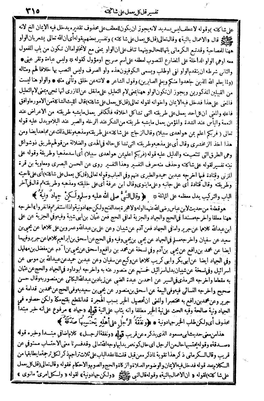 وَالْوَاو هُنَا لَيست من القبيلين الْمَذْكُورين، وَيجوز أَن تكون الْوَاو هَهُنَا بِمَعْنى: لَام التَّعْلِيل، على مَا نقل عَن الْمَازرِيّ، أَنَّهَا تَجِيء بِمَعْنى لَام التَّعْلِيل، فَالْمَعْنى على هَذَا، فَدخل فِيهِ الْإِيمَان وأخواته لقَوْله تَعَالَى: {قل كل يعْمل على شاكلته} (الْإِسْرَاء: 84) قَالَ اللَّيْث: الشاكلة من الْأُمُور مَا وَافق فَاعله، وَالْمعْنَى أَن كل أحد يعْمل على طَرِيقَته الَّتِي تشاكل أخلاقه، فالكافر يعْمل مَا يشبه طَرِيقَته من الْإِعْرَاض عِنْد النِّعْمَة واليأس عِنْد الشدَّة، وَالْمُؤمن يعْمل مَا يشبه طَرِيقَته من الشُّكْر عِنْد الرخَاء وَالصَّبْر عِنْد الْبلَاء، وَيدل عَلَيْهِ قَوْله تَعَالَى: {فربكم أعلم بِمن هُوَ أهْدى سَبِيلا} (الْإِسْرَاء: 84) وَقَالَ الزّجاج: على شاكلته: على طَرِيقَته ومذهبه، وَنقل ذَلِك عَن مُجَاهِد أَيْضا، وَمن هَذَا أَخذ الزَّمَخْشَرِيّ، وَقَالَ: أَي على مذْهبه وطريقته الَّتِي تشاكل كل حَاله فِي الْهدى والضلالة، من قَوْلهم: طَرِيق ذُو شواكل، وَهِي الطّرق الَّتِي تتشعب مِنْهُ، وَالدَّلِيل عَلَيْهِ قَوْله {فربكم أعلم بِمن هُوَ أهْدى سَبِيلا} (الْإِسْرَاء: 84) أَي أَسد مذهبا، وَطَرِيقَة وَقَوله على نِيَّته تَفْسِير لقَوْله: على شاكلته، وَحذف مِنْهُ حرف التَّفْسِير، وَهَذَا التَّفْسِير رُوِيَ عَن الْحسن الْبَصْرِيّ وَمُعَاوِيَة بن قُرَّة الْمُزنِيّ وَقَتَادَة فِيمَا أخرجه عبد بن حميد والطبري عَنْهُم. وَفِي (الْعباب) وَقَوله تَعَالَى: {قل كل يعْمل على شاكلته} (الْإِسْرَاء: 84) أَي: على ناحيته وطريقته. وَقَالَ قَتَادَة: أَي على جَانِبه وعَلى مَا يَنْوِي. وَقَالَ ابْن عَرَفَة: أَي على خليقته ومذهبه وطريقته. ثمَّ قَالَ فِي آخر الْبَاب: والتركيب يدل معظمه على الْمُمَاثلَة.