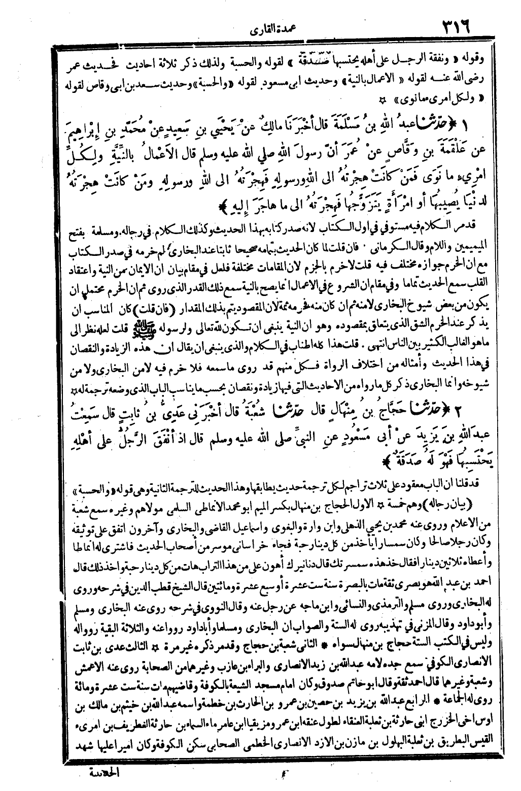 قد مر الْكَلَام فِيهِ مُسْتَوفى فِي أول الْكتاب لِأَنَّهُ صدر كِتَابه بِهَذَا الحَدِيث، وَكَذَلِكَ الْكَلَام فِي رِجَاله ومسلمة، بِفَتْح الميمين وَاللَّام، وَقَالَ الْكرْمَانِي: فَإِن قلت: لما كَانَ الحَدِيث بِتَمَامِهِ صَحِيحا ثَابتا عِنْد البُخَارِيّ لم خرمه فِي صدر الْكتاب؟ مَعَ أَن الخرم جَوَازه مُخْتَلف فِيهِ. قلت: لأخرم، بِالْجَزْمِ، لِأَن المقامات مُخْتَلفَة، فَلَعَلَّ فِي مقَام بَيَان أَن الْإِيمَان من النِّيَّة، واعتقاد الْقلب سمع الحَدِيث تَمامًا، وَفِي مقَام أَن الشُّرُوع فِي الْأَعْمَال إِنَّمَا يَصح بِالنِّيَّةِ، سمع ذَلِك الْقدر الَّذِي روى، ثمَّ إِن الخرم مُحْتَمل أَن يكون من بعض شُيُوخ البُخَارِيّ لَا مِنْهُ، ثمَّ إِن كَانَ مِنْهُ فخرمه ثمَّة لِأَن الْمَقْصُود يتم بذلك الْمِقْدَار. فَإِن قلت: كَانَ الْمُنَاسب أَن يذكر عِنْد الخرم الشق الَّذِي يتَعَلَّق بمقصوده، وَهُوَ: أَن النِّيَّة يَنْبَغِي أَن تكون لله تَعَالَى وَلِرَسُولِهِ صلى الله عَلَيْهِ وَسلم. قلت: لَعَلَّه نظر إِلَى مَا هُوَ الْغَالِب الْكثير بَين النَّاس. انْتهى. قلت: هَذَا كُله إطناب فِي الْكَلَام، وَالَّذِي يَنْبَغِي أَن يُقَال، إِن هَذِه الزِّيَادَة وَالنُّقْصَان فِي هَذَا الحَدِيث وَأَمْثَاله من اخْتِلَاف الروَاة، فَكل مِنْهُم قد روى مَا سَمعه. فَلَا خرم فِيهِ لَا من البُخَارِيّ وَلَا من شُيُوخه، وَإِنَّمَا البُخَارِيّ ذكر كل مَا رَوَاهُ من الْأَحَادِيث الَّتِي فِيهَا زِيَادَة ونقصان بِحَسب مَا يُنَاسب الْبَاب الَّذِي وَضعه تَرْجَمَة لَهُ.