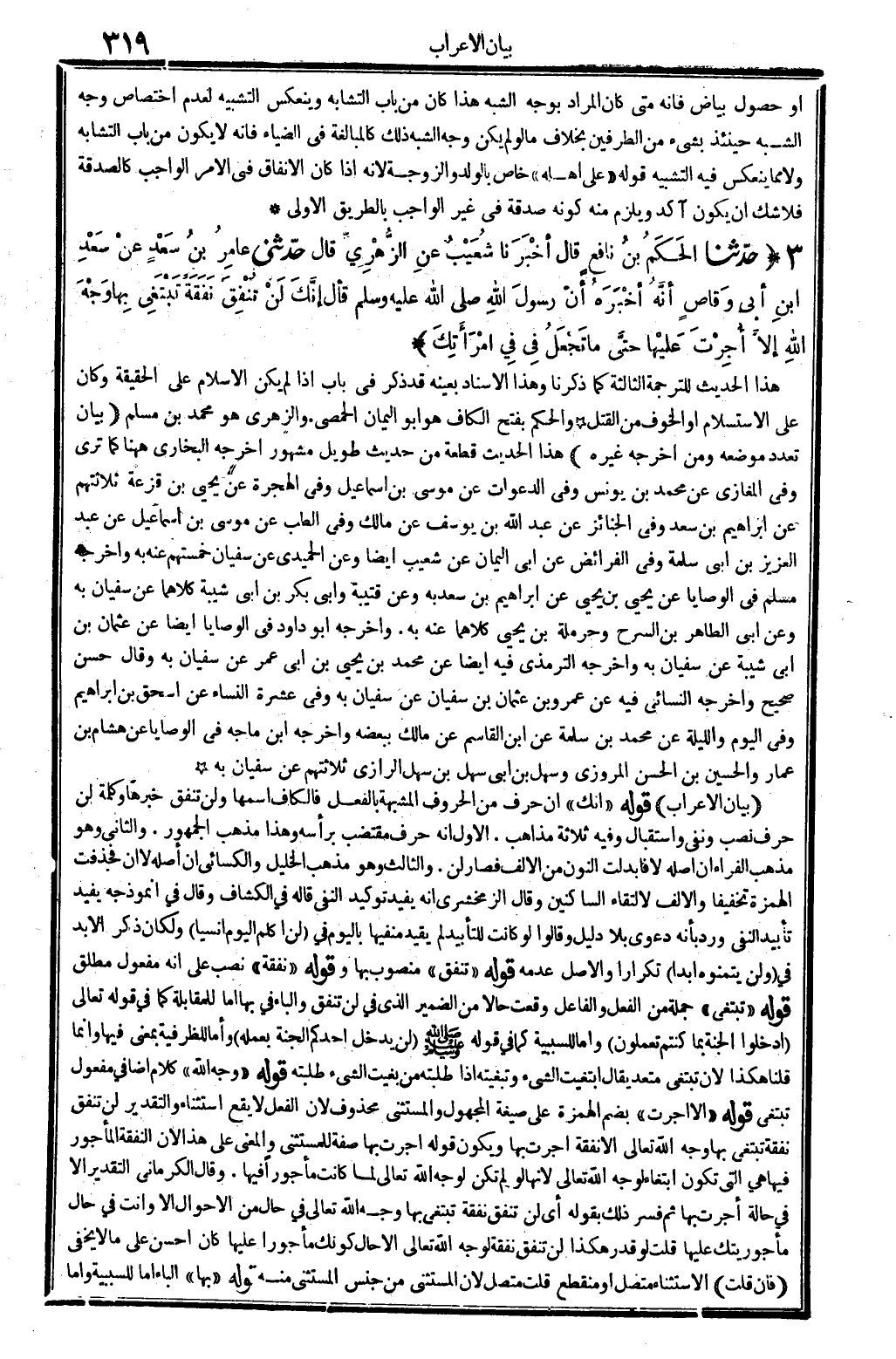 56 - حدّثنا الحَكَمُ بنُ نافعٍ قَالَ أخْبَرَنَا شُعَيْبٌ عنِ الزُّهْرِيِّ قَالَ حدّثني عامِرُ بنُ سَعْدٍ عنْ سَعْدِ بنِ أبي وَقاصٍ أنَّهُ أخْبَرَهُ أنّ رَسُول اللَّهِ صلى الله عَلَيْهِ وَسلم قَالَ إنَّكَ لَنْ تُنْفِقَ نَفَقَةً تَبْتَغِي بِها وَجْهَ اللَّهِ إلاَّ أُجِرْتَ عَليْها حتَّى مَا تَجْعَلُ فِي فِي امْرَأَتِكَ..