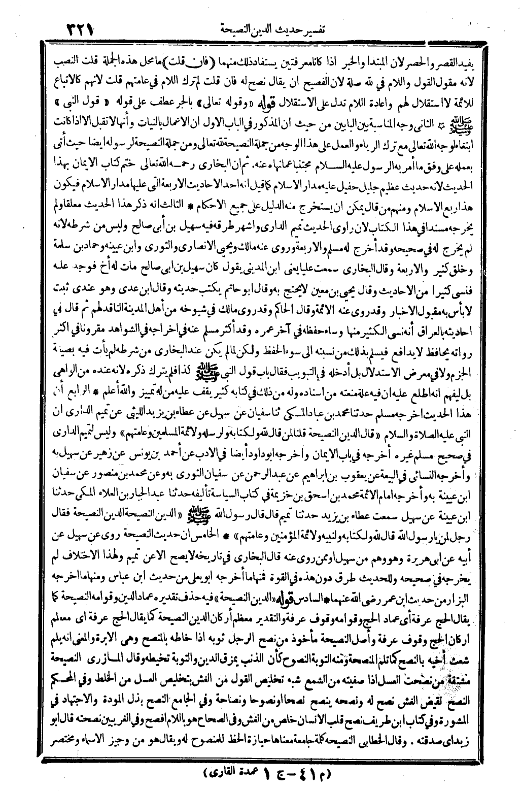 السَّادِس: قَوْله (الدّين النَّصِيحَة) ، فِيهِ حذف تَقْدِيره: عماد الدّين وقوامه النَّصِيحَة، كَمَا يُقَال: الْحَج عَرَفَة، أَي: عماد الْحَج وقوامه وقُوف عَرَفَة. وَالتَّقْدِير: مُعظم أَرْكَان الدّين النَّصِيحَة، كَمَا يُقَال: الْحَج عَرَفَة، أَي: مُعظم أَرْكَان الْحَج وقُوف عَرَفَة. وأصل النَّصِيحَة مَأْخُوذ من نصح الرجل ثَوْبه إِذا خاطه بالمنصح، وَهِي الإبرة، وَالْمعْنَى: أَنه يلم شعث أَخِيه بالنصح، كَمَا تلم المنصحة، وَمِنْه التَّوْبَة النصوح، كَأَن الذَّنب يمزق الدّين وَالتَّوْبَة تخيطه. وَقَالَ الْمَازرِيّ: النَّصِيحَة مُشْتَقَّة من: نصحت الْعَسَل إِذا صفيته من الشمع، شبه تَخْلِيص القَوْل من الْغِشّ بتخليص الْعَسَل من الْخَلْط. وَفِي (الْمُحكم) النصح: نقيض الْغِشّ، نصح لَهُ ونصحه ينصح نصحاً أَو نصُوحًا ونصاحة. وَفِي (الْجَامِع) : النصح: بذل الْمَوَدَّة وَالِاجْتِهَاد فِي المشورة. وَفِي كتاب ابْن طريف: نصح قلب الْإِنْسَان: خلص من الْغِشّ. وَفِي (الصِّحَاح) : هُوَ بِاللَّامِ أفْصح. وَفِي (الغريبين) نَصَحته، قَالَ أَبُو زيد أَي: صدقته. وَقَالَ الْخطابِيّ: النَّصِيحَة كلمة جَامِعَة مَعْنَاهَا: حِيَازَة الْحَظ للمنصوح لَهُ، وَيُقَال: هُوَ من وجيز الْأَسْمَاء، ومختصر