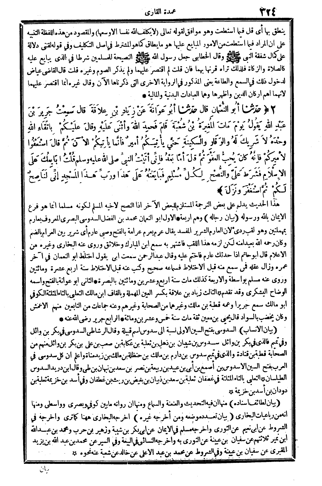 بَيَان رِجَاله: وهم أَرْبَعَة. الأول: أَبُو النُّعْمَان مُحَمَّد بن الْفضل، السدُوسِي الْبَصْرِيّ، الْمَعْرُوف بعارم، بمهملتين، وَهُوَ لقب رَدِيء، لِأَن العارم: الشرير الْمُفْسد. يُقَال: عرم يعرم عرامة، بِالْفَتْح، وَصبي عَارِم أَي: شرير بَين العرام، بِالضَّمِّ. وَكَانَ رَحمَه الله بَعيدا مِنْهُ، لَكِن لزمَه هَذَا اللقب فاشتهر بِهِ، سمع ابْن الْمُبَارك وخلائق، وروى عَنهُ البُخَارِيّ وَغَيره من الْأَعْلَام، قَالَ أَبُو حَاتِم: إِذا حَدثَك عَارِم فاختم عَلَيْهِ. وَقَالَ عبد الرَّحْمَن: سَمِعت أبي يَقُول: اخْتَلَط أَبُو النُّعْمَان فِي آخر عمره وَزَالَ عقله، فَمن سمع مِنْهُ قبل الِاخْتِلَاط فسماعه صَحِيح. وَكتب عَنهُ قبل الِاخْتِلَاط سنة أَربع عشرَة وَمِائَتَيْنِ، وروى عَنهُ مُسلم بِوَاسِطَة، وَالْأَرْبَعَة كَذَلِك، مَاتَ سنة أَربع وَعشْرين وَمِائَتَيْنِ بِالْبَصْرَةِ. الثَّانِي: أَبُو عوَانَة، بِالْفَتْح، واسْمه الوضاح الْيَشْكُرِي، وَقد تقدم. الثَّالِث: زِيَاد بن علاقَة، بِكَسْر الْعين الْمُهْملَة وبالقاف، ابْن مَالك الثَّعْلَبِيّ، بالثاء الْمُثَلَّثَة، الْكُوفِي، أَبُو مَالك، سمع جَرِيرًا وَعَمه قُطْبَة بن مَالك وَغَيرهمَا من الصَّحَابَة، وَغَيرهم. وَعنهُ جماعات من التَّابِعين مِنْهُم الْأَعْمَش، وَكَانَ يخضب بِالسَّوَادِ. قَالَ يحيى بن معِين: ثِقَة، مَاتَ سنة خمس وَعشْرين وَمِائَة. الرَّابِع: جرير رَضِي الله عَنهُ.