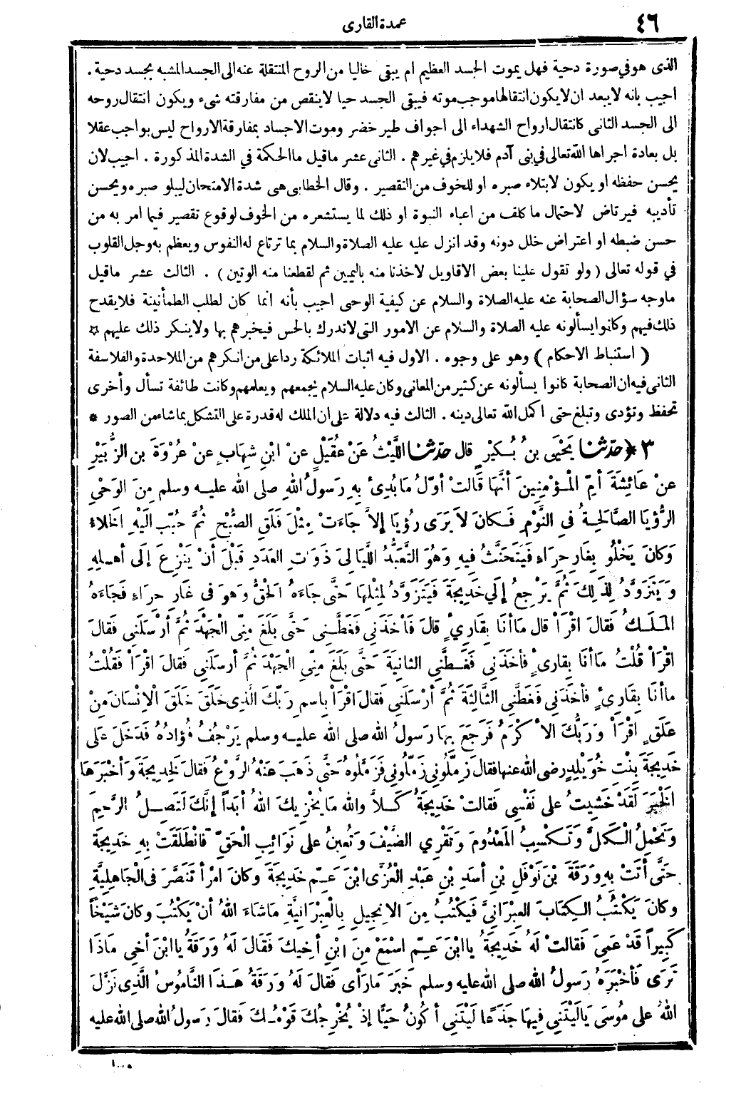 3 - (حَدثنَا يحيى بن بكير قَالَ حَدثنَا اللَّيْث عَن عقيل عَن ابْن شهَاب عَن عُرْوَة بن الزبير عَن عَائِشَة أم الْمُؤمنِينَ أَنَّهَا قَالَت أول مَا بدىء بِهِ رَسُول الله صلى الله عَلَيْهِ وَسلم من الْوَحْي الرُّؤْيَا الصَّالِحَة فِي النّوم فَكَانَ لَا يرى رُؤْيا إِلَّا جَاءَت مثل فلق الصُّبْح ثمَّ حبب إِلَيْهِ الْخَلَاء وَكَانَ يَخْلُو بِغَار حراء فَيَتَحَنَّث فِيهِ وَهُوَ التَّعَبُّد اللَّيَالِي ذوت الْعدَد قبل أَن ينْزع إِلَى أَهله ويتزود لذَلِك ثمَّ يرجع إِلَى خَدِيجَة فيتزود لمثلهَا حَتَّى جَاءَهُ الْحق وَهُوَ فِي غَار حراء فَجَاءَهُ الْملك فَقَالَ اقْرَأ قَالَ مَا أَنا بقاريء قَالَ فأخذني فغطني حَتَّى بلغ مني الْجهد ثمَّ أَرْسلنِي فَقَالَ اقْرَأ قلت مَا أَنا بقارىء فأخذني فغطني الثَّانِيَة حَتَّى بلغ مني الْجهد ثمَّ أَرْسلنِي فَقَالَ اقْرَأ فَقلت مَا أَنا بقارىء فأخذني فغطني الثَّالِثَة ثمَّ أَرْسلنِي فَقَالَ اقْرَأ باسم رَبك الَّذِي خلق خلق الْإِنْسَان من علق اقْرَأ وَرَبك الأكرم فَرجع بهَا رَسُول الله صلى الله عَلَيْهِ وَسلم يرجف فُؤَاده فَدخل على خَدِيجَة بنت خويلد رَضِي الله عَنْهَا فَقَالَ زَمِّلُونِي زَمِّلُونِي فزملوه حَتَّى ذهب عَنهُ الروع فَقَالَ لِخَدِيجَة وأخبرها الْخَبَر لقد خشيت على نَفسِي فَقَالَت خَدِيجَة كلا وَالله مَا يخزيك الله أبدا إِنَّك لتصل الرَّحِم وَتحمل الْكل وتكسب الْمَعْدُوم وتقري الضَّيْف وَتعين على نَوَائِب الْحق فَانْطَلَقت بِهِ خَدِيجَة حَتَّى أَتَت بِهِ ورقة بن نَوْفَل بن أَسد بن عبد الْعُزَّى ابْن عَم خَدِيجَة وَكَانَ امْرأ تنصر فِي الْجَاهِلِيَّة وَكَانَ يكْتب الْكتاب العبراني فَيكْتب من الْإِنْجِيل بالعبرانية مَا شَاءَ الله أَن يكْتب وَكَانَ شَيخا كَبِيرا قد عمي فَقَالَت لَهُ خَدِيجَة يَا ابْن عَم اسْمَع من ابْن أَخِيك فَقَالَ لَهُ ورقة يَا ابْن أخي مَاذَا ترى فَأخْبرهُ رَسُول الله صلى الله عَلَيْهِ وَسلم خبر مَا رأى فَقَالَ لَهُ ورقة هَذَا الناموس الَّذِي نزل الله على مُوسَى يَا لَيْتَني فِيهَا جذعا لَيْتَني أكون حَيا إِذْ يخْرجك قَوْمك فَقَالَ رَسُول الله صلى الله عَلَيْهِ وَسلم