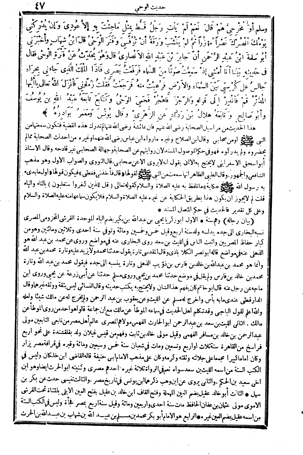 أَو مخرجي هم قَالَ نعم لم يَأْتِ رجل قطّ بِمثل مَا جِئْت بِهِ إِلَّا عودي وَإِن يدركني يَوْمك أنصرك نصرا مؤزرا ثمَّ لم ينشب ورقة أَن توفّي وفتر الْوَحْي قَالَ ابْن شهَاب وَأَخْبرنِي أَبُو سَلمَة ابْن عبد الرَّحْمَن أَن جَابر بن عبد الله الْأنْصَارِيّ قَالَ وَهُوَ يحدث عَن فَتْرَة الْوَحْي فَقَالَ فِي حَدِيثه بَينا أَنا أَمْشِي إِذْ سَمِعت صَوتا من السَّمَاء فَرفعت بَصرِي فَإِذا الْملك الَّذِي جَاءَنِي بحراء جَالس على كرْسِي بَين السَّمَاء وَالْأَرْض فَرُعِبْت مِنْهُ فَرَجَعت فَقلت زَمِّلُونِي فَأنْزل الله تَعَالَى يَا أَيهَا المدثر قُم فَأَنْذر إِلَى قَوْله وَالرجز فاهجر فحمي الْوَحْي وتتابع تَابعه عبد الله بن يُوسُف وَأَبُو صَالح وَتَابعه هِلَال بن رداد عَن الزُّهْرِيّ وَقَالَ يُونُس وَمعمر بوادره) هَذَا الحَدِيث من مَرَاسِيل الصَّحَابَة رَضِي الله عَنْهُم فَإِن عَائِشَة رَضِي الله عَنْهَا لم تدْرك هَذِه الْقَضِيَّة فَتكون سَمعتهَا من النَّبِي صلى الله عَلَيْهِ وَسلم أَو من صَحَابِيّ وَقَالَ ابْن الصّلاح وَغَيره مَا رَوَاهُ ابْن عَبَّاس رَضِي الله عَنْهُمَا وَغَيره من أَحْدَاث الصَّحَابَة مِمَّا لم يحضروه وَلم يدركوه فَهُوَ فِي حكم الْمَوْصُول الْمسند لِأَن روايتهم عَن الصَّحَابَة وجهالة الصَّحَابِيّ غير قادحة وَقَالَ الْأُسْتَاذ أَبُو إِسْحَق الإسفرايني لَا يحْتَج بِهِ إِلَّا أَن يَقُول أَنه لَا يرْوى إِلَّا عَن صَحَابِيّ. قَالَ النَّوَوِيّ وَالصَّوَاب الأول وَهُوَ مَذْهَب الشَّافِعِي وَالْجُمْهُور. وَقَالَ الطَّيِّبِيّ الظَّاهِر أَنَّهَا سَمِعت من النَّبِي صلى الله عَلَيْهِ وَسلم لقولها قَالَ فأخذني فغطني فَيكون قَوْلهَا أول مَا بدىء بِهِ رَسُول الله صلى الله عَلَيْهِ وَسلم حِكَايَة مَا تلفظ بِهِ عَلَيْهِ الصَّلَاة وَالسَّلَام كَقَوْلِه تَعَالَى {قل للَّذين كفرُوا ستغلبون} بِالتَّاءِ وَالْيَاء قلت لم لَا يجوز أَن يكون هَذَا بطرِيق الْحِكَايَة عَن غَيره عَلَيْهِ الصَّلَاة وَالسَّلَام فَلَا يكون سماعهَا مِنْهُ عَلَيْهِ الصَّلَاة وَالسَّلَام وعَلى كل تَقْدِير فَالْحَدِيث فِي حكم الْمُتَّصِل الْمسند. (بَيَان رِجَاله) وهم سِتَّة الأول أَبُو زَكَرِيَّا يحيى بن عبد الله بن بكير بِضَم الْبَاء الْمُوَحدَة الْقرشِي المَخْزُومِي الْمصْرِيّ نسبه البُخَارِيّ إِلَى جده يدلسه ولد سنة أَربع وَقيل خمس وَخمسين وَمِائَة وَتُوفِّي سنة إِحْدَى وَثَلَاثِينَ وَمِائَتَيْنِ وَهُوَ من كبار حفاظ المصريين وَأثبت النَّاس فِي اللَّيْث بن سعد روى البُخَارِيّ عَنهُ فِي مَوَاضِع وروى عَن مُحَمَّد بن عبد الله هُوَ الذهلي عَنهُ فِي مَوَاضِع قَالَه أَبُو نصر الكلاباذي وَقَالَ الْمَقْدِسِي تَارَة يَقُول حَدثنَا مُحَمَّد وَلَا يزِيد عَلَيْهِ وَتارَة مُحَمَّد بن عبد الله وَإِنَّمَا هُوَ مُحَمَّد بن عبد الله بن خَالِد بن فَارس بن ذُؤَيْب الذهلي وَتارَة ينْسبهُ إِلَى جده فَيَقُول مُحَمَّد بن عبد الله وَتارَة مُحَمَّد بن خَالِد بن فَارس وَلم يقل فِي مَوضِع حَدثنَا مُحَمَّد بن يحيى وروى مُسلم حَدثنَا عَن أبي زرْعَة عَن يحيى وروى ابْن ماجة عَن رجل عَنهُ قَالَ أَبُو حَاتِم كَانَ يفهم هَذَا الشَّأْن وَلَا يحْتَج بِهِ يكْتب حَدِيثه وَقَالَ النَّسَائِيّ لَيْسَ بِثِقَة وَوَثَّقَهُ غَيرهمَا وَقَالَ الدَّارَقُطْنِيّ عِنْدِي مَا بِهِ بَأْس وَأخرج لَهُ مُسلم عَن اللَّيْث وَعَن يَعْقُوب بن عبد الرَّحْمَن وَلم يخرج لَهُ عَن مَالك شَيْئا وَلَعَلَّه وَالله أعلم لقَوْل الْبَاجِيّ وَقد تكلم أهل الحَدِيث فِي سَمَاعه الْمُوَطَّأ عَن مَالك مَعَ أَن جمَاعَة قَالُوا هُوَ أحد من روى الْمُوَطَّأ عَن مَالك. الثَّانِي اللَّيْث بن سعد بن عبد الرَّحْمَن أَبُو الْحَارِث الفهمي مَوْلَاهُم الْمصْرِيّ عَالم أهل مصر من تَابِعِيّ التَّابِعين مولى عبد الرَّحْم