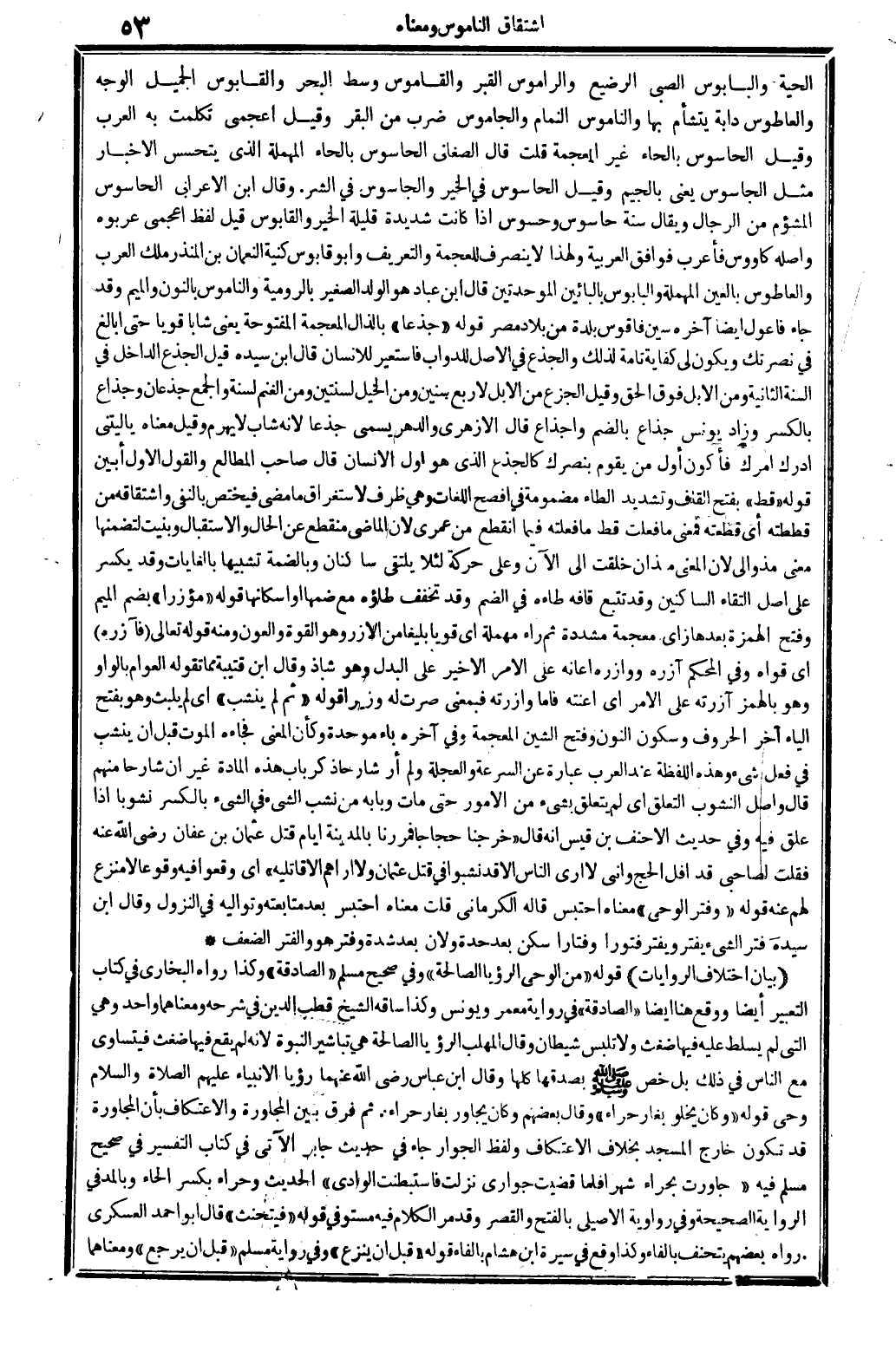 الْحَيَّة والبابوس الصَّبِي الرَّضِيع والراموس الْقَبْر والقاموس وسط الْبَحْر والقابوس الْجَمِيل الْوَجْه والعاطوس دَابَّة يتشأم بهَا والناموس النمام ... والجاموس ضرب من الْبَقر وَقيل أعجمي تَكَلَّمت بِهِ الْعَرَب وَقيل الحاسوس بِالْحَاء غير الْمُعْجَمَة قلت قَالَ الصغاني الحاسوس بِالْحَاء الْمُهْملَة الَّذِي يتحسس الْأَخْبَار مثل الجاسوس يَعْنِي بِالْجِيم وَقيل الحاسوس فِي الْخَيْر والجاسوس فِي الشَّرّ. وَقَالَ ابْن الْأَعرَابِي الحاسوس المشؤم من الرِّجَال وَيُقَال سنة حاسوس وحسوس إِذا كَانَت شَدِيدَة قَليلَة الْخَيْر والقابوس قيل لفظ أعجمي عربوه وَأَصله كاووس فأعرب فَوَافَقَ الْعَرَبيَّة وَلِهَذَا لَا ينْصَرف للعجمة والتعريف وَأَبُو قَابُوس كنية النُّعْمَان بن الْمُنْذر ملك الْعَرَب والعاطوس بِالْعينِ الْمُهْملَة والبابوس بالبائين الموحدتين قَالَ ابْن عباد هُوَ الْوَلَد الصَّغِير بالرومية والناموس بالنُّون وَالْمِيم وَقد جَاءَ فاعول أَيْضا آخِره سين فاقوس بَلْدَة من بِلَاد مصر قَوْله جذعا بِالذَّالِ الْمُعْجَمَة الْمَفْتُوحَة يَعْنِي شَابًّا قَوِيا حَتَّى أبالغ فِي نصرتك وَيكون لي كِفَايَة تَامَّة لذَلِك والجذع فِي الأَصْل للدواب فاستعير للْإنْسَان قَالَ ابْن سَيّده قيل الْجذع الدَّاخِل فِي السّنة الثَّانِيَة وَمن الْإِبِل فَوق الْحق وَقيل الْجزع من الْإِبِل لأَرْبَع سِنِين وَمن الْخَيل لِسنتَيْنِ وَمن الْغنم لسنة وَالْجمع جذعان وجذاع بِالْكَسْرِ وَزَاد يُونُس جذاع بِالضَّمِّ وأجذاع قَالَ الْأَزْهَرِي والدهر يُسمى جذعا لِأَنَّهُ شَاب لَا يهرم وَقيل مَعْنَاهُ يَا لَيْتَني أدْرك أَمرك فَأَكُون أول من يقوم بنصرك كالجذع الَّذِي هُوَ أول الْإِنْسَان قَالَ صَاحب الْمطَالع وَالْقَوْل الأول أبين قَوْله قطّ بِفَتْح الْقَاف وَتَشْديد الطَّاء مَضْمُومَة فِي أفْصح اللُّغَات وَهِي ظرف لاستغراق مَا مضى فَيخْتَص بِالنَّفْيِ واشتقاقه من قططته أَي قطعته فَمَعْنَى مَا فعلت قطّ مَا فعلته فِيمَا انْقَطع من عمري لِأَن الْمَاضِي مُنْقَطع عَن الْحَال والاستقبال وبنيت لتضمنها معنى مذ وَإِلَى لِأَن الْمَعْنى مذ أَن خلقت إِلَى الْآن وعَلى حَرَكَة لِئَلَّا يلتقي ساكنان وبالضمة تَشْبِيها بالغايات وَقد يكسر على أصل التقاء الساكنين وَقد تتبع قافه طاءه فِي الضَّم وَقد تخفف طاؤه مَعَ ضمهَا أَو إسكانها قَوْله مؤزرا بِضَم الْمِيم وَفتح الْهمزَة بعْدهَا زَاي مُعْجمَة مُشَدّدَة ثمَّ رَاء مُهْملَة أَي قَوِيا بليغا من الأزر وَهُوَ الْقُوَّة والعون وَمِنْه قَوْله تَعَالَى {فآزره} أَي قواه وَفِي الْمُحكم آزره ووازره أَعَانَهُ على الْأَمر الْأَخير على الْبَدَل وَهُوَ شَاذ وَقَالَ ابْن قُتَيْبَة مِمَّا تَقوله الْعَوام بِالْوَاو وَهُوَ بِالْهَمْز آزرته على الْأَمر أَي أعنته فَأَما وازرته فبمعنى صرت لَهُ وزيرا قَوْله ثمَّ لم ينشب أَي لم يلبث وَهُوَ بِفَتْح الْيَاء آخر الْحُرُوف وَسُكُون النُّون وَفتح الشين الْمُعْجَمَة وَفِي آخِره بَاء مُوَحدَة وَكَأن الْمَعْنى فَجَاءَهُ الْمَوْت قبل أَن ينشب فِي فعل شَيْء وَهَذِه اللَّفْظَة عِنْد الْعَرَب عبارَة عَن السرعة والعجلة وَلم أر شارحا ذكر بَاب هَذِه الْمَادَّة غير أَن شارحا مِنْهُم قَالَ وأصل النشوب التَّعَلُّق أَي لم يتَعَلَّق بِشَيْء من الْأُمُور حَتَّى مَاتَ وبابه من نشب الشَّيْء فِي الشَّيْء بِالْكَسْرِ نشوبا إِذا علق فِيهِ وَفِي حَدِيث الْأَحْنَف بن قيس أَنه قَالَ خرجنَا حجاجا فمررنا بِالْمَدِينَةِ أَيَّام قتل عُثْمَان بن عَفَّان رَضِي الله عَنهُ فَقلت لصاحبي قد أفل الْحَج وَإِنِّي لَا أرى النَّاس إِلَّا قد نشبوا فِي قتل عُثْمَان وَلَا أَرَاهُم إِلَّا قاتليه أَي وَقَعُوا فِيهِ وقوعا لَا منزع لَهُم عَنهُ قَوْله وفتر الْوَحْي مَعْنَاهُ احْتبسَ قَالَه الْكرْمَانِي قلت مَعْنَ