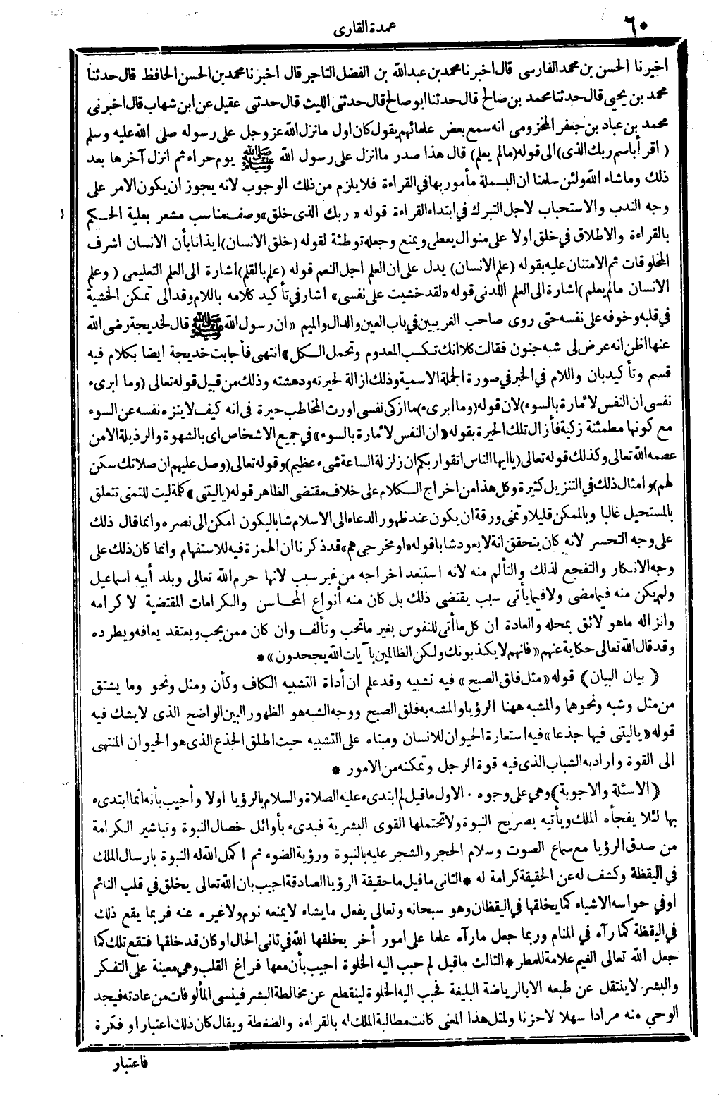أخبرنَا الْحسن بن مُحَمَّد الْفَارِسِي قَالَ أخبرنَا مُحَمَّد بن عبد الله بن الْفضل التَّاجِر قَالَ أخبرنَا مُحَمَّد بن الْحسن الْحَافِظ قَالَ حَدثنَا مُحَمَّد بن يحيى قَالَ حَدثنَا مُحَمَّد بن صَالح قَالَ حَدثنَا أَبُو صَالح قَالَ حَدثنِي اللَّيْث قَالَ حَدثنِي عقيل عَن ابْن شهَاب قَالَ أَخْبرنِي مُحَمَّد بن عباد بن جَعْفَر المَخْزُومِي أَنه سمع بعض عُلَمَائهمْ يَقُول كَانَ أول مَا نزل الله عز وَجل على رَسُوله صلى الله عَلَيْهِ وَسلم {اقْرَأ باسم رَبك الَّذِي} إِلَى قَوْله {مَا لم يعلم} قَالَ هَذَا صدر مَا أنزل على رَسُول الله صلى الله عَلَيْهِ وَسلم يَوْم حراء ثمَّ أنزل آخرهَا بعد ذَلِك وَمَا شَاءَ الله وَلَئِن سلمنَا أَن الْبَسْمَلَة مَأْمُور بهَا فِي الْقِرَاءَة فَلَا يلْزم من ذَلِك الْوُجُوب لِأَنَّهُ يجوز أَن يكون الْأَمر على وَجه النّدب والاستحباب لأجل التَّبَرُّك فِي ابْتِدَاء الْقِرَاءَة قَوْله {رَبك الَّذِي خلق} وصف مُنَاسِب مشْعر بعلية الحكم بِالْقِرَاءَةِ وَالْإِطْلَاق فِي خلق أَولا على منوال يعْطى وَيمْنَع وَجعله تَوْطِئَة لقَوْله {خلق الْإِنْسَان} إِيذَانًا بِأَن الْإِنْسَان أشرف الْمَخْلُوقَات ثمَّ الامتنان عَلَيْهِ بقوله {علم الْإِنْسَان} يدل على أَن الْعلم أجل النعم قَوْله {علم بالقلم} إِشَارَة إِلَى الْعلم التعليمي و {علم الْإِنْسَان مَا لم يعلم} إِشَارَة إِلَى الْعلم اللدني قَوْله لقد خشيت على نَفسِي أَشَارَ فِي تَأْكِيد كَلَامه بِاللَّامِ وَقد إِلَى تمكن الخشية فِي قلبه وخوفه على نَفسه حَتَّى روى صَاحب الغريبين فِي بَاب الْعين وَالدَّال وَالْمِيم أَن رَسُول الله صلى الله عَلَيْهِ وَسلم قَالَ لِخَدِيجَة رَضِي الله عَنْهَا أَظن أَنه عرض لي شبه جُنُون فَقَالَت كلا إِنَّك تكسب الْمَعْدُوم وَتحمل الْكل انْتهى فأجابت خَدِيجَة أَيْضا بِكَلَام فِيهِ قسم وتأكيد بِأَن وَاللَّام فِي الْخَبَر فِي صُورَة الْجُمْلَة الإسمية وَذَلِكَ إِزَالَة لحيرته ودهشته وَذَلِكَ من قبيل قَوْله تَعَالَى {وَمَا أبرئ نَفسِي إِن النَّفس لأمارة بالسوء} لِأَن قَوْله {وَمَا أبرئ} مَا أزكي نَفسِي أورث الْمُخَاطب حيرة فِي أَنه كَيفَ لَا ينزه نَفسه عَن السوء مَعَ كَونهَا مطمئنة زكية فأزال تِلْكَ الْحيرَة بقوله إِن النَّفس لأمارة بالسوء فِي جَمِيع الْأَشْخَاص أَي بالشهوة والرذيلة إِلَّا من عصمه الله تَعَالَى وَكَذَلِكَ قَوْله تَعَالَى {يَا أَيهَا النَّاس اتَّقوا ربكُم إِن زَلْزَلَة السَّاعَة شَيْء عَظِيم} وَقَوله تَعَالَى {وصل عَلَيْهِم إِن صَلَاتك سكن لَهُم} وأمثال ذَلِك فِي التَّنْزِيل كَثِيرَة وكل هَذَا من إِخْرَاج الْكَلَام على خلاف مُقْتَضى الظَّاهِر قَوْله يَا لَيْتَني كلمة لَيْت لِلتَّمَنِّي تتَعَلَّق بالمستحيل غَالِبا وبالممكن قَلِيلا وَتمنى ورقة أَن يكون عِنْد ظُهُور الدُّعَاء إِلَى الْإِسْلَام شَابًّا ليَكُون أمكن إِلَى نَصره وَإِنَّمَا قَالَ ذَلِك على وَجه التحسر لِأَنَّهُ كَانَ يتَحَقَّق أَنه لَا يعود شَابًّا قَوْله أَو مخرجي هم قد ذكرنَا أَن الْهمزَة فِيهِ للاستفهام وَإِنَّمَا كَانَ ذَلِك على وَجه الْإِنْكَار والتفجع لذَلِك والتألم مِنْهُ لِأَنَّهُ استبعد إِخْرَاجه من غير سَبَب لِأَنَّهَا حرم الله تَعَالَى وبلد أَبِيه إِسْمَاعِيل وَلم يكن مِنْهُ فِيمَا مضى وَلَا فِيمَا يَأْتِي سَبَب يَقْتَضِي ذَلِك بل كَانَ مِنْهُ أَنْوَاع المحاسن والكرامات الْمُقْتَضِيَة لإكرامه وإنزاله مَا هُوَ لَائِق بمحله وَالْعَادَة أَن كل مَا أَتَى للنفوس بِغَيْر مَا تحب وتألف وَإِن كَانَ مِمَّن يحب ويعتقد يعافه ويطرده وَقد قَالَ الله تَعَالَى حِكَايَة عَنْهُم {فَإِنَّهُم لَا يكذبُونَك وَلَكِن الظَّالِمين بآيَات الله يجحدون} (بَيَان الْبَيَان) قَوْله مثل فلق الصُّبْح فِيهِ تَشْبِيه وَقد علم أَن أَدَاة التَّشْبِيه الْكَاف وَكَأن وَم