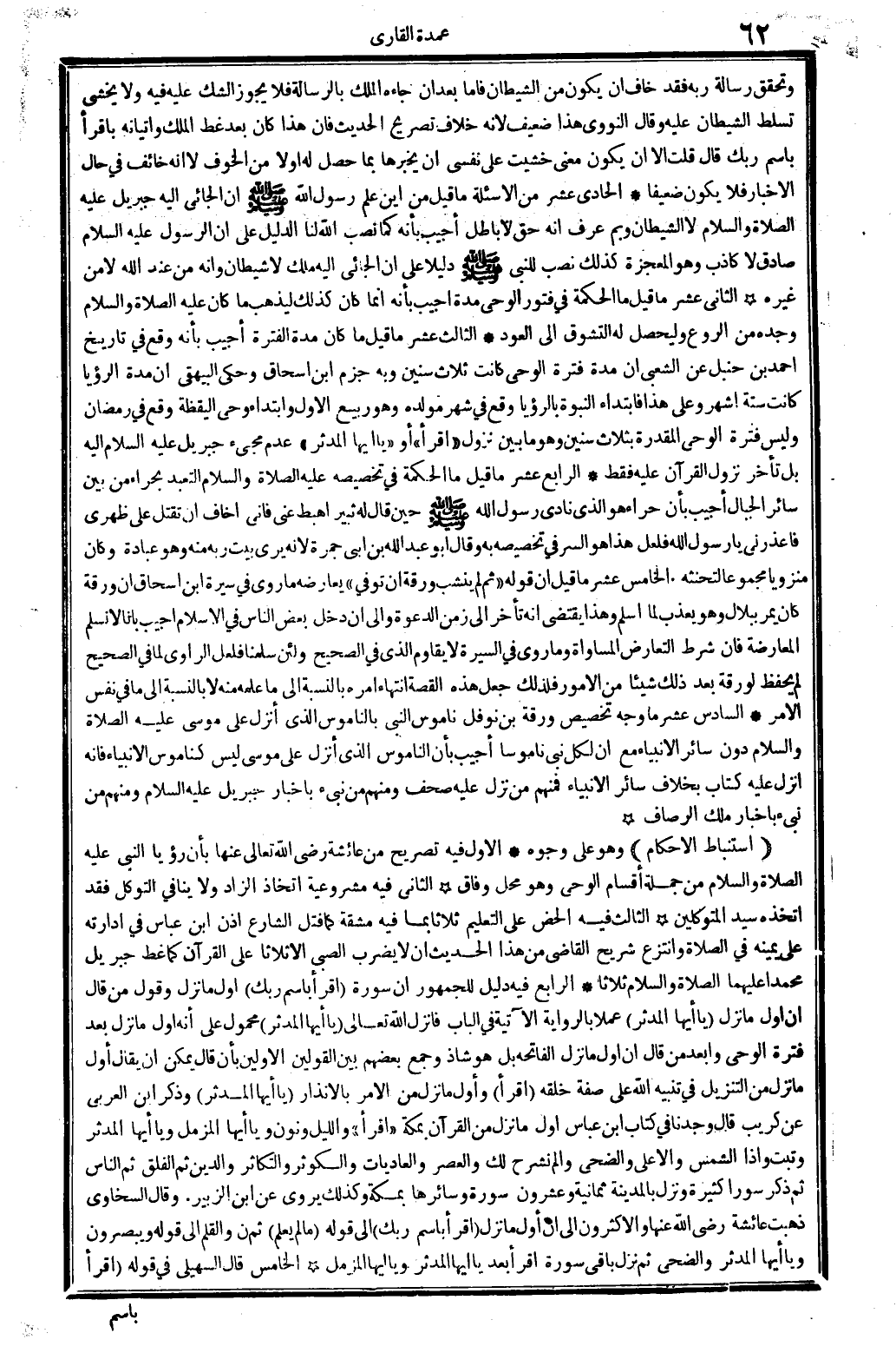 وَتحقّق رِسَالَة ربه فقد خَافَ أَن يكون من الشَّيْطَان فَأَما بعد أَن جَاءَهُ الْملك بالرسالة فَلَا يجوز الشَّك عَلَيْهِ فِيهِ وَلَا يخْشَى تسلط الشَّيْطَان عَلَيْهِ وَقَالَ النَّوَوِيّ هَذَا ضَعِيف لِأَنَّهُ خلاف تَصْرِيح الحَدِيث فَإِن هَذَا كَانَ بعد غط الْملك وإتيانه بإقرأ باسم رَبك قَالَ قلت إِلَّا أَن يكون معنى خشيت على نَفسِي أَن يخبرها بِمَا حصل لَهُ أَولا من الْخَوْف لَا أَنه خَائِف فِي حَال الْإِخْبَار فَلَا يكون ضَعِيفا الْحَادِي عشر من الأسئلة مَا قيل من أَيْن علم رَسُول الله صلى الله عَلَيْهِ وَسلم أَن الجائي إِلَيْهِ جِبْرِيل عَلَيْهِ الصَّلَاة وَالسَّلَام لَا الشَّيْطَان وَبِمَ عرف أَنه حق لَا بَاطِل أُجِيب بِأَنَّهُ كَمَا نصب الله لنا الدَّلِيل على أَن الرَّسُول صلى الله عَلَيْهِ وَسلم صَادِق لَا كَاذِب وَهُوَ المعجزة كَذَلِك نصب للنَّبِي صلى الله عَلَيْهِ وَسلم دَلِيلا على أَن الجائي إِلَيْهِ ملك لَا شَيْطَان وَأَنه من عِنْد الله لَا من غَيره الثَّانِي عشر مَا قيل مَا الْحِكْمَة فِي فتور الْوَحْي مُدَّة أُجِيب بِأَنَّهُ إِنَّمَا كَانَ كَذَلِك ليذْهب مَا كَانَ صلى الله عَلَيْهِ وَسلم وجده من الروع وليحصل لَهُ التشوق إِلَى الْعود الثَّالِث عشر مَا قيل مَا كَانَ مُدَّة الفترة أُجِيب بِأَنَّهُ وَقع فِي تَارِيخ أَحْمد بن حَنْبَل عَن الشّعبِيّ أَن مُدَّة فَتْرَة الْوَحْي كَانَت ثَلَاث سِنِين وَبِه جزم ابْن إِسْحَاق وَحكى الْبَيْهَقِيّ أَن مُدَّة الرُّؤْيَا كَانَت سِتَّة أشهر وعَلى هَذَا فابتداء النُّبُوَّة بالرؤيا وَقع فِي شهر مولده وَهُوَ ربيع الأول وَابْتِدَاء وَحي الْيَقَظَة وَقع فِي رَمَضَان وَلَيْسَ فَتْرَة الْوَحْي الْمقدرَة بِثَلَاث سِنِين وَهُوَ مَا بَين نزُول اقْرَأ أَو يَا أَيهَا المدثر عدم مَجِيء جِبْرِيل عَلَيْهِ السَّلَام إِلَيْهِ بل تَأَخّر نزُول الْقُرْآن عَلَيْهِ فَقَط الرَّابِع عشر مَا قيل مَا الْحِكْمَة فِي تَخْصِيصه صلى الله عَلَيْهِ وَسلم التَّعَبُّد بحراء من بَين سَائِر الْجبَال أُجِيب بِأَن حراء هُوَ الَّذِي نَادَى رَسُول الله صلى الله عَلَيْهِ وَسلم حِين قَالَ لَهُ ثبير اهبط عني فَإِنِّي أَخَاف أَن تقتل على ظَهْري فاعذرني يَا رَسُول الله فَلَعَلَّ هَذَا هُوَ السِّرّ فِي تَخْصِيصه بِهِ وَقَالَ أَبُو عبد الله بن أبي جَمْرَة لِأَنَّهُ يرى بَيت ربه مِنْهُ وَهُوَ عبَادَة وَكَانَ منزويا مجموعا لتحنثه. الْخَامِس عشر مَا قيل أَن قَوْله ثمَّ لم ينشب ورقة أَن توفّي يُعَارضهُ مَا رُوِيَ فِي سيرة ابْن إِسْحَاق أَن ورقة كَانَ يمر ببلال وَهُوَ يعذب لما أسلم وَهَذَا يَقْتَضِي أَنه تَأَخّر إِلَى زمن الدعْوَة وَإِلَى أَن دخل بعض النَّاس فِي الْإِسْلَام أُجِيب بِأَنا لَا نسلم الْمُعَارضَة فَإِن شَرط التَّعَارُض الْمُسَاوَاة وَمَا رُوِيَ فِي السِّيرَة لَا يُقَاوم الَّذِي فِي الصَّحِيح وَلَئِن سلمنَا فَلَعَلَّ الرَّاوِي لما فِي الصَّحِيح لم يحفظ لورقة بعد ذَلِك شَيْئا من الْأُمُور فَلذَلِك جعل هَذِه الْقِصَّة انْتِهَاء أمره بِالنِّسْبَةِ إِلَى مَا علمه مِنْهُ لَا بِالنِّسْبَةِ إِلَى مَا فِي نفس الْأَمر السَّادِس عشر مَا وَجه تَخْصِيص ورقة بن نَوْفَل ناموس النَّبِي بالناموس الَّذِي أنزل على مُوسَى عَلَيْهِ الصَّلَاة وَالسَّلَام دون سَائِر الْأَنْبِيَاء مَعَ أَن لكل نَبِي ناموسا أُجِيب بِأَن الناموس الَّذِي أنزل على مُوسَى لَيْسَ كناموس الْأَنْبِيَاء فَإِنَّهُ أنزل عَلَيْهِ كتاب بِخِلَاف سَائِر الْأَنْبِيَاء فَمنهمْ من نزل عَلَيْهِ صحف وَمِنْهُم من نبىء بأخبار جِبْرِيل عَلَيْهِ السَّلَام وَمِنْهُم من نبىء بأخبار ملك الرصاف (استنباط الْأَحْكَام) وَهُوَ على وُجُوه الأول فِيهِ تَصْرِيح من عَائِشَة رَضِي الله تَعَالَى عَنْهَا بِأَن رُؤْيا النَّبِي صلى الله عَلَيْهِ وَسلم من جملَة أَقس