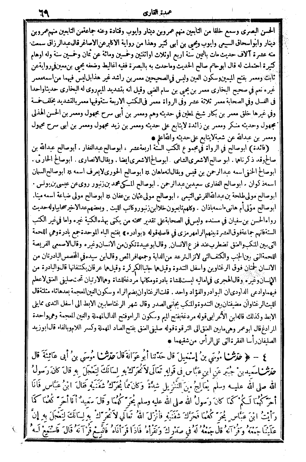 4 - (حَدثنَا مُوسَى بن إِسْمَعِيل قَالَ حَدثنَا أَبُو عوَانَة قَالَ حَدثنَا مُوسَى بن أبي عَائِشَة قَالَ حَدثنَا سعيد بن جُبَير عَن ابْن عَبَّاس فِي قَوْله تَعَالَى {لَا تحرّك بِهِ لسَانك لتعجل بِهِ} قَالَ كَانَ رَسُول الله صلى الله عَلَيْهِ وَسلم يعالج من التَّنْزِيل شدَّة وَكَانَ مِمَّا يُحَرك شَفَتَيْه فَقَالَ ابْن عَبَّاس فَأَنا أحركهما لكم كَمَا كَانَ رَسُول الله صلى الله عَلَيْهِ وَسلم يحركهما وَقَالَ سعيد أَنا أحركهما كَمَا رَأَيْت ابْن عَبَّاس يحركهما فحرك شَفَتَيْه فَأنْزل الله تَعَالَى {لَا تحرّك بِهِ لسَانك لتعجل بِهِ إِن علينا جمعه وقرآنه} قَالَ جمعه لَهُ فِي صدرك وتقرأه {فَإِذا قرأناه فَاتبع قرآنه} قَالَ فاستمع لَهُ