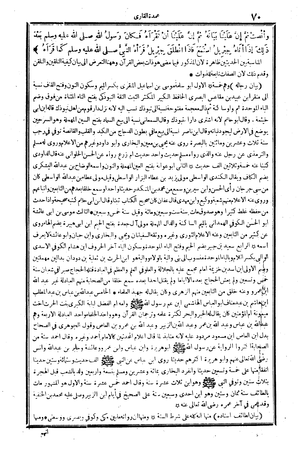 وأنصت {ثمَّ إِن علينا بَيَانه} ثمَّ إِن علينا أَن تقراه فَكَانَ رَسُول الله صلى الله عَلَيْهِ وَسلم بعد ذَلِك إِذا أَتَاهُ جِبْرِيل اسْتمع فَإِذا انْطلق جِبْرِيل قَرَأَهُ النَّبِي صلى الله عَلَيْهِ وَسلم كَمَا قراه الْمُنَاسبَة بَين الْحَدِيثين ظَاهِرَة لِأَن الْمَذْكُور فِيمَا مضى هُوَ ذَات بعض الْقُرْآن وَهَهُنَا التَّعَرُّض إِلَى بَيَان كَيْفيَّة التَّلْقِين والتلقن وَقدم ذَلِك لِأَن الصِّفَات تَابِعَة للذوات (بَيَان رِجَاله) وهم خَمْسَة الأول أَبُو سَلمَة مُوسَى بن إِسْمَاعِيل الْمنْقري بِكَسْر الْمِيم وَسُكُون النُّون وَفتح الْقَاف نِسْبَة إِلَى منقر ابْن عبيد بن مقاعس الْبَصْرِيّ الْحَافِظ الْكَبِير المكثر الثبت الثِّقَة التَّبُوذَكِي بِفَتْح التَّاء الْمُثَنَّاة من فَوق وَضم الْبَاء الْمُوَحدَة ثمَّ وَاو سَاكِنة ثمَّ ذال مُعْجمَة مَفْتُوحَة نِسْبَة إِلَى تبوذك نسب إِلَيْهِ لِأَنَّهُ نزل دَار قوم من أهل تبوذك قَالَه ابْن أبي خَيْثَمَة. وَقَالَ أَبُو حَاتِم لِأَنَّهُ اشْترى دَارا بتبوذك وَقَالَ السَّمْعَانِيّ نِسْبَة إِلَى بيع السماد بِفَتْح السِّين الْمُهْملَة وَهُوَ السرجين يوضع فِي الأَرْض ليجود نَبَاته وَقَالَ ابْن نَاصِر نِسْبَة إِلَى بيع مَا فِي بطُون الدَّجَاج من الكبد وَالْقلب والقانصة توفّي فِي رَجَب سنة ثَلَاث وَعشْرين وَمِائَتَيْنِ بِالْبَصْرَةِ روى عَنهُ يحيى بن معِين وَالْبُخَارِيّ وَأَبُو دَاوُد وَغَيرهم من الْأَعْلَام وروى لَهُ مُسلم وَالتِّرْمِذِيّ عَن رجل عَنهُ وَالَّذِي رَوَاهُ مُسلم حَدِيث وَاحِد حَدِيث أم زرع رَوَاهُ عَن الْحسن الْحلْوانِي عَنهُ قَالَ الدَّاودِيّ كتبنَا عَنهُ خَمْسَة وَثَلَاثِينَ ألف حَدِيث الثَّانِي أَبُو عوَانَة بِفَتْح الْعين الْمُهْملَة وَالنُّون واسْمه الوضاح بن عبد الله الْيَشْكُرِي بِضَم الْكَاف وَيُقَال الْكِنْدِيّ الوَاسِطِيّ مولى يزِيد بن عَطاء الْبَزَّار الوَاسِطِيّ وَقيل مولى عَطاء بن عبد الله الوَاسِطِيّ كَانَ من سبي جرجان رأى الْحسن وَابْن سِيرِين وَسمع من مُحَمَّد بن الْمُنْكَدر حَدِيثا وَاحِدًا وَسمع خلقا بعدهمْ من التَّابِعين وأتباعهم وروى عَنهُ الْأَعْلَام مِنْهُم شُعْبَة ووكيع وَابْن مهْدي قَالَ عَفَّان كَانَ صَحِيح الْكتاب ثبتا وَقَالَ ابْن أبي حَاتِم كتبه صَحِيحَة وَإِذا حدث من حفظه غلط كثيرا وَهُوَ صَدُوق مَاتَ سنة سِتّ وَسبعين وَمِائَة وَقيل سنة خمس وَسبعين الثَّالِث مُوسَى بن أبي عَائِشَة أَبُو الْحسن الْكُوفِي الْهَمدَانِي بِالْمِيم الساكنة وَالدَّال الْمُهْملَة مولى آل جعدة بِفَتْح الْجِيم ابْن أبي هُبَيْرَة بِضَم الْهَاء روى عَن كثير من التَّابِعين وَعنهُ الْأَعْلَام الثَّوْريّ وَغَيره وَوَثَّقَهُ السُّفْيانَانِ وَيحيى وَالْبُخَارِيّ وَابْن حبَان وَأَبُو عَائِشَة لَا يعرف اسْمه الرَّابِع سعيد بن جُبَير بِضَم الْجِيم وَفتح الْبَاء الْمُوَحدَة وَسُكُون الْيَاء آخر الْحُرُوف ابْن هِشَام الْكُوفِي الْأَسدي الْوَالِبِي بِكَسْر اللَّام وبالباء الْمُوَحدَة مَنْسُوب إِلَى بني والبة بِالْوَلَاءِ ووالبة هُوَ ابْن الْحَرْث بن ثَعْلَبَة بن دودان بدالين مهملتين وَضم الأولى ابْن أَسد بن خُزَيْمَة إِمَام مجمع عَلَيْهِ بالجلالة والعلو فِي الْعلم والعظم فِي الْعِبَادَة قَتله الْحجَّاج صبرا فِي شعْبَان سنة خمس وَتِسْعين وَلم يَعش الْحجَّاج بعده إِلَّا أَيَّامًا وَلم يقتل أحدا بعده سمع خلقا من الصَّحَابَة مِنْهُم العبادلة غير عبد الله بن عَمْرو وَعنهُ خلق من التَّابِعين مِنْهُم الزُّهْرِيّ وَكَانَ يُقَال لَهُ جهبذ الْعلمَاء الْخَامِس عبد الله بن عَبَّاس بن عبد الْمطلب بن هَاشم بن عبد منَاف أَبُو الْعَبَّاس الْهَاشِمِي ابْن عَم رَسُول الله صلى الله عَلَيْهِ وَسلم وَأمه أم الْفضل لبَابَة الْكُبْرَى بنت الْحَرْث أُخْت مَيْمُونَة 