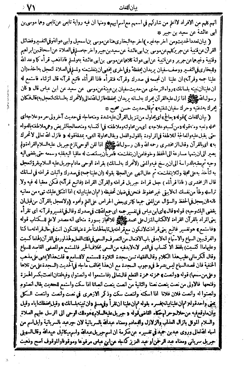 أَنهم كلهم من الْأَفْرَاد لَا أعلم من شاركهم فِي اسمهم مَعَ اسْم أَبِيهِم وَمِنْهَا أَن فِيهِ رِوَايَة تَابِعِيّ عَن تَابِعِيّ وهما مُوسَى بن أبي عَائِشَة عَن سعيد بن جُبَير (بَيَان تعدد الحَدِيث وَمن أخرجه غَيره) أخرجه البُخَارِيّ هُنَا عَن مُوسَى بن إِسْمَعِيل وَأبي عوَانَة وَفِي التَّفْسِير وفضائل الْقُرْآن عَن قُتَيْبَة عَن جرير كلهم عَن مُوسَى بن أبي عَائِشَة عَن سعيد بن جُبَير وَأخرجه مُسلم فِي الصَّلَاة عَن إِسْحَاق بن إِبْرَاهِيم وقتيبة وَغَيرهمَا عَن جرير وَعَن قُتَيْبَة عَن أبي عوَانَة كِلَاهُمَا عَن مُوسَى بن أبي عَائِشَة بِهِ وَلمُسلم فَإِذا ذهب قَرَأَهُ كَمَا وعد الله وللبخاري فِي التَّفْسِير وَوصف سُفْيَان يُرِيد أَن يحفظه وَفِي أُخْرَى يخْشَى أَن ينفلت مِنْهُ وَلمُسلم فِي الصَّلَاة لتعجل بِهِ أَخذه {إِن علينا جمعه وقرآنه} إِن علينا أَن نجمعه فِي صدرك وقرآنه فتقرأه فَإِذا أقرأناه فَاتبع قرآنه قَالَ أَنزَلْنَاهُ فاستمع لَهُ إِن علينا أَن نبينه بلسانك رَوَاهُ التِّرْمِذِيّ من حَدِيث سُفْيَان بن عُيَيْنَة عَن مُوسَى عَن سعيد عَن ابْن عَبَّاس قَالَ كَانَ رَسُول الله صلى الله عَلَيْهِ وَسلم إِذا نزل عَلَيْهِ الْقُرْآن يُحَرك بِهِ لِسَانه يُرِيد أَن يحفظه فَأنْزل الله تَعَالَى {لَا تحرّك بِهِ لسَانك لتعجل بِهِ} قَالَ فَكَانَ يُحَرك بِهِ شَفَتَيْه وحرك سُفْيَان شَفَتَيْه ثمَّ قَالَ حَدِيث حسن صَحِيح (بَيَان اللُّغَات) قَوْله يعالج أَي يحاول من تَنْزِيل الْقُرْآن عَلَيْهِ شدَّة وَمِنْه مَا جَاءَ فِي حَدِيث آخر ولى حره وعلاجه أَي عمله وتعبه وَمِنْه قَوْله من كَسبه وعلاجه أَي من محاولته وملاطفته فِي اكتسابه وَمِنْه معالجة الْمَرِيض وَهِي ملاطفته بالدواء حَتَّى يقبل عَلَيْهِ والمعالجة الملاطفة فِي المراودة بالْقَوْل وَالْفِعْل وَيُقَال محاولة الشَّيْء بِمَشَقَّة قَوْله فَأنْزل الله تَعَالَى لَا تحرّك بِهِ أَي بِالْقُرْآنِ وَقَالَ الزَّمَخْشَرِيّ رَحمَه الله وَكَانَ رَسُول الله صلى الله عَلَيْهِ وَسلم إِذا لقن الْوَحْي نَازع جِبْرِيل عَلَيْهِ السَّلَام الْقِرَاءَة وَلم يصير إِلَى أَن يُتمهَا مسارعة إِلَى الْحِفْظ وخوفا من أَن يتفلت مِنْهُ فَأمر بِأَن يستنصت لَهُ ملقيا إِلَيْهِ بِقَلْبِه وسَمعه حَتَّى يقْضِي إِلَيْهِ وحيه ثمَّ يعقبه بالدراسة إِلَى أَن يرسخ فِيهِ وَالْمعْنَى {لَا تحرّك بِهِ لسَانك} بِقِرَاءَة الْوَحْي مادام جِبْرِيل عَلَيْهِ السَّلَام يقرؤ لتعجل بِهِ لتأْخذ بِهِ على عجلة وَلِئَلَّا يتفلت مِنْهُ ثمَّ علل النَّهْي عَن العجلة بقوله {إِن علينا جمعه} فِي صدرك وَإِثْبَات قِرَاءَته فِي لسَانك قَالَ الزَّمَخْشَرِيّ {فَإِذا قرأناه} جعل قِرَاءَة جِبْرِيل قِرَاءَته وَالْقُرْآن الْقِرَاءَة {فَاتبع قرآنه} فَكُن معقبا لَهُ فِيهِ وَلَا تراسله وطأ من نَفسك أَنه لَا يبْقى غير مَحْفُوظ فَنحْن فِي ضَمَان تحفيظه {ثمَّ إِن علينا بَيَانه} إِذا أشكل عَلَيْك شَيْء من مَعَانِيه كَأَنَّهُ كَانَ يعجل فِي الْحِفْظ وَالسُّؤَال عَن الْمَعْنى جَمِيعًا كَمَا ترى بعض الحراص على الْعلم وَنَحْوه {وَلَا تعجل بِالْقُرْآنِ من قبل أَن يقْضى إِلَيْك وحيه} قَوْله قَالَ أَي ابْن عَبَّاس فِي تَفْسِير جمعه أَي جمع الله لَك فِي صدرك وَقَالَ فِي تَفْسِير وقرآنه أَي تَقْرَأهُ يَعْنِي المُرَاد بِالْقُرْآنِ الْقِرَاءَة لَا الْكتاب الْمنزل على مُحَمَّد صلى الله عَلَيْهِ وَسلم للإعجاز بِسُورَة مِنْهُ أَي أَنه مصدر لَا علم للْكتاب قَوْله فاستمع هُوَ تَفْسِير فَاتبع يَعْنِي قراءتك لَا تكون مَعَ قِرَاءَته بل تَابِعَة لَهَا مُتَأَخِّرَة عَنْهَا فَتكون أَنْت فِي حَال قِرَاءَته ساكتا وَالْفرق بَين السماع وَالِاسْتِمَاع أَنه لَا بُد فِي بَاب الافتعال من التَّصَرُّف وَالسَّعْي فِي ذَلِك الْفِعْل وَلِهَذَا ورد فِي الْقُرْآن {لَهَا مَا كسبت 