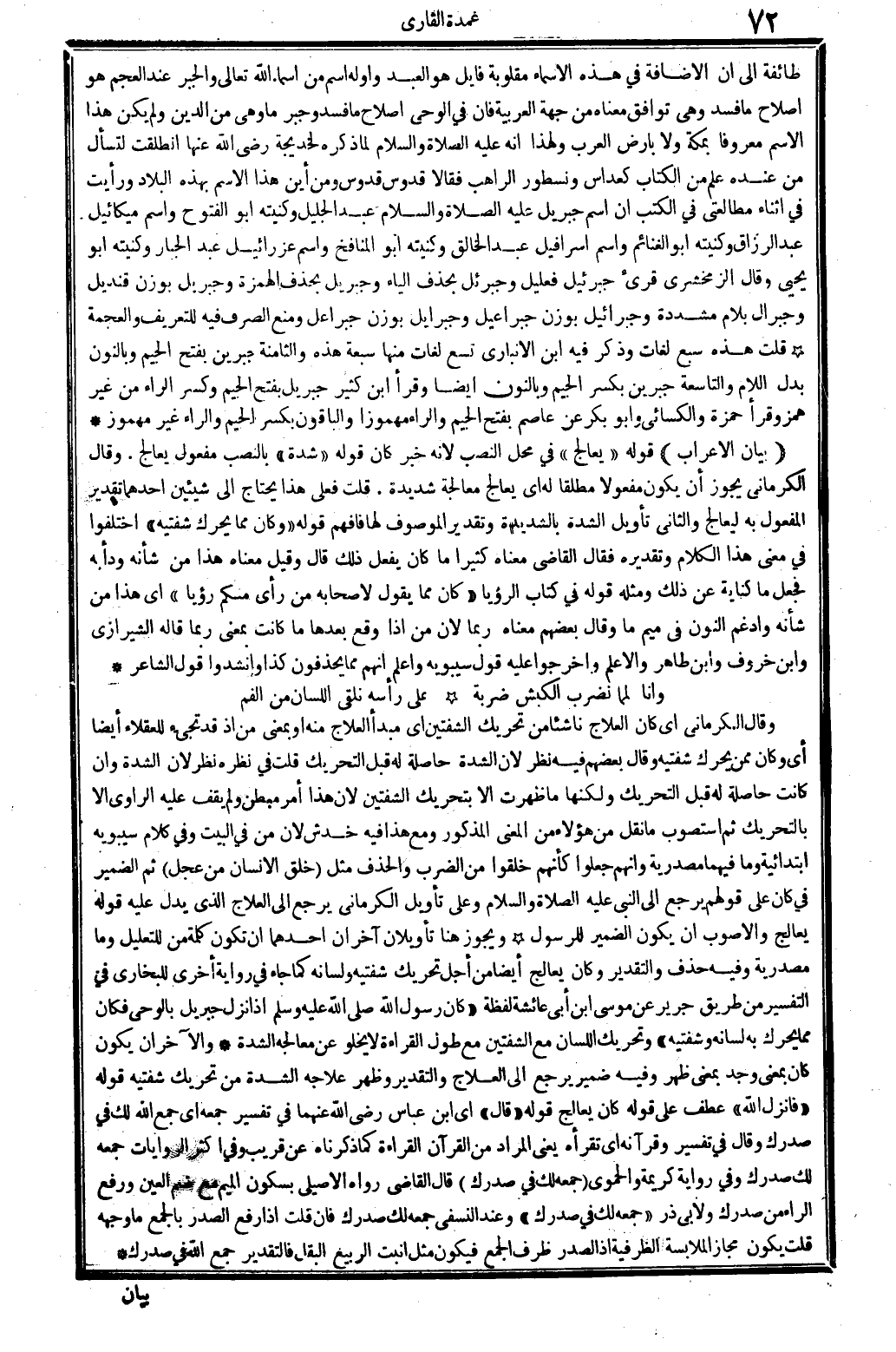 طَائِفَة إِلَى أَن الْإِضَافَة فِي هَذِه الْأَسْمَاء مَقْلُوبَة فأيل هُوَ العَبْد وأوله اسْم من أَسمَاء الله تَعَالَى والجبر عِنْد الْعَجم هُوَ إصْلَاح مَا فسد وَهِي توَافق مَعْنَاهُ من جِهَة الْعَرَبيَّة فَإِن فِي الْوَحْي إصْلَاح مَا فسد وجبر مَا وَهِي من الدّين وَلم يكن هَذَا الِاسْم مَعْرُوفا بِمَكَّة وَلَا بِأَرْض الْعَرَب وَلِهَذَا أَنه صلى الله عَلَيْهِ وَسلم لما ذكره لِخَدِيجَة رَضِي الله عَنْهَا انْطَلَقت لتسأل من عِنْده علم من الْكتاب كعداس ونسطور الراهب فَقَالَا قدوس قدوس وَمن أَيْن هَذَا الِاسْم بِهَذِهِ الْبِلَاد وَرَأَيْت فِي أثْنَاء مطالعتي فِي الْكتب أَن اسْم جِبْرِيل عَلَيْهِ الصَّلَاة وَالسَّلَام عبد الْجَلِيل وكنيته أَبُو الْفتُوح وَاسم مِيكَائِيل عبد الرَّزَّاق وكنيته أَبُو الْغَنَائِم وَاسم إسْرَافيل عبد الْخَالِق وكنيته أَبُو المنافخ وَاسم عزرائيل عبد الْجَبَّار وكنيته أَبُو يحيى وَقَالَ الزَّمَخْشَرِيّ قرىء جبرئيل فعليل وجبرئل بِحَذْف الْيَاء وَجِبْرِيل بِحَذْف الْهمزَة وَجِبْرِيل بِوَزْن قنديل وجبرال بلام مُشَدّدَة وجبرائيل بِوَزْن جبراعيل وجبرايل بِوَزْن جبراعل وَمنع الصّرْف فِيهِ للتعريف والعجمة قلت هَذِه سبع لُغَات وَذكر فِيهِ ابْن الْأَنْبَارِي تسع لُغَات مِنْهَا سَبْعَة هَذِه وَالثَّامِنَة جبرين بِفَتْح الْجِيم وبالنون بدل اللَّام والتاسعة جبرين بِكَسْر الْجِيم وبالنون أَيْضا وَقَرَأَ ابْن كثير جِبْرِيل بِفَتْح الْجِيم وَكسر الرَّاء من غير همز وَقَرَأَ حَمْزَة وَالْكسَائِيّ وَأَبُو بكر عَن عَاصِم بِفَتْح الْجِيم وَالرَّاء مهموزا وَالْبَاقُونَ بِكَسْر الْجِيم وَالرَّاء غير مَهْمُوز (بَيَان الْإِعْرَاب) قَوْله يعالج فِي مَحل النصب لِأَنَّهُ خبر كَانَ قَوْله شدَّة بِالنّصب مفعول يعالج. وَقَالَ الْكرْمَانِي يجوز أَن يكون مَفْعُولا مُطلقًا لَهُ أَي يعالج معالجة شَدِيدَة. قلت فعلى هَذَا يحْتَاج إِلَى شَيْئَيْنِ أَحدهمَا تَقْدِير الْمَفْعُول بِهِ ليعالج وَالثَّانِي تَأْوِيل الشدَّة بالشديدة وَتَقْدِير الْمَوْصُوف لَهَا فَافْهَم قَوْله وَكَانَ مِمَّا يُحَرك شَفَتَيْه اخْتلفُوا فِي معنى هَذَا الْكَلَام وَتَقْدِيره فَقَالَ القَاضِي مَعْنَاهُ كثيرا مَا كَانَ يفعل ذَلِك قَالَ وَقيل مَعْنَاهُ هَذَا من شَأْنه ودأبه فَجعل مَا كِنَايَة عَن ذَلِك وَمثله قَوْله فِي كتاب الرُّؤْيَا كَانَ مِمَّا يَقُول لأَصْحَابه من رأى مِنْكُم رُؤْيا أَي هَذَا من شَأْنه وأدغم النُّون فِي مِيم مَا وَقَالَ بَعضهم مَعْنَاهُ رُبمَا لِأَن من إِذا وَقع بعْدهَا مَا كَانَت بِمَعْنى رُبمَا قَالَه الشِّيرَازِيّ وَابْن خروف وَابْن طَاهِر والأعلم وأخرجوا عَلَيْهِ قَول سِيبَوَيْهٍ وَأعلم أَنهم مِمَّا يحذفون كَذَا وأنشدوا قَول الشَّاعِر