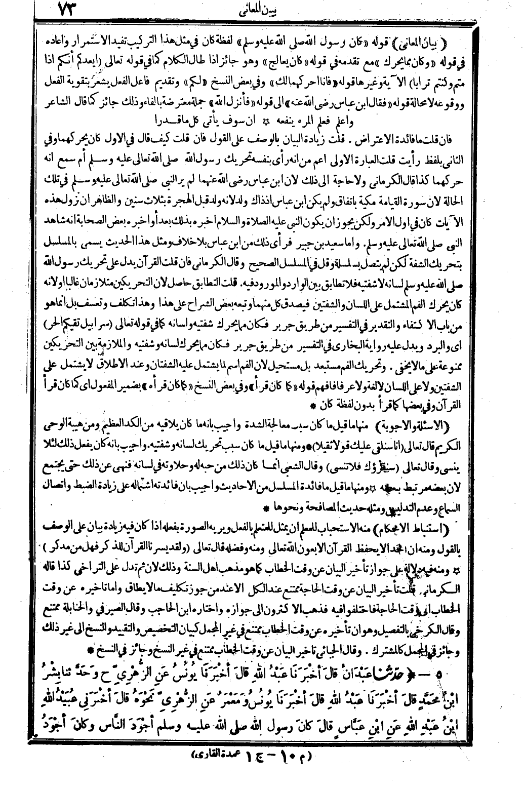 فَإِن قلت مَا فَائِدَة الِاعْتِرَاض. قلت زِيَادَة الْبَيَان بِالْوَصْفِ على القَوْل فَإِن قلت كَيفَ قَالَ فِي الأول كَانَ يحركهما وَفِي الثَّانِي بِلَفْظ رَأَيْت قلت الْعبارَة الأولى أَعم من أَنه رأى بِنَفسِهِ تَحْرِيك رَسُول الله صلى الله عَلَيْهِ وَسلم أم سمع أَنه حركهما كَذَا قَالَ الْكرْمَانِي وَلَا حَاجَة إِلَى ذَلِك لِأَن ابْن عَبَّاس رَضِي الله عَنْهُمَا لم ير النَّبِي صلى الله عَلَيْهِ وَسلم فِي تِلْكَ الْحَالة لِأَن سُورَة الْقِيَامَة مَكِّيَّة بِاتِّفَاق وَلم يكن ابْن عَبَّاس إِذْ ذَاك ولد لِأَنَّهُ ولد قبل الْهِجْرَة بِثَلَاث سِنِين وَالظَّاهِر أَن نزُول هَذِه الْآيَات كَانَ فِي أول الْأَمر وَلَكِن يجوز أَن يكون النَّبِي صلى الله عَلَيْهِ وَسلم أخبرهُ بذلك بعد أَو أخبرهُ بعض الصَّحَابَة أَنه شَاهد النَّبِي صلى الله عَلَيْهِ وَسلم. وَأما سعيد بن جُبَير فَرَأى ذَلِك من ابْن عَبَّاس بِلَا خلاف وَمثل هَذَا الحَدِيث يُسمى بالمسلسل بتحريك الشّفة لَكِن لم يتَّصل بسلسلة وَقل فِي المسلسل الصَّحِيح وَقَالَ الْكرْمَانِي فَإِن قلت الْقُرْآن يدل على تَحْرِيك رَسُول الله صلى الله عَلَيْهِ وَسلم لِسَانه لَا شَفَتَيْه فَلَا تطابق بَين الْوَارِد والمورود فِيهِ. قلت التطابق حَاصِل لِأَن التحريكين متلازمان غَالِبا أَو لِأَنَّهُ كَانَ يُحَرك الْفَم الْمُشْتَمل على اللِّسَان والشفتين فَيصدق كل مِنْهُمَا وَتَبعهُ بعض الشُّرَّاح على هَذَا وَهَذَا تكلّف وتعسف بل إِنَّمَا هُوَ من بَاب الِاكْتِفَاء وَالتَّقْدِير فِي التَّفْسِير من طَرِيق جرير فَكَانَ مِمَّا يُحَرك شَفَتَيْه وَلسَانه كَمَا فِي قَوْله تَعَالَى {سرابيل تقيكم الْحر} أَي وَالْبرد وَيدل عَلَيْهِ رِوَايَة البُخَارِيّ فِي التَّفْسِير من طَرِيق جرير فَكَانَ مِمَّا يُحَرك لِسَانه وشفتيه والملازمة بَين التحريكين مَمْنُوعَة على مَا لَا يخفى. وتحريك الْفَم مستبعد بل مُسْتَحِيل لِأَن الْفَم اسْم لما يشْتَمل عَلَيْهِ الشفتان وَعند الْإِطْلَاق لَا يشْتَمل على الشفتين وَلَا على اللِّسَان لَا لُغَة وَلَا عرفا فَافْهَم قَوْله كَمَا كَانَ قَرَأَ وَفِي بعض النّسخ كَمَا كَانَ قَرَأَهُ بضمير الْمَفْعُول أَي كَمَا كَانَ قَرَأَ الْقُرْآن وَفِي بَعْضهَا كَمَا قَرَأَ بِدُونِ لَفْظَة كَانَ (الأسئلة والأجوبة) مِنْهَا مَا قيل مَا كَانَ سَبَب معالجة الشدَّة وَأجِيب بِأَنَّهُ مَا كَانَ يلاقيه من الكد الْعَظِيم وَمن هَيْبَة الْوَحْي الْكَرِيم قَالَ تَعَالَى {إِنَّا سنلقي عَلَيْك قولا ثقيلا} وَمِنْهَا مَا قيل مَا كَانَ سَبَب تَحْرِيك لِسَانه وشفتيه. وَأجِيب بِأَنَّهُ كَانَ يفعل ذَلِك لِئَلَّا ينسى وَقَالَ تَعَالَى {سنقرؤك فَلَا تنسى الْأَعْلَى} وَقَالَ الشّعبِيّ إِنَّمَا كَانَ ذَلِك من حبه لَهُ وحلاوته فِي لِسَانه فَنهى عَن ذَلِك حَتَّى يجْتَمع لِأَن بعضه مُرْتَبِط بِبَعْضِه وَمِنْهَا مَا قيل مَا فَائِدَة المسلسل من الْأَحَادِيث وَأجِيب بِأَن فَائِدَته اشتماله على زِيَادَة الضَّبْط واتصال السماع وَعدم التَّدْلِيس وَمثله حَدِيث المصافحة وَنَحْوهَا (استنباط الْأَحْكَام) مِنْهُ الِاسْتِحْبَاب للمعلم أَن يمثل للمتعلم بِالْفِعْلِ ويريه الصُّورَة بِفِعْلِهِ إِذا كَانَ فِيهِ زِيَادَة بَيَان على الْوَصْف بالْقَوْل وَمِنْه أَن أحدا لَا يحفظ الْقُرْآن إِلَّا بعون الله تَعَالَى وَمِنْه وفضله قَالَ تَعَالَى {وَلَقَد يسرنَا الْقُرْآن للذّكر فَهَل من مُذَكّر الْقَمَر و 22} وَمِنْه فِيهِ دلَالَة على جَوَاز تَأْخِير الْبَيَان عَن وَقت الْخطاب كَمَا هُوَ مَذْهَب أهل السّنة وَذَلِكَ لِأَن ثمَّ تدل على التَّرَاخِي كَذَا قَالَه الْكرْمَانِي قلت تَأْخِير الْبَيَان عَن وَقت الْحَاجة مُمْتَنع عِنْد الْكل إِلَّا عِنْد من جوز تَكْلِيف مَا لَا يُطَاق وَأما تَأْخِيره عَن وَقت الْخطاب إِلَى وَقت ا