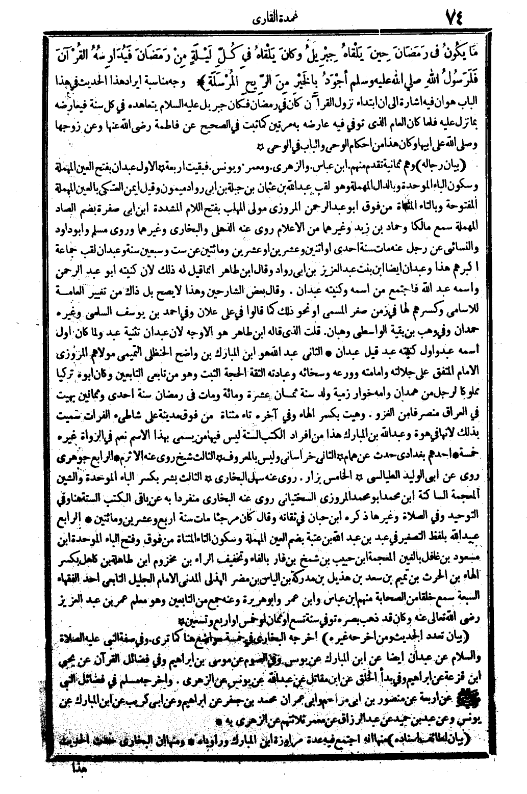 مَا يكون فِي رَمَضَان حِين يلقاه جِبْرِيل وَكَانَ يلقاه فِي كل لَيْلَة من رَمَضَان فيدارسه الْقُرْآن فلرسول الله صلى الله عَلَيْهِ وَسلم أَجود بِالْخَيرِ من الرّيح الْمُرْسلَة) وَجه مُنَاسبَة إِيرَاد هَذَا الحَدِيث فِي هَذَا الْبَاب هُوَ أَن فِيهِ إِشَارَة إِلَى أَن ابْتِدَاء نزُول الْقُرْآن كَانَ فِي رَمَضَان فَكَانَ جِبْرِيل عَلَيْهِ السَّلَام يتعاهده فِي كل سنة فيعارضه بِمَا نزل عَلَيْهِ فَلَمَّا كَانَ الْعَام الَّذِي توفّي فِيهِ عَارضه بِهِ مرَّتَيْنِ كَمَا ثَبت فِي الصَّحِيح عَن فَاطِمَة رَضِي الله عَنْهَا وَعَن زَوجهَا وَصلى الله على أَبِيهَا وَكَانَ هَذَا من أَحْكَام الْوَحْي وَالْبَاب فِي الْوَحْي (بَيَان رِجَاله) وهم ثَمَانِيَة تقدم مِنْهُم. ابْن عَبَّاس. وَالزهْرِيّ. وَمعمر. وَيُونُس. فَبَقيت أَرْبَعَة الأول عَبْدَانِ بِفَتْح الْعين الْمُهْملَة وَسُكُون الْبَاء الْمُوَحدَة وبالدال الْمُهْملَة وَهُوَ لقب عبد الله بن عُثْمَان بن جبلة بن أبي رواد مَيْمُون وَقيل أَيمن الْعَتكِي بِالْعينِ الْمُهْملَة الْمَفْتُوحَة وبالتاء الْمُثَنَّاة من فَوق أَبُو عبد الرَّحْمَن الْمروزِي مولى الْمُهلب بِفَتْح اللَّام الْمُشَدّدَة ابْن أبي صفرَة بِضَم الصَّاد الْمُهْملَة سمع مَالِكًا وَحَمَّاد بن زيد وَغَيرهمَا من الْأَعْلَام روى عَنهُ الذهلي وَالْبُخَارِيّ وَغَيرهمَا وروى مُسلم وَأَبُو دَاوُد وَالنَّسَائِيّ عَن رجل عَنهُ مَاتَ سنة إِحْدَى أَو اثْنَيْنِ وَعشْرين أَو عشْرين وَمِائَتَيْنِ عَن سِتّ وَسبعين سنة وعبدان لقب جمَاعَة أكبرهم هَذَا وعبدان أَيْضا ابْن بنت عبد الْعَزِيز بن أبي رواد وَقَالَ ابْن طَاهِر إِنَّمَا قيل لَهُ ذَلِك لِأَن كنيته أَبُو عبد الرَّحْمَن واسْمه عبد الله فَاجْتمع من اسْمه وكنيته عَبْدَانِ. وَقَالَ بعض الشَّارِحين وَهَذَا لَا يَصح بل ذَاك من تَغْيِير الْعَامَّة للأسامي وكسرهم لَهَا فِي زمن صغر الْمُسَمّى أَو نَحْو ذَلِك كَمَا قَالُوا فِي عَليّ عَلان وَفِي أَحْمد بن يُوسُف السّلمِيّ وَغَيره حمدَان وَفِي وهب بن بَقِيَّة الوَاسِطِيّ وهبان. قلت الَّذِي قَالَه ابْن طَاهِر هُوَ الْأَوْجه لِأَن عَبْدَانِ تَثْنِيَة عبد وَلما كَانَ أول اسْمه عبد وَأول كنيته عبد قيل عَبْدَانِ الثَّانِي عبد الله هُوَ ابْن الْمُبَارك بن وَاضح الْحَنْظَلِي التَّمِيمِي مَوْلَاهُم الْمروزِي الإِمَام الْمُتَّفق على جلالته وإمامته وورعه وسخائه وعبادته الثِّقَة الْحجَّة الثبت وَهُوَ من تَابِعِيّ التَّابِعين وَكَانَ أَبوهُ تركيا مَمْلُوكا لرجل من هَمدَان وَأمه خوارزمية ولد سنة ثَمَان عشرَة وَمِائَة وَمَات فِي رَمَضَان سنة إِحْدَى وَثَمَانِينَ بهيت فِي الْعرَاق منصرفا من الْغَزْو. وهيت بِكَسْر الْهَاء وَفِي آخِره تَاء مثناة من فَوق مَدِينَة على شاطىء الْفُرَات سميت بذلك لِأَنَّهَا فِي هوة وَعبد الله بن الْمُبَارك هَذَا من أَفْرَاد الْكتب السِّتَّة لَيْسَ فِيهَا من يُسمى بِهَذَا الِاسْم نعم فِي الروَاة غَيره خَمْسَة أحدهم بغدادي حدث عَن همام الثَّانِي خراساني وَلَيْسَ بِالْمَعْرُوفِ الثَّالِث شيخ روى عَنهُ الْأَثْرَم الرَّابِع جوهري روى عَن أبي الْوَلِيد الطَّيَالِسِيّ الْخَامِس بزار. روى عَنهُ سهل البُخَارِيّ الثَّالِث بشر بِكَسْر الْبَاء الْمُوَحدَة والشين الْمُعْجَمَة الساكنة ابْن مُحَمَّد أَبُو مُحَمَّد الْمروزِي السّخْتِيَانِيّ روى عَنهُ البُخَارِيّ مُنْفَردا بِهِ عَن بَاقِي الْكتب السِّتَّة هُنَا وَفِي التَّوْحِيد وَفِي الصَّلَاة وَغَيرهَا ذكره ابْن حبَان فِي ثقاته وَقَالَ كَانَ مرجئا مَاتَ سنة أَربع وَعشْرين وَمِائَتَيْنِ الرَّابِع عبيد الله بِلَفْظ التصغير فِي عبد بن عبد الله بن عتبَة بِضَم الْعين الْمُهْملَة وَسُكُون التَّاء الْمُثَنَّاة من فَوق وَفتح الْبَاء الْمُوَحدَة ابْن مَسْعُود بن غافل بالغ
