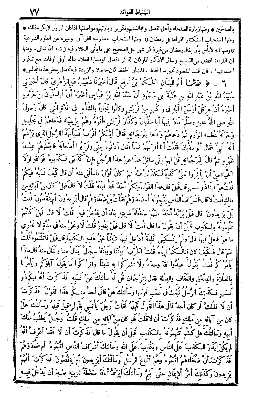 6 - (حَدثنَا أَبُو الْيَمَان الحكم بن نَافِع قَالَ أخبرنَا شُعَيْب عَن الزُّهْرِيّ قَالَ أَخْبرنِي عبيد الله بن عبد الله بن عتبَة بن مَسْعُود أَن عبد الله بن عَبَّاس أخبرهُ أَن أَبَا سُفْيَان بن حَرْب أخبرهُ أَن هِرقل أرسل إِلَيْهِ فِي ركب من قُرَيْش وَكَانُوا تجارًا بالشأم فِي الْمدَّة الَّتِي كَانَ رَسُول الله صلى الله عَلَيْهِ وَسلم ماد فِيهَا أَبَا سُفْيَان وكفار قُرَيْش فَأتوهُ وهم بإيلياء فَدَعَاهُمْ فِي مَجْلِسه وَحَوله عُظَمَاء الرّوم ثمَّ دعاهم ودعا بترجمانه فَقَالَ أَيّكُم أقرب نسبا بِهَذَا الرجل الَّذِي يزْعم أَنه نَبِي فَقَالَ أَبُو سُفْيَان فَقلت أَنا أقربهم نسبا فَقَالَ أدنوه مني وقربوا أَصْحَابه فاجعلوهم عِنْد ظَهره ثمَّ قَالَ لِترْجُمَانِهِ قل لَهُم إِنِّي سَائل هَذَا عَن هَذَا الرجل فَإِن كَذبَنِي فَكَذبُوهُ فوَاللَّه لَوْلَا الْحيَاء من أَن يأثروا عَليّ كذبا لكذبت عَنهُ ثمَّ كَانَ أول مَا سَأَلَني عَنهُ أَن قَالَ كَيفَ نسبه فِيكُم قلت هُوَ فِينَا ذُو نسب قَالَ فَهَل قَالَ هَذَا القَوْل مِنْكُم أحد قطّ قبله قلت لَا قَالَ فَهَل كَانَ من آبَائِهِ من ملك قلت لَا قَالَ فأشراف النَّاس يتبعونه أم ضُعَفَاؤُهُمْ فَقلت بل ضُعَفَاؤُهُمْ قَالَ أيزيدون أم ينقصُونَ قلت بل يزِيدُونَ قَالَ فَهَل يرْتَد أحد مِنْهُم سخطَة لدينِهِ بعد أَن يدْخل فِيهِ قلت لَا قَالَ فَهَل كُنْتُم تَتَّهِمُونَهُ بِالْكَذِبِ قبل أَن يَقُول مَا قَالَ قلت لَا قَالَ فَهَل يغدر قلت لَا وَنحن مِنْهُ فِي مُدَّة لَا نَدْرِي مَا هُوَ فَاعل فِيهَا قَالَ وَلم تمكني كلمة أَدخل فِيهَا شَيْئا غير هَذِه الْكَلِمَة قَالَ فَهَل قاتلتموه قلت نعم قَالَ فَكيف كَانَ قتالكم إِيَّاه قلت الْحَرْب بَيْننَا وَبَينه سِجَال ينَال منا وننال مِنْهُ قَالَ مَاذَا يَأْمُركُمْ قلت يَقُول اعبدوا الله وَحده وَلَا تُشْرِكُوا بِهِ شَيْئا واتركوا مَا يَقُول آباؤكم ويأمرنا بِالصَّلَاةِ والصدق والعفاف والصلة فَقَالَ للترجمان قل لَهُ سَأَلتك عَن نسبه فَذكرت أَنه فِيكُم ذُو نسب فَكَذَلِك الرُّسُل تبْعَث فِي نسب قَومهَا وَسَأَلْتُك هَل قَالَ أحد مِنْكُم هَذَا القَوْل فَذكرت أَن لَا فَقلت لَو كَانَ أحد قَالَ هَذَا القَوْل قبله لَقلت رجل يأتسي بقول قيل قبله وَسَأَلْتُك هَل كَانَ من آبَائِهِ من ملك فَذكرت أَن لَا قلت فَلَو كَانَ من آبَائِهِ من ملك قلت رجل يطْلب ملك أَبِيه وَسَأَلْتُك هَل كُنْتُم تَتَّهِمُونَهُ بِالْكَذِبِ قبل أَن يَقُول مَا قَالَ فَذكرت أَن لَا فقد أعرف أَنه لم يكن ليذر الْكَذِب على النَّاس ويكذب على الله وَسَأَلْتُك أَشْرَاف النَّاس اتَّبعُوهُ أم ضُعَفَاؤُهُمْ فَذكرت أَن ضعفاءهم اتَّبعُوهُ وهم أَتبَاع الرُّسُل وَسَأَلْتُك أيزيدون أم ينقصُونَ فَذكرت أَنهم يزِيدُونَ وَكَذَلِكَ أَمر الْإِيمَان حَتَّى يتم وَسَأَلْتُك أيرتد أحد سخطَة لدينِهِ بعد أَن يدْخل فِيهِ