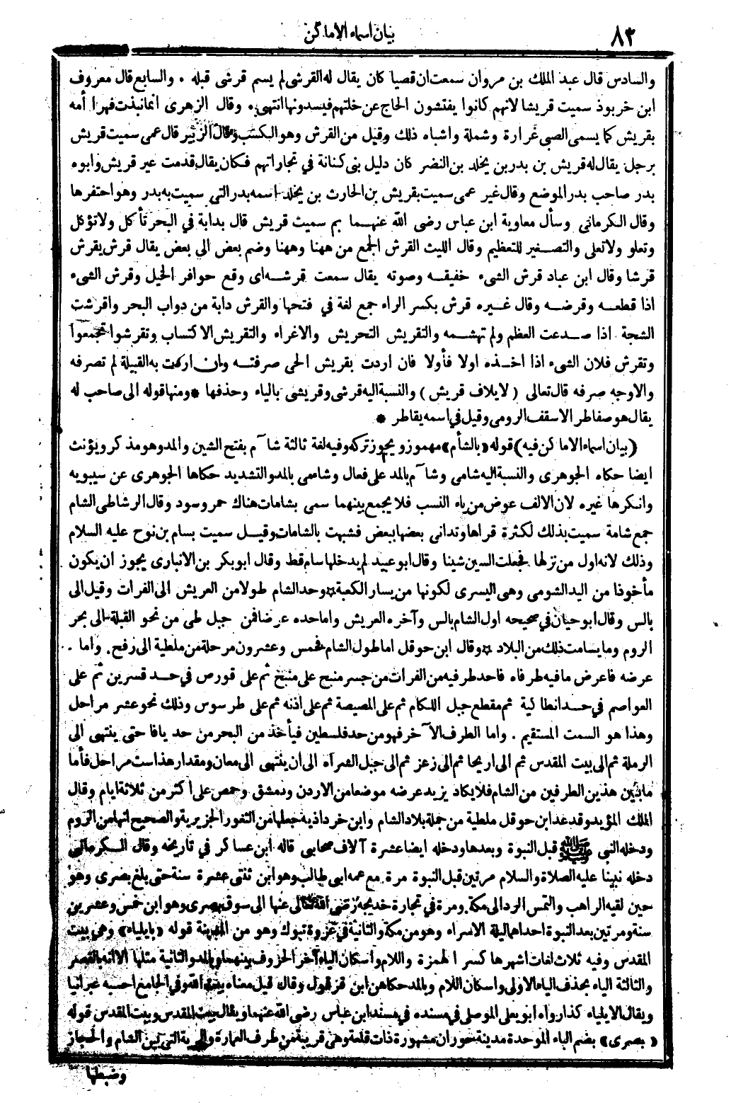 وَالسَّادِس قَالَ عبد الْملك بن مَرْوَان سَمِعت أَن قصيا كَانَ يُقَال لَهُ الْقرشِي لم يسم قرشي قبله. وَالسَّابِع قَالَ مَعْرُوف بن خَرَّبُوذ سميت قُريْشًا لأَنهم كَانُوا يفتشون الْحَاج عَن خلتهم فيسدونها انْتهى. وَقَالَ الزُّهْرِيّ إِنَّمَا نبذت فهرا أمه بِقُرَيْش كَمَا يُسمى الصَّبِي غرارة وشملة وَأَشْبَاه ذَلِك وَقيل من القرش وَهُوَ الْكسْب وَقَالَ الزبير قَالَ عمي سميت قُرَيْش بِرَجُل يُقَال لَهُ قُرَيْش بن بدر بن يخلد بن النَّضر كَانَ دَلِيل بني كنَانَة فِي تجاراتهم فَكَانَ يُقَال قدمت عير قُرَيْش وَأَبوهُ بدر صَاحب بدر الْموضع وَقَالَ غير عمي سميت بِقُرَيْش بن الْحَارِث بن يخلد اسْمه بدر الَّتِي سميت بِهِ بدر وَهُوَ احتفرها وَقَالَ الْكرْمَانِي وَسَأَلَ مُعَاوِيَة ابْن عَبَّاس رَضِي الله عَنْهُمَا بِمَ سميت قُرَيْش قَالَ بِدَابَّة فِي الْبَحْر تَأْكُل وَلَا تُؤْكَل وَتَعْلُو وَلَا تعلى والتصغير للتعظيم وَقَالَ اللَّيْث القرش الْجمع من هَهُنَا وَهَهُنَا وَضم بعض إِلَى بعض يُقَال قِرْش يقرش قرشا وَقَالَ ابْن عباد قِرْش الشَّيْء خفيقه وصوته يُقَال سَمِعت قرشه أَي وَقع حوافر الْخَيل وقرش الشَّيْء إِذا قطعه وقرضه وَقَالَ غَيره قِرْش بِكَسْر الرَّاء جمع لُغَة فِي فتحهَا والقرش دَابَّة من دَوَاب الْبَحْر وأقرشت الشَّجَّة إِذا صدعت الْعظم وَلم تهشمه والتقريش التحريش والإغراء والتقريش الِاكْتِسَاب وتقرشوا تجمعُوا وتقرش فلَان الشَّيْء إِذا أَخذه أَولا فأولا فَإِن أردْت بِقُرَيْش الْحَيّ صرفته وَإِن أردْت بِهِ الْقَبِيلَة لم تصرفه وَالْأَوْجه صرفه قَالَ تَعَالَى {لِإِيلَافِ قُرَيْش} وَالنِّسْبَة إِلَيْهِ قرشي وقريشي بِالْيَاءِ وحذفها وَمِنْهَا قَوْله إِلَى صَاحب لَهُ يُقَال هُوَ صفاطر الأسقف الرُّومِي وَقيل فِي اسْمه يقاطر (بَيَان أَسمَاء الْأَمَاكِن فِيهِ) قَوْله بالشأم مَهْمُوز وَيجوز تَركه وَفِيه لُغَة ثَالِثَة شآم بِفَتْح الشين وَالْمدّ وَهُوَ مُذَكّر وَيُؤَنث أَيْضا حَكَاهُ الْجَوْهَرِي وَالنِّسْبَة إِلَيْهِ شَامي وشآم بِالْمدِّ على فعال وشاءمى بِالْمدِّ وَالتَّشْدِيد حَكَاهَا الْجَوْهَرِي عَن سِيبَوَيْهٍ وأنكرها غَيره لِأَن الْألف عوض من يَاء النّسَب فَلَا يجمع بَينهمَا سمى بشامات هُنَاكَ حمر وسود وَقَالَ الرشاطي الشَّام جمع شامة سميت بذلك لِكَثْرَة قراها وتداني بَعْضهَا بِبَعْض فشبهت بالشامات وَقيل سميت بسام بن نوح عَلَيْهِ السَّلَام وَذَلِكَ لِأَنَّهُ أول من نزلها فَجعلت السِّين شينا وَقَالَ أَبُو عبيد لم يدخلهَا سَام قطّ وَقَالَ أَبُو بكر بن الْأَنْبَارِي يجوز أَن يكون مأخوذا من الْيَد الشومى وَهِي الْيُسْرَى لكَونهَا من يسَار الْكَعْبَة وحد الشَّام طولا من الْعَريش إِلَى الْفُرَات وَقيل إِلَى بالس وَقَالَ أَبُو حَيَّان فِي صَحِيحه أول الشَّام بالس وَآخره الْعَريش وَأما حَده عرضا فَمن جبل طي من نَحْو الْقبْلَة إِلَى بَحر الرّوم وَمَا يسامت ذَلِك من الْبِلَاد وَقَالَ ابْن حوقل أما طول الشَّام فَخمس وَعِشْرُونَ مرحلة من ملطية إِلَى رفح. وَأما عرضه فَأَعْرض مَا فِيهِ طرفاه فأحد طَرفَيْهِ من الْفُرَات من جسر منبح على منبح ثمَّ على قورص فِي حد قسرين ثمَّ على العواصم فِي حد أنطاكية ثمَّ مقطع جبل اللكام ثمَّ على المصيصة ثمَّ على أُذُنه ثمَّ على طرسوس وَذَلِكَ نَحْو عشر مراحل وَهَذَا هُوَ السمت الْمُسْتَقيم. وَأما الطّرف الآخر فَهُوَ من حد فلسطين فَيَأْخُذ من الْبَحْر من حد يافا حَتَّى يَنْتَهِي إِلَى الرملة ثمَّ إِلَى بَيت الْمُقَدّس ثمَّ إِلَى أرِيحَا ثمَّ إِلَى زعز ثمَّ إِلَى جبل الشراه إِلَى أَن يَنْتَهِي إِلَى معَان وَمِقْدَار هَذَا سِتّ مراحل فَأَما مَا بَين هذَيْن الطَّرفَيْنِ من الشَّام فَلَا يكَاد يزِيد عرضه موضعا من الْأُرْدُن ودمشق وحمص على أَكثر من ثَلَاثَة أَيَّام وَقَالَ الْملك الْمُ