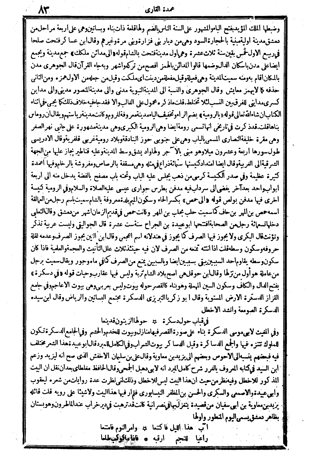 وضبطها الْملك الْمُؤَيد بِفَتْح الْبَاء وَالْمَشْهُور على السّنة النَّاس بِالضَّمِّ وَلها قلعة ذَات بِنَاء وبساتين وَهِي على أَرْبَعَة مراحل من دمشق مَدِينَة أولية مَبْنِيَّة بِالْحِجَارَةِ السود وَهِي من ديار بني فَزَارَة وَبني مرّة وَغَيرهم وَقَالَ ابْن عَسَاكِر فتحت صلحا فِي ربيع الأول لخمس بَقينَ سنة ثَلَاث عشرَة وَهِي أول مَدِينَة فتحت بِالشَّام قَوْله إِلَى مَدَائِن ملكك جمع مَدِينَة وَيجمع أَيْضا على مدن بِإِسْكَان الدَّال وَضمّهَا قَالُوا الْمَدَائِن بِالْهَمْز أفْصح من تَركه وَأشهر وَبِه جَاءَ الْقُرْآن قَالَ الْجَوْهَرِي مدن بِالْمَكَانِ أَقَامَ بِهِ وَمِنْه سميت الْمَدِينَة وَهِي فعيلة وَقيل مفعلة من دينت أَي ملكت وَقيل من جعله من الأول همزه وَمن الثَّانِي حذفه كَمَا لَا يهمز معايش وَقَالَ الْجَوْهَرِي وَالنِّسْبَة إِلَى الْمَدِينَة النَّبَوِيَّة مدنِي وَإِلَى مَدِينَة الْمَنْصُور مديني وَإِلَى مداين كسْرَى مدايني للْفرق بَين النّسَب لِئَلَّا تختلط. قلت مَا ذكره مَحْمُول على الْغَالِب وَإِلَّا فقد جَاءَ فِيهِ خلاف ذَلِك كَمَا يَجِيء فِي أثْنَاء الْكتاب إِن شَاءَ الله تَعَالَى قَوْله بالرومية بِضَم الرَّاء وَتَخْفِيف الْيَاء مَدِينَة مَعْرُوفَة للروم وَكَانَت مَدِينَة رياستهم وَيُقَال أَن روماس بناها قلت. قد ذكرت فِي تاريخي أَنَّهَا تسمى رومة أَيْضا وَهِي الرومية الْكُبْرَى وَهِي مَدِينَة مَشْهُورَة على جَانِبي نهر الصغر وَهِي مقرة خَليفَة النَّصَارَى الْمُسَمّى بِالْبَابِ وَهِي على جنوبي حوز البنادقة وبلاد رُومِية غربي قلفرية وَقَالَ الإدريسي طول سورها أَرْبَعَة وَعِشْرُونَ ميلًا وَهُوَ مَبْنِيّ بالآجر وَلها وَاد يشق وسط الْمَدِينَة وَعَلِيهِ قناطير يجاز عَلَيْهَا من الْجِهَة الشرقية إِلَى الغربية وَقَالَ أَيْضا امتداد كنيستها سِتّمائَة ذِرَاع فِي مثله وَهِي مسقفة بالرصاص ومفروشة بالرخام وفيهَا أعمدة كَثِيرَة عَظِيمَة وَفِي صدر الْكَنِيسَة كرْسِي من ذهب يجلس عَلَيْهِ الْبَاب وَتَحْته بَاب مصفح بِالْفِضَّةِ يدْخل مِنْهُ إِلَى أَرْبَعَة أَبْوَاب وَاحِد بعد آخر يُفْضِي إِلَى سرداب فِيهِ مدفن بطرس حوارِي عِيسَى عَلَيْهِ الصَّلَاة وَالسَّلَام وَفِي الرومية كَنِيسَة أُخْرَى فِيهَا مدفن بولص قَوْله إِلَى حمص بِكَسْر الْحَاء وَسُكُون الْمِيم بَلْدَة مَعْرُوفَة بِالشَّام سميت باسم رجل من العمالقة اسْمه حمص بن الْمهْر بن حاف كَمَا سميت حلب بحلب بن الْمهْر وَكَانَت حمص فِي قديم الزَّمَان أشهر من دمشق وَقَالَ الثَّعْلَبِيّ دَخلهَا تِسْعمائَة رجل من الصَّحَابَة افتتحها أَبُو عُبَيْدَة بن الْجراح سنة سِتّ عشرَة قَالَ الجواليقي وَلَيْسَت عَرَبِيَّة تذكر وتؤنث قَالَ الْبكْرِيّ وَلَا يجوز فِيهَا الصّرْف كَمَا يجوز فِي هِنْد لِأَنَّهُ اسْم أعجمي وَقَالَ ابْن التِّين يجوز الصّرْف وَعَدَمه لقلَّة حُرُوفه وَسُكُون وَسطه قلت إِذا أنثته تَمنعهُ من الصّرْف لِأَن فِيهِ حِينَئِذٍ ثَلَاث علل التَّأْنِيث والعجمة والعلمية فَإِذا كَانَ سُكُون وَسطه يُقَاوم أحد السببين يبْقى بسببين أَيْضا وبالسببين يمْنَع من الصّرْف كَمَا فِي ماه وجور وَيُقَال سميت بِرَجُل من عاملة هُوَ أول من نزلها وَقَالَ ابْن حوقل هِيَ أصح بِلَاد الشَّام تربة وَلَيْسَ فِيهَا عقارب وحيات قَوْله فِي دسكرة بِفَتْح الدَّال وَالْكَاف وَسُكُون السِّين الْمُهْملَة وَهُوَ بِنَاء كالقصر حوله بيُوت وَلَيْسَ بعربي وَهِي بيُوت الْأَعَاجِم وَفِي جَامع الْقَزاز الدسكرة الأَرْض المستوية وَقَالَ أَبُو زَكَرِيَّا التبريزي الدسكرة مُجْتَمع الْبَسَاتِين والرياض وَقَالَ ابْن سَيّده الدسكرة الصومعة وَأنْشد الأخطل