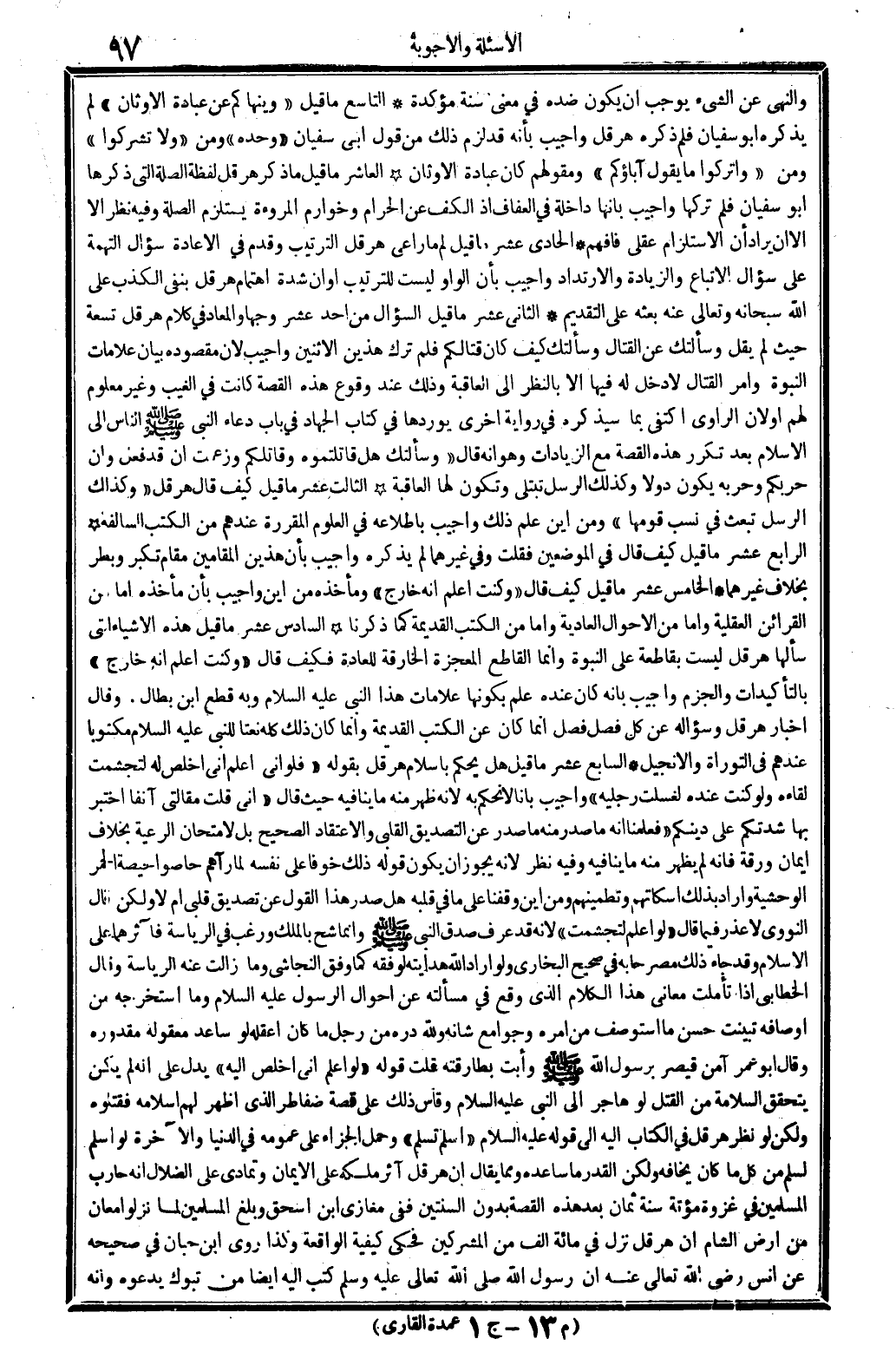 وَالنَّهْي عَن الشَّيْء يُوجب أَن يكون ضِدّه فِي معنى سنة مُؤَكدَة التَّاسِع مَا قيل وينهاكم عَن عبَادَة الْأَوْثَان لم يذكرهُ أَبُو سُفْيَان فَلم ذكره هِرقل وَأجِيب بِأَنَّهُ قد لزم ذَلِك من قَول أبي سُفْيَان وَحده وَمن وَلَا تُشْرِكُوا وَمن واتركوا مَا يَقُول آباؤكم ومقولهم كَانَ عبَادَة الْأَوْثَان الْعَاشِر مَا قيل مَا ذكر هِرقل لَفْظَة الصِّلَة الَّتِي ذكرهَا أَبُو سُفْيَان فَلم تَركهَا وَأجِيب بِأَنَّهَا دَاخِلَة فِي العفاف إِذْ الْكَفّ عَن الْحَرَام وخوارم الْمُرُوءَة يسْتَلْزم الصِّلَة وَفِيه نظر إِلَّا أَن يُرَاد أَن الاستلزام عَقْلِي فَافْهَم الْحَادِي عشر مَا قيل لم مَا رَاعى هِرقل التَّرْتِيب وَقدم فِي الْإِعَادَة سُؤال التُّهْمَة على سُؤال الِاتِّبَاع وَالزِّيَادَة والارتداد وَأجِيب بِأَن الْوَاو لَيست للتَّرْتِيب أَو أَن شدَّة اهتمام هِرقل بِنَفْي الْكَذِب على الله سُبْحَانَهُ وَتَعَالَى عَنهُ بَعثه على التَّقْدِيم الثَّانِي عشر مَا قيل السُّؤَال من أحد عشر وَجها والمعاد فِي كَلَام هِرقل تِسْعَة حَيْثُ لم يقل وَسَأَلْتُك عَن الْقِتَال وَسَأَلْتُك كَيفَ كَانَ قتالكم فَلم ترك هذَيْن الْإِثْنَيْنِ وَأجِيب لِأَن مَقْصُوده بَيَان عَلَامَات النُّبُوَّة وَأمر الْقِتَال لَا دخل لَهُ فِيهَا إِلَّا بِالنّظرِ إِلَى الْعَاقِبَة وَذَلِكَ عِنْد وُقُوع هَذِه الْقِصَّة كَانَت فِي الْغَيْب وَغير مَعْلُوم لَهُم أَو لِأَن الرَّاوِي اكْتفى بِمَا سَيذكرُهُ فِي رِوَايَة أُخْرَى يوردها فِي كتاب الْجِهَاد فِي بَاب دُعَاء النَّبِي صلى الله عَلَيْهِ وَسلم النَّاس إِلَى الْإِسْلَام بعد تكَرر هَذِه الْقِصَّة مَعَ الزِّيَادَات وَهُوَ أَنه قَالَ وَسَأَلْتُك هَل قاتلتموه وقاتلكم وَزَعَمت أَن قد فعل وَأَن حربكم وحربه يكون دولا وَكَذَلِكَ الرُّسُل تبتلى وَتَكون لَهَا الْعَاقِبَة الثَّالِث عشر مَا قيل كَيفَ قَالَ هِرقل وَكَذَلِكَ الرُّسُل تبْعَث فِي نسب قَومهَا وَمن أَيْن علم ذَلِك وَأجِيب باطلاعه فِي الْعُلُوم المقررة عِنْدهم من الْكتب السالفة الرَّابِع عشر مَا قيل كَيفَ قَالَ فِي الْمَوْضِعَيْنِ فَقلت وَفِي غَيرهمَا لم يذكرهُ وَأجِيب بِأَن هذَيْن المقامين مقَام تكبر وبطر بِخِلَاف غَيرهمَا الْخَامِس عشر مَا قيل كَيفَ قَالَ وَكنت أعلم أَنه خَارج ومأخذه من أَيْن وَأجِيب بِأَن مأخذه أما من الْقَرَائِن الْعَقْلِيَّة وَأما من الْأَحْوَال العادية وَأما من الْكتب الْقَدِيمَة كَمَا ذكرنَا السَّادِس عشر مَا قيل هَذِه الْأَشْيَاء الَّتِي سَأَلَهَا هِرقل لَيست بقاطعة على النُّبُوَّة وَإِنَّمَا الْقَاطِع المعجزة الخارقة للْعَادَة فَكيف قَالَ وَكنت أعلم أَنه خَارج بالتأكيدات والجزم وَأجِيب بِأَنَّهُ كَانَ عِنْده علم بِكَوْنِهَا عَلَامَات هَذَا النَّبِي صلى الله عَلَيْهِ وَسلم وَبِه قطع ابْن بطال. وَقَالَ أَخْبَار هِرقل وسؤاله عَن كل فصل فصل إِنَّمَا كَانَ عَن الْكتب الْقَدِيمَة وَإِنَّمَا كَانَ ذَلِك كُله نعتا للنَّبِي صلى الله عَلَيْهِ وَسلم مَكْتُوبًا عِنْدهم فِي التَّوْرَاة وَالْإِنْجِيل السَّابِع عشر مَا قيل هَل يحكم بِإِسْلَام هِرقل بقوله فَلَو أَنِّي أعلم أَنِّي أخْلص لَهُ لتجشمت لقاءه وَلَو كنت عِنْده لغسلت رجلَيْهِ وَأجِيب بِأَنا لَا نحكم بِهِ لِأَنَّهُ ظهر مِنْهُ مَا يُنَافِيهِ حَيْثُ قَالَ إِنِّي قلت مَقَالَتي آنِفا أختبر بهَا شدتكم على دينكُمْ فَعلمنَا أَنه مَا صدر مِنْهُ مَا صدر عَن التَّصْدِيق القلبي والاعتقاد الصَّحِيح بل لامتحان الرّعية بِخِلَاف إِيمَان ورقة فَإِنَّهُ لم يظْهر مِنْهُ مَا يُنَافِيهِ وَفِيه نظر لِأَنَّهُ يجوز أَن يكون قَوْله ذَلِك خوفًا على نَفسه لما رَآهُمْ حاصوا حَيْصَة الْحمر الوحشية وَأَرَادَ بذلك إسكاتهم وتطمينهم وَمن أَيْن وقفنا على مَا فِي قلبه هَل صدر هَذَا القَوْل عَن تَصْد