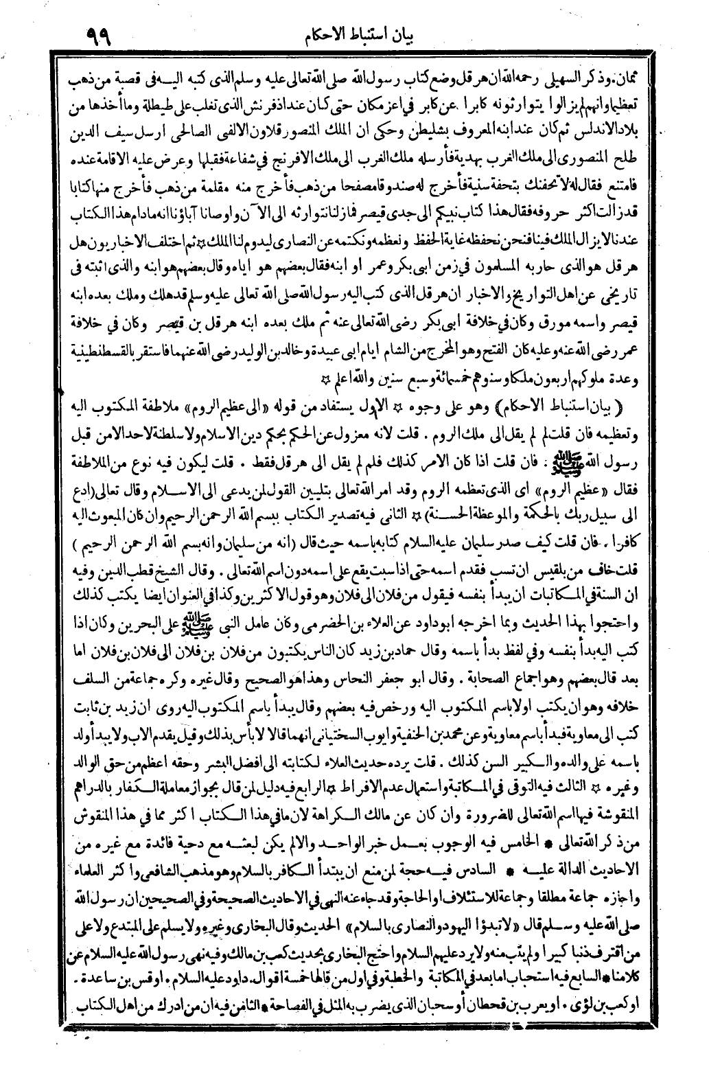 ثَمَان. وَذكر السُّهيْلي رَحمَه الله أَن هِرقل وضع كتاب رَسُول الله صلى الله عَلَيْهِ وَسلم الَّذِي كتبه إِلَيْهِ فِي قَصَبَة من ذهب تَعْظِيمًا وَأَنَّهُمْ لم يزَالُوا يتوارثونه كَابِرًا عَن كَابر فِي أعز مَكَان حَتَّى كَانَ عِنْد اذفرنش الَّذِي تغلب على طيطلة وَمَا أَخذهَا من بِلَاد الأندلس ثمَّ كَانَ عِنْد ابْنه الْمَعْرُوف بشليطن وَحكى أَن الْملك الْمَنْصُور قلاون الألفي الصَّالِحِي أرسل سيف الدّين طلح المنصوري إِلَى ملك الغرب بهدية فَأرْسلهُ ملك الغرب إِلَى ملك الإفرنج فِي شَفَاعَة فقبلها وَعرض عَلَيْهِ الْإِقَامَة عِنْده فَامْتنعَ فَقَالَ لَهُ لأتحفنك بتحفة سنية فَأخْرج لَهُ صندوقا مصفحا من ذهب فَأخْرج مِنْهُ مقلمة من ذهب فَأخْرج مِنْهَا كتابا قد زَالَت أَكثر حُرُوفه فَقَالَ هَذَا كتاب نَبِيكُم إِلَى جدي قَيْصر فَمَا زلنا نتوارثه إِلَى الْآن وأوصانا آبَاؤُنَا أَنه مادام هَذَا الْكتاب عندنَا لَا يزَال الْملك فِينَا فَنحْن نَحْفَظهُ غَايَة الْحِفْظ ونعظمه ونكتمه عَن النَّصَارَى ليدوم لنا الْملك ثمَّ اخْتلف الإخباريون هَل هِرقل هُوَ الَّذِي حاربه الْمُسلمُونَ فِي زمن أبي بكر وَعمر أَو ابْنه فَقَالَ بَعضهم هُوَ إِيَّاه وَقَالَ بَعضهم هُوَ ابْنه وَالَّذِي أثْبته فِي تاريخي عَن أهل التواريخ وَالْأَخْبَار أَن هِرقل الَّذِي كتب إِلَيْهِ رَسُول الله صلى الله عَلَيْهِ وَسلم قد هلك وَملك بعده ابْنه قَيْصر واسْمه مُورق وَكَانَ فِي خلَافَة أبي بكر رَضِي الله تَعَالَى عَنهُ ثمَّ ملك بعده ابْنه هِرقل بن قَيْصر وَكَانَ فِي خلَافَة عمر رَضِي الله عَنهُ وَعَلِيهِ كَانَ الْفَتْح وَهُوَ الْمخْرج من الشَّام أَيَّام أبي عُبَيْدَة وخَالِد بن الْوَلِيد رَضِي الله عَنْهُمَا فاستقر بِالْقُسْطَنْطِينِيَّةِ وعدة مُلُوكهمْ أَرْبَعُونَ ملكا وسنوهم خَمْسمِائَة وَسبع سِنِين وَالله أعلم (بَيَان استنباط الْأَحْكَام) وَهُوَ على وُجُوه الأول يُسْتَفَاد من قَوْله إِلَى عَظِيم الرّوم ملاطفة الْمَكْتُوب إِلَيْهِ وتعظيمه فَإِن قلت لم لم يقل إِلَى ملك الرّوم. قلت لِأَنَّهُ مَعْزُول عَن الحكم بِحكم دين الْإِسْلَام وَلَا سلطنة لأحد إِلَّا من قبل رَسُول الله صلى الله عَلَيْهِ وَسلم. فَإِن قلت إِذا كَانَ الْأَمر كَذَلِك فَلم لم يقل إِلَى هِرقل فَقَط. قلت ليَكُون فِيهِ نوع من الملاطفة فَقَالَ عَظِيم الرّوم أَي الَّذِي تعظمه الرّوم وَقد أَمر الله تَعَالَى بتليين القَوْل لمن يدعى إِلَى الْإِسْلَام وَقَالَ تَعَالَى {ادْع إِلَى سَبِيل رَبك بالحكمة وَالْمَوْعِظَة الْحَسَنَة} الثَّانِي فِيهِ تصدير الْكتاب بِبسْم الله الرَّحْمَن الرَّحِيم وَإِن كَانَ الْمَبْعُوث إِلَيْهِ كَافِرًا. فَإِن قلت كَيفَ صدر سُلَيْمَان عَلَيْهِ السَّلَام كِتَابه باسمه حَيْثُ قَالَ {إِنَّه من سُلَيْمَان وَإنَّهُ بِسم الله الرَّحْمَن الرَّحِيم} قلت خَافَ من بلقيس أَن تسب فَقدم اسْمه حَتَّى إِذا سبت يَقع على اسْمه دون اسْم الله تَعَالَى. وَقَالَ الشَّيْخ قطب الدّين وَفِيه أَن السّنة فِي المكاتبات أَن يبْدَأ بِنَفسِهِ فَيَقُول من فلَان إِلَى فلَان وَهُوَ قَول الْأَكْثَرين وَكَذَا فِي العنوان أَيْضا يكْتب كَذَلِك وَاحْتَجُّوا بِهَذَا الحَدِيث وَبِمَا أخرجه أَبُو دَاوُد عَن الْعَلَاء بن الْحَضْرَمِيّ وَكَانَ عَامل النَّبِي صلى الله عَلَيْهِ وَسلم على الْبَحْرين وَكَانَ إِذا كتب إِلَيْهِ بَدَأَ بِنَفسِهِ وَفِي لفظ بَدَأَ باسمه وَقَالَ حَمَّاد بن زيد كَانَ النَّاس يَكْتُبُونَ من فلَان بن فلَان إِلَى فلَان بن فلَان أما بعد قَالَ بَعضهم وَهُوَ إِجْمَاع الصَّحَابَة. وَقَالَ أَبُو جَعْفَر النّحاس وَهَذَا هُوَ الصَّحِيح وَقَالَ غَيره وَكره جمَاعَة من السّلف خِلَافه وَهُوَ أَن يكْتب أَولا باسم الْمَكْتُوب إِلَيْهِ وَرخّص فِيهِ بَعضهم وَقَالَ يبْدَأ باسم الْمَكْتُوب إِلَيْهِ رُ