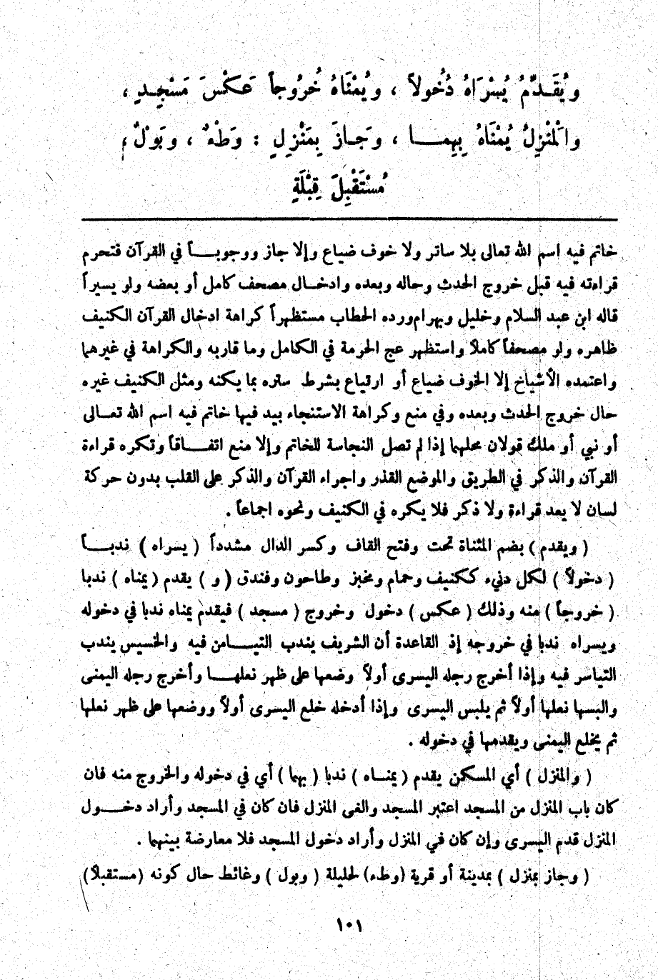 ـــــــــــــــــــــــــــــQخَاتَمٍ فِيهِ اسْمُ اللَّهِ تَعَالَى بِلَا سَاتِرٍ وَلَا خَوْفِ ضَيَاعٍ إلَّا جَازَ وَوُجُوبًا فِي الْقُرْآنِ فَتَحْرُمُ قِرَاءَتُهُ فِيهِ قَبْلَ خُرُوجِ الْحَدَثِ وَحَالَهُ وَبَعْدَهُ وَإِدْخَالُ مُصْحَفٍ كَامِلٍ أَوْ بَعْضُهُ وَلَوْ يَسِيرًا قَالَهُ ابْنُ عَبْدِ السَّلَامِ وَخَلِيلٌ وَبَهْرَامُ وَرَدَّهُ الْحَطَّابُ مُسْتَظْهِرًا كَرَاهَةَ إدْخَالِ الْقُرْآنِ الْكَنِيفَ ظَاهِرُهُ وَلَوْ مُصْحَفًا كَامِلًا وَاسْتَظْهَرَ عج الْحُرْمَةَ فِي الْكَامِلِ وَمَا قَارَبَهُ وَالْكَرَاهَةَ فِي غَيْرِهِمَا وَاعْتَمَدَهُ الْأَشْيَاخُ إلَّا لِخَوْفِ ضَيَاعٍ أَوْ ارْتِيَاعٍ بِشَرْطِ سَتْرِهِ بِمَا يُكِنُّهُ وَمِثْلُ الْكَنِيفِ غَيْرُهُ حَالَ خُرُوجِ الْحَدَثِ وَبَعْدَهُ وَفِي مَنْعِ كَرَاهَةِ الِاسْتِنْجَاءِ بِيَدٍ فِيهَا خَاتِمٌ فِيهِ اسْمُ اللَّهِ تَعَالَى أَوْ نَبِيٌّ أَوْ مَلَكَ قَوْلَانِ مَحَلُّهُمَا إذَا لَمْ تَصِلْ النَّجَاسَةُ لِلْخَاتَمِ وَإِلَّا مُنِعَ اتِّفَاقًا، وَتُكْرَهُ قِرَاءَةُ الْقُرْآنِ وَالذِّكْرُ فِي الطَّرِيقِ وَالْمَوْضِعِ الْقَذِرِ وَإِجْرَاءُ الْقُرْآنِ وَالذِّكْرُ عَلَى الْقَلْبِ بِدُونِ حَرَكَةِ لِسَانٍ لَا يُعَدُّ قِرَاءَةً وَلَا ذِكْرًا فَلَا يُكْرَهُ فِي الْكَنِيفِ وَنَحْوِهِ إجْمَاعًا.
