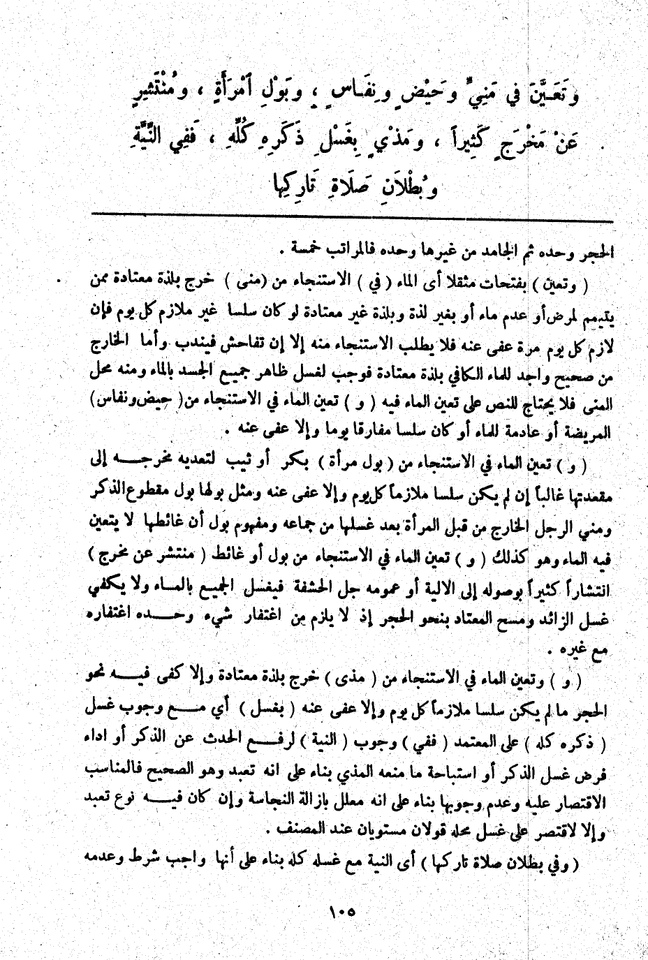 وَتَعَيَّنَ فِي مَنِيٍّ وَحَيْضٍ وَنِفَاسٍ، وَبَوْلِ امْرَأَةٍ، وَمُنْتَشِرٍ عَنْ مَخْرَجٍ كَثِيرًا