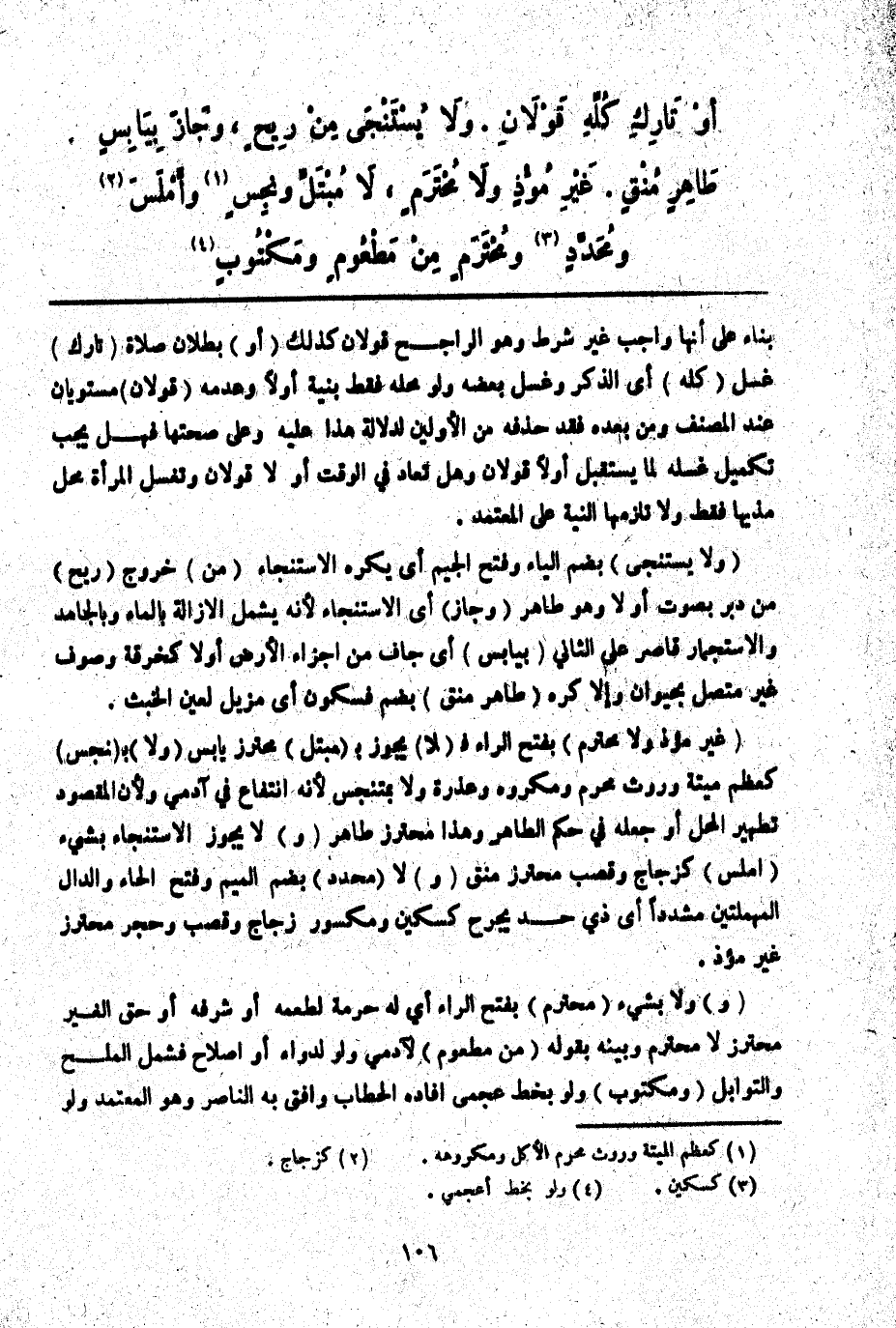 (غَيْرِ مُؤْذٍ وَلَا مُحْتَرَمٍ) بِفَتْحِ الرَّاءِ فَ (لَا) يَجُوزُ بِ (مُبْتَلٍّ) مُحْتَرِزُ يَابِسٍ (وَلَا) بِ (نَجَسٍ) كَعَظْمِ مَيْتَةٍ وَرَوْثِ مُحَرَّمٍ وَمَكْرُوهٍ وَعَذِرَةٍ وَلَا بِمُتَنَجِّسٍ لِأَنَّهُ انْتِفَاعٌ فِي آدَمِيٍّ وَلِأَنَّ الْمَقْصُودَ تَطْهِيرُ الْمَحَلِّ أَوْ جَعْلُهُ فِي حُكْمِ الطَّاهِرِ وَهَذَا مُحْتَرَزُ طَاهِرٍ (وَ) لَا يَجُوزُ الِاسْتِنْجَاءُ بِشَيْءٍ (أَمْلَسَ) كَزُجَاجٍ وَقَصَبٍ مُحْتَرَزُ مُنْقٍ (وَ) لَا (مُحَدَّدٍ) بِضَمِّ الْمِيمِ وَفَتْحِ الْحَاءِ وَالدَّالِ الْمُهْمَلَتَيْنِ مُشَدَّدًا أَيْ ذِي حَدٍّ يَجْرَحُ كَسِكِّينٍ وَمَكْسُورِ زُجَاجٍ وَقَصَبٍ وَحَجَرٍ مُحْتَرَزُ غَيْرِ مُؤْذٍ. (وَ) وَلَا بِشَيْءٍ (مُحْتَرَمٍ) بِفَتْحِ الرَّاءِ أَيْ لَهُ حُرْمَةٌ لِطَعْمِهِ أَوْ شَرَفِهِ أَوْ حَقِّ الْغَيْرِ مُحْتَرَزُ لَا مُحْتَرَمٍ وَبَيَّنَهُ بِقَوْلِهِ (مِنْ مَطْعُومٍ) لِآدَمِيٍّ وَلَوْ لِدَوَاءٍ أَوْ إصْلَاحٍ فَشَمِلَ الْمِلْحَ وَالتَّوَابِلَ (وَمَكْتُوبٍ) وَلَوْ بِخَطٍّ أَعْجَمِيٍّ أَفَادَهُ الْحَطَّابُ وَأَفْتَى بِهِ النَّاصِرُ وَهُوَ الْمُعْتَمَدُ وَلَوْ