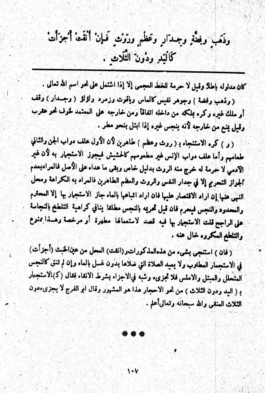 (وَ) كُرِهَ الِاسْتِنْجَاءُ بِ (رَوْثٍ وَعَظْمٍ) طَاهِرَيْنِ لِأَنَّ الْأَوَّلَ عَلَفُ دَوَابِّ الْجِنِّ وَالثَّانِيَ طَعَامُهُمْ وَأَمَّا عَلَفُ دَوَابِّ الْإِنْسِ غَيْرُ مَطْعُومِهِمْ كَالْحَشِيشِ فَيَجُوزُ الِاسْتِجْمَارُ بِهِ لِأَنَّ غَيْرَ الْآدَمِيِّ لَا حُرْمَةَ لَهُ خَرَجَ مِنْهُ الرَّوْثُ بِدَلِيلٍ خَاصٍّ وَبَقِيَ مَا عَدَاهُ عَلَى الْأَصْلِ فَالْمُرَادُ بِعَدَمِ الْجَوَازِ التَّحْرِيمُ إلَّا فِي جِدَارِ النَّفْسِ وَالرَّوْثِ وَالْعَظْمِ الطَّاهِرَيْنِ فَالْمُرَادُ بِهِ الْكَرَاهَةُ وَمَحَلُّ النَّهْيِ عَنْهَا إنْ أَرَادَ الِاقْتِصَارَ عَلَيْهَا فَإِنْ أَرَادَ اتِّبَاعَهَا بِالْمَاءِ جَازَ الِاسْتِجْمَارُ بِهَا إلَّا الْمُحْتَرَمَ وَالْمَحْدُودَ وَالنَّجِسَ فَيَحْرُمُ فَإِنْ قِيلَ تَحْرِيمُهُ بِالنَّجَسِ مُطْلَقًا يُنَافِي كَرَاهِيَةَ التَّلَطُّخِ بِالنَّجَاسَةِ عَلَى الرَّاجِحِ قُلْت الِاسْتِجْمَارُ بِهَا فِيهِ قَصْدٌ لِاسْتِعْمَالِهَا مَطْهَرَةً أَوْ مُرَخَّصَةً وَهَذَا مَمْنُوعٌ وَالتَّلَطُّخُ الْمَكْرُوهُ خَالٍ عَنْهُ.