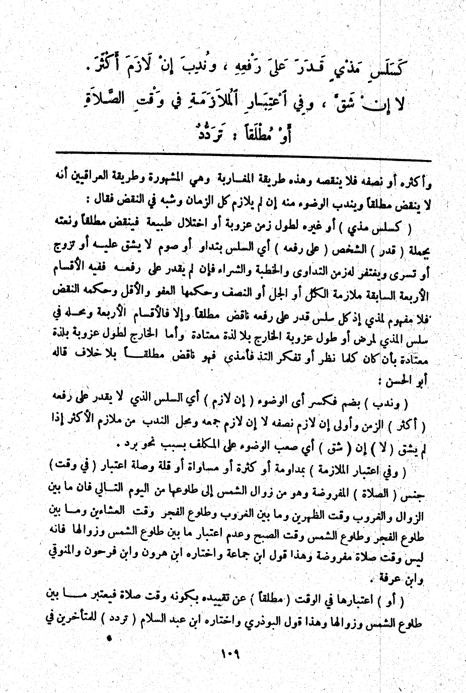 (كَسَلَسِ مَذْيٍ) أَوْ غَيَّرَهُ لِطُولِ زَمَنِ عُزُوبَةٍ أَوْ اخْتِلَالِ طَبِيعَةٍ فَيُنْقَضُ مُطْلَقًا وَنَعَتَهُ بِجُمْلَةِ (قَدَرَ) الشَّخْصُ (عَلَى رَفْعِهِ) أَيْ السَّلَسِ بِتَدَاوٍ أَوْ صَوْمٍ لَا يَشُقُّ عَلَيْهِ أَوْ تَزَوَّجَ أَوْ تَسَرَّى وَيُغْتَفَرُ لَهُ زَمَنُ التَّدَاوِي وَالْخُطْبَةِ وَالشِّرَاءِ فَإِنْ لَمْ يَقْدِرْ عَلَى رَفْعِهِ فَفِيهِ الْأَقْسَامُ الْأَرْبَعَةُ السَّابِقَةُ مُلَازَمَةً الْكُلَّ أَوْ الْجُلَّ أَوْ النِّصْفَ وَحُكْمُهَا الْعَفْوُ وَالْأَقَلَّ وَحُكْمُهُ النَّقْضُ فَلَا مَفْهُومَ لِمَذْيٍ إذْ كُلُّ سَلَسٍ قُدِرَ عَلَى رَفْعِهِ نَاقِضٌ مُطْلَقًا وَإِلَّا فَالْأَقْسَامُ الْأَرْبَعَةُ وَمَحَلُّهُ فِي سَلَسِ الْمَذْيِ لِمَرَضٍ أَوْ طُولِ عُزُوبَةٍ الْخَارِجِ بِلَا لَذَّةٍ مُعْتَادَةٍ وَأَمَّا الْخَارِجُ لِطُولِ عُزُوبَةٍ بِلَذَّةٍ مُعْتَادَةٍ بِأَنْ كَانَ كُلَّمَا نَظَرَ أَوْ تَفَكَّرَ الْتَذَّ فَأَمْذَى فَهُوَ نَاقِضٌ مُطْلَقًا بِلَا خِلَافٍ قَالَهُ أَبُو الْحَسَنِ: