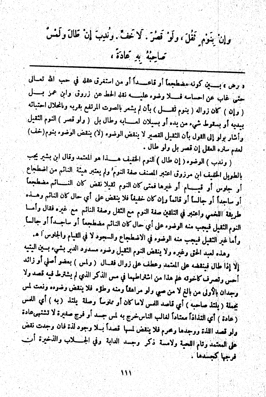 ـــــــــــــــــــــــــــــQ- رَضِيَ اللَّهُ عَنْهُ - " بَيْنَ كَوْنِهِ مُضْطَجِعًا أَوْ قَاعِدًا أَوْ مَنْ اسْتَغْرَقَ عَقْلُهُ فِي حُبِّ اللَّهِ تَعَالَى حَتَّى غَابَ عَنْ إحْسَاسِهِ فَلَا وُضُوءَ عَلَيْهِ نَقَلَهُ الْحَطُّ عَنْ زَرُّوقٍ وَابْنِ عُمَرَ بَلْ